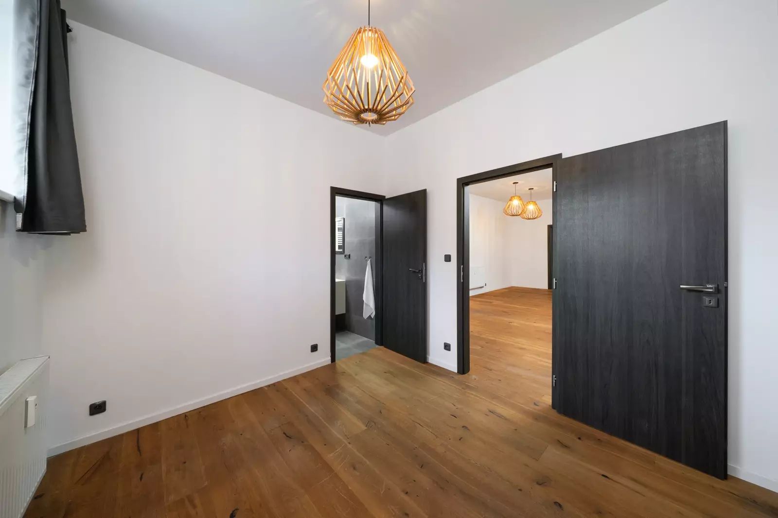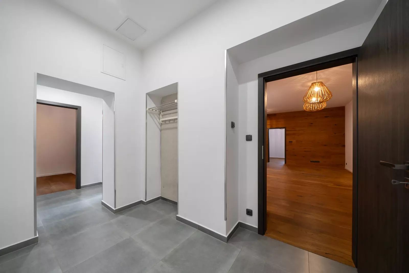 Za vstupními dveřmi je zádveří, ze kterého se vchází do koupelny se sprchovým koutem a toaletou, pokoje a chodby, která dále pokračuje do kuchyně spojené s obývacím pokojem a do dalšího pokoje (ložnice), ke kterému je samostatná plnohodnotná koupelna se sprchovým koutem a oddělenou toaletou. K bytu náleží prostorný sklep a dvě parkovací místa. Byt je po celkové rekonstrukci - nové rozvody elektřiny vč. rozvaděče, rozvody vody i odpadů v plastu, dveřní obložky vč. dveří, nové podlahy (v zádveří, chodbě, koupelnách položena dlažba, v obytných místnostech kvalitní dřevěná podlaha). Součástí bytu je moderní kuchyňská linka vč. vestavěných spotřebičů (varná deska, el. trouba, myčka, vestavěná lednice s mrazákem). Okna jsou plastová s trojskly a směrují na severovýchod a jihovýchod. Součástí společných prostor domu je sušárna/kolárna. Za domem je k dispozici zázemí pro posezení / relaxaci.