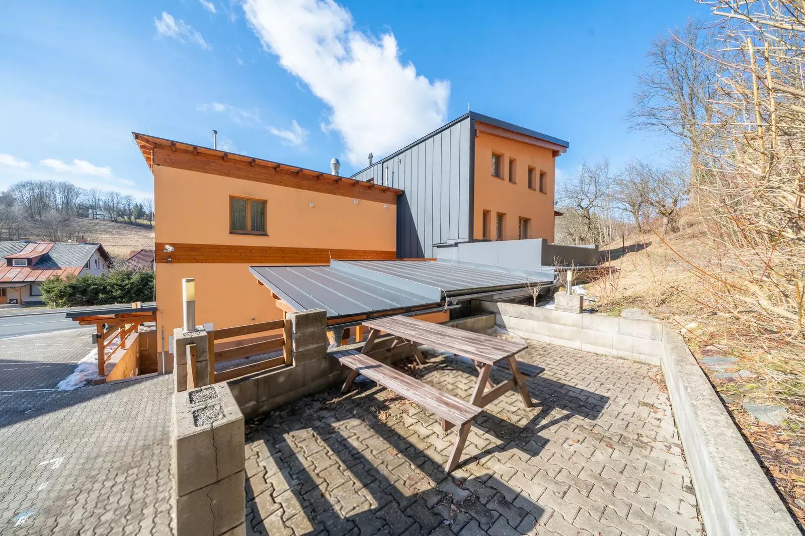 Bytový dům je napojen na městský vodovod, elektřinu, plyn a kanalizaci. Vytápění je zajištěno plynovým kotlem pro celý bytový dům a částečně samostatným plynovým kotlem, topná tělesa jsou kombinací radiátorů a podlahového vytápění (zádveří, chodba). Ohřev TUV stejnou topnou soustavou. Bytový dům je zateplen, PENB uvádí třídu D. Příjezdová komunikace je asfaltová, celoročně udržovaná, parkování je k dispozici u domu pro dva automobily (vyhrazené, zahrnuto v prodejní ceně). Rekonstrukce domu byla financována z vlastních zdrojů = SVJ bez úvěru.