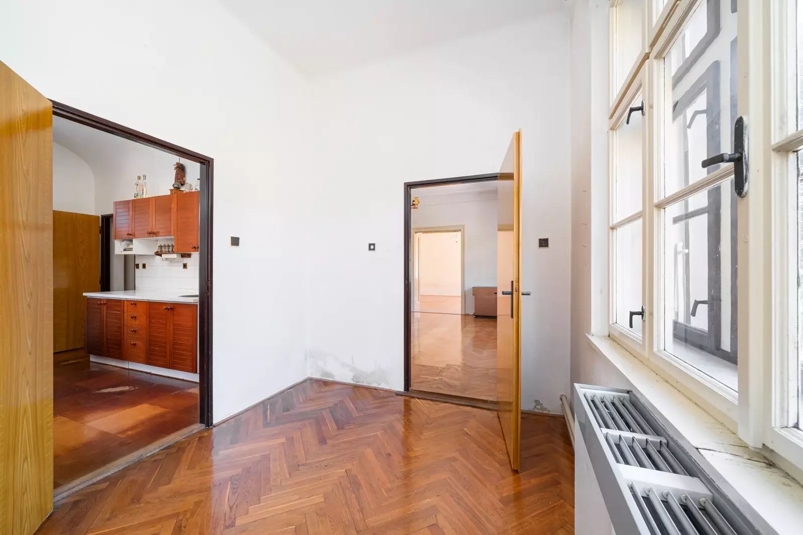Byt je určen k částečné rekonstrukci a nabízí zajímavý, výjimečný půdorys. Dominantou ložnice je krásný polygonální arkýř (prosklený roh místnosti), který vytváří světlý a vzdušný okenní kout. Díky velkým oknům sem proudí dostatek denního světla a vzniká zde ideální prostor pro relaxační křeslo, čtecí zónu či pracovní stolek.