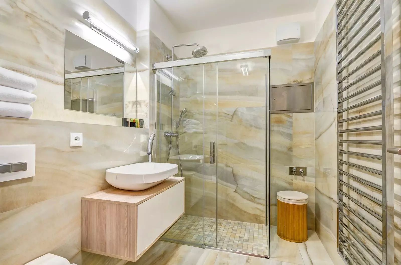 Interiér bytu je rozdělen do tří pokojů a dvou koupelen s wc. Byt lze jednoduchou stavební úpravou rozdělit na 4+kk. Byt je vybaven luxusními a kvalitními elektrospotřebiči značky Miele včetně vestavěné elektrické trouby, indukční desky, lednice, mrazáku, myčky na nádobí a odsavače par. V bytě jsou tři TV a ozvučení značky Bose.