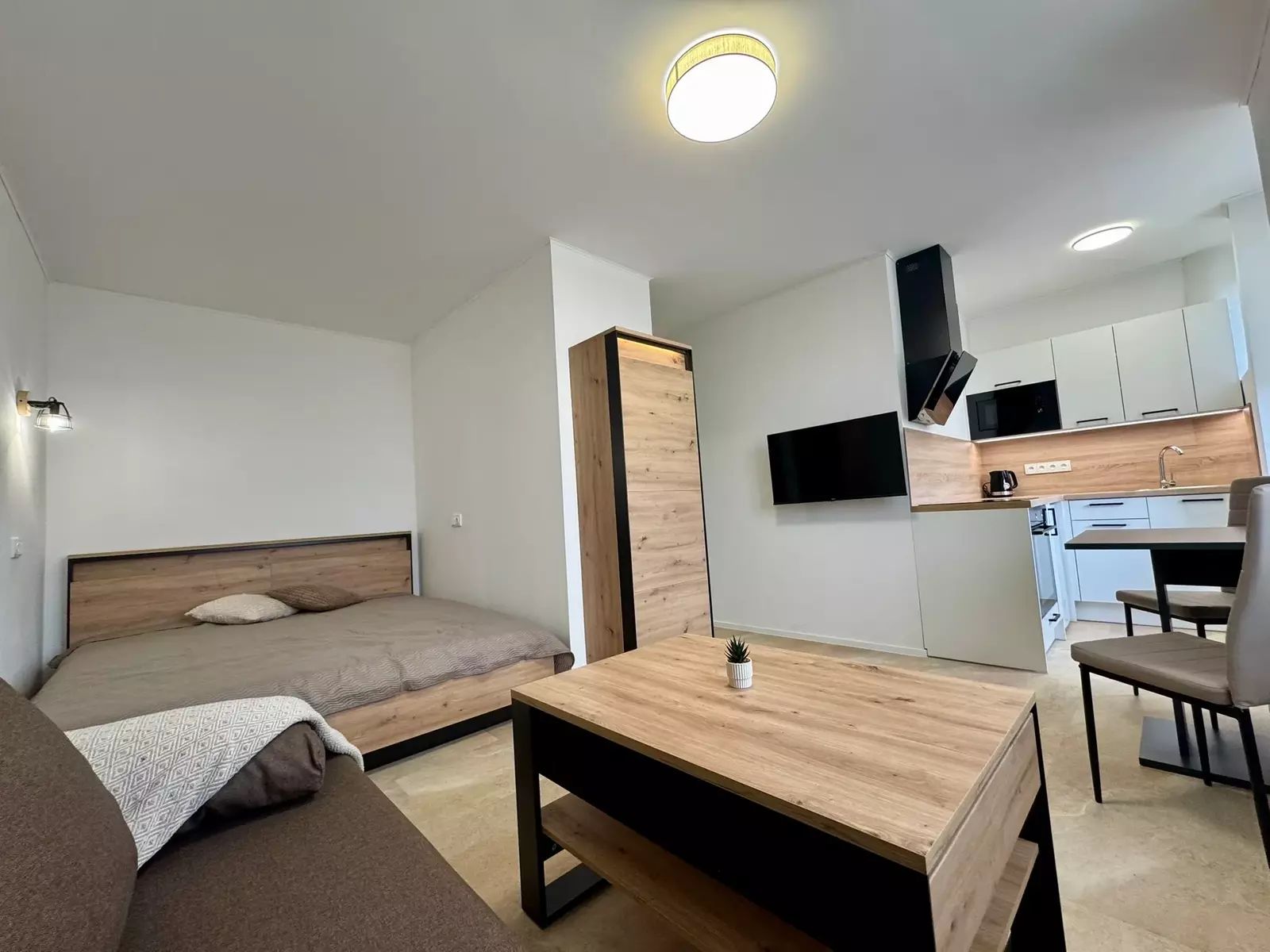 Byt je kompletně zařízený a připraven k okamžitému nastěhování. K dispozici je kuchyňská linka se sporákem a troubou, malá lednice, vestavěná skříň, jídelní stolek se židlemi, rozkládací gauč a postel s úložným prostorem. Součástí vybavení je také pračka. V koupelně se nachází moderní toaleta s ovládacím panelem.