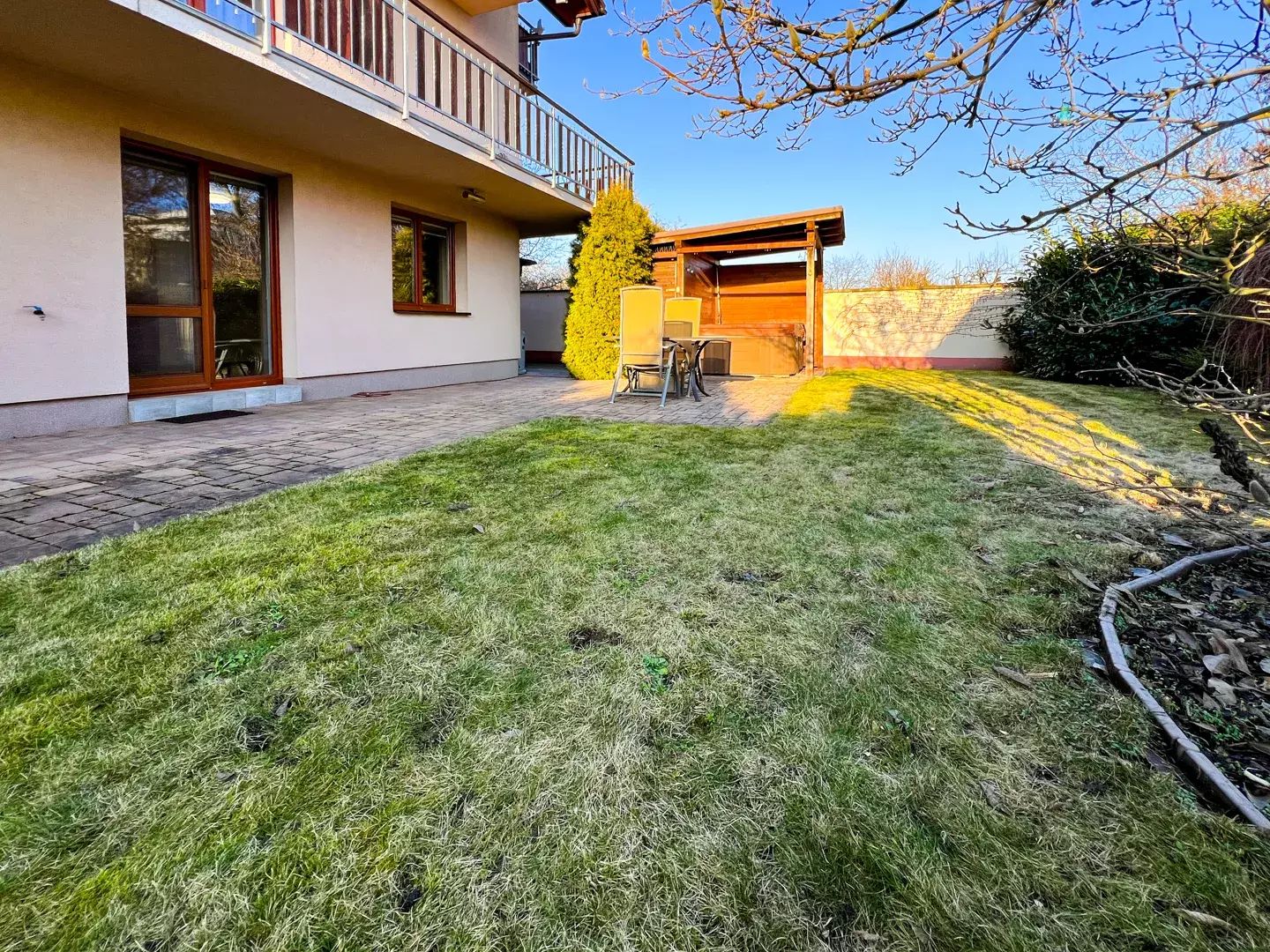 Velkým bonusem je bezesporu zahrada propojená s terasou, která poskytuje prostor pro odpočinek na čerstvém vzduchu. Vstup na terasu je z obývacího pokoje. Zahrada nabízí dostatek klidu a soukromí.