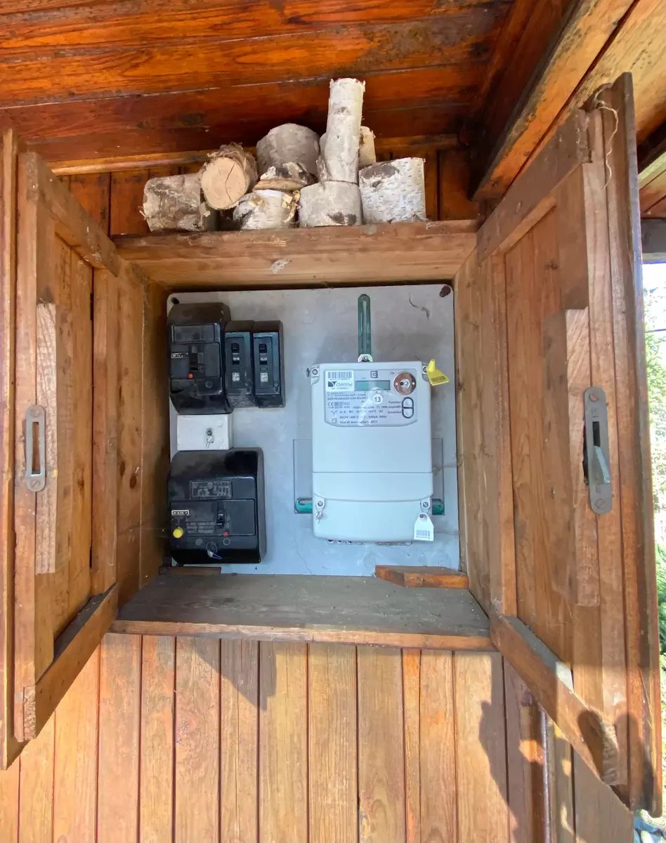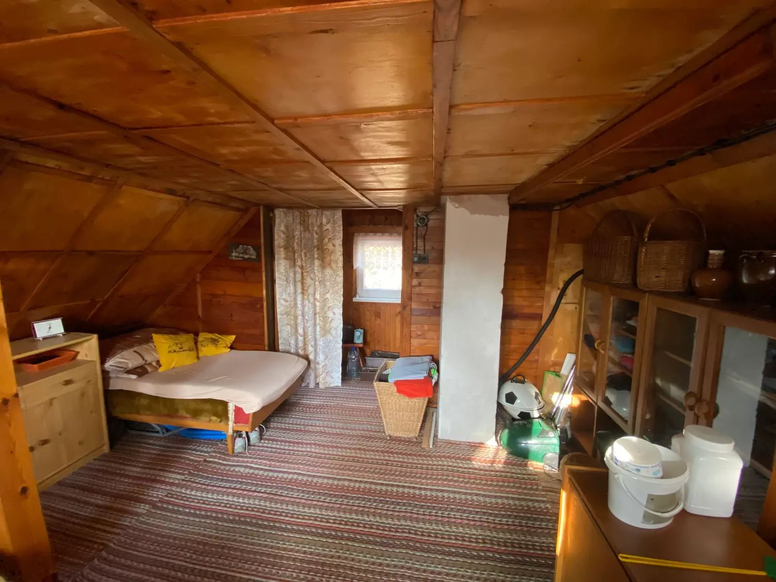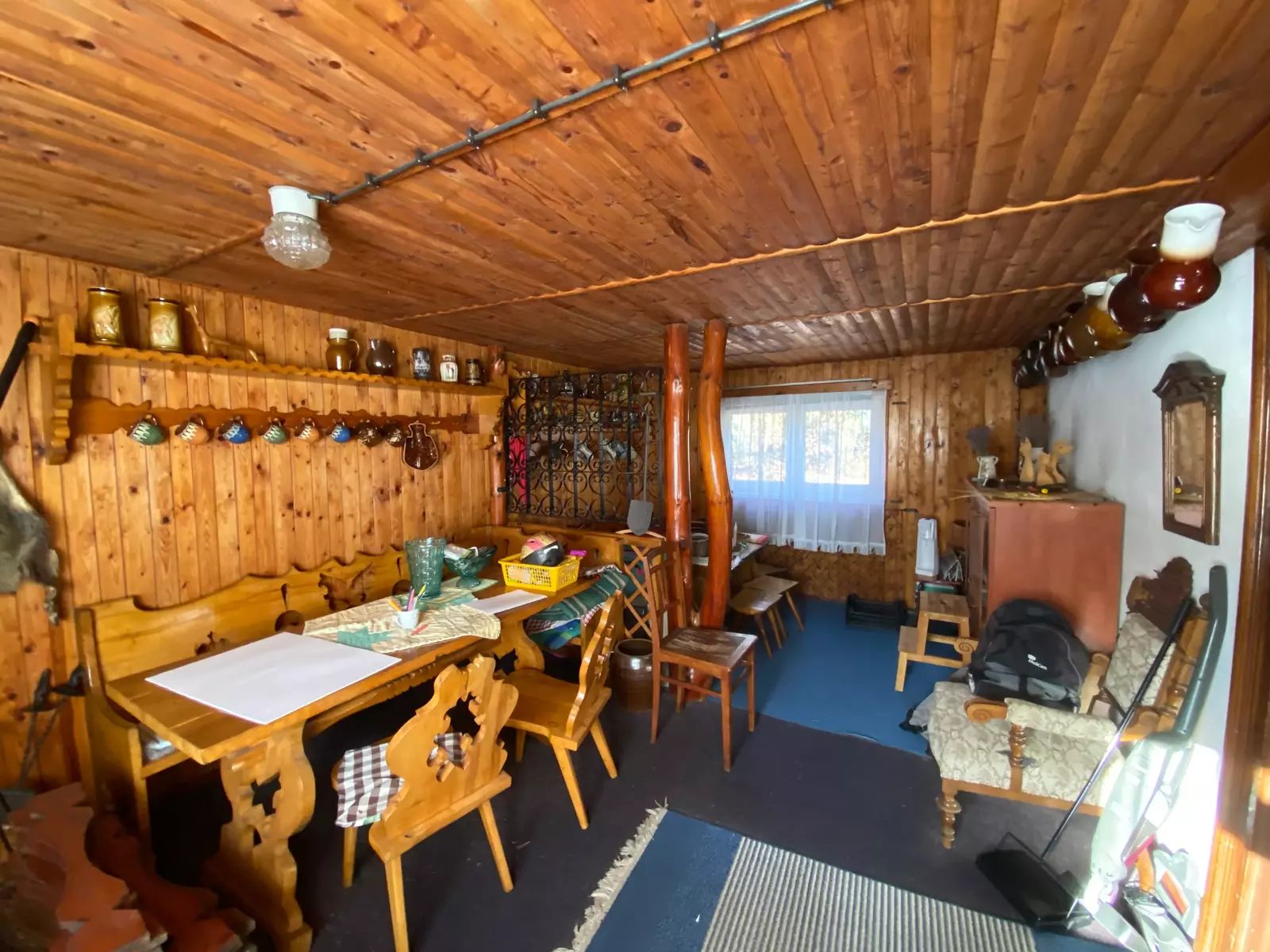 V její spodní části, se samotným vstupem je suterén chaty, je využívaný jako sklepní část pro uložení potřebných věcí, nářadí aj. Dále WC s umyvadlem a vodní čerpadlo obsluhující venkovní vlastní studnu o hloubce vrtu až 84m, vnitřní rozvod vody pro WC s umyvadlem až do kuchyně. V 1. vyvýšeném NP je po pár kamenných schodech samotný vstup do obytné části chaty, rozdělené na dvě části. Levá část je užívaná jako obývací pokoj, pro relaxaci, posezení, zábavu s částečným vybavením. Její pravá část je kuchyně s kuchyňskou linkou, kamna - sporák na propan butan, lednice, krbová kamna a v zadní části místnosti, vstup do podkroví. V podkroví chaty se nachází větší místnost užívaná jako ložnice s otevřeným balkónem směrem na jižní stranu. Vedle ložnice jsou dva menší samostatné uzavřené prostory vhodné pro uložení věcí, oblečení atd. s možným výstupem na zbývající půdní část chaty.