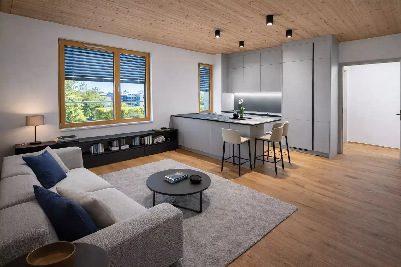 Byt je navržen s důrazem na kvalitu materiálů, komfort a nadčasový design. Samozřejmostí jsou dřevěné podlahy, vyšší interiérové dveře, francouzská dřevěná okna s trojskly a lakovaná kuchyňská linka s kvalitními spotřebiči.