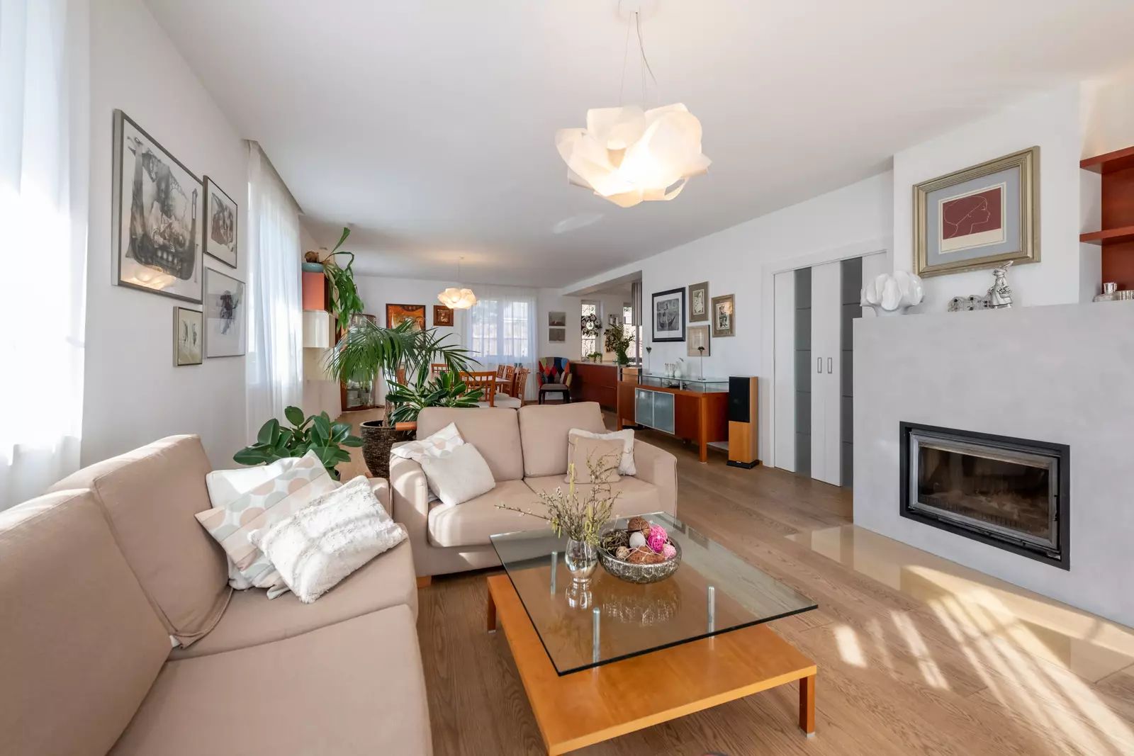 Velkorysý obývací pokoj s krbem a přímým vstupem na krytou terasu (30 m²) – ideální pro letní snídaně i večerní víno