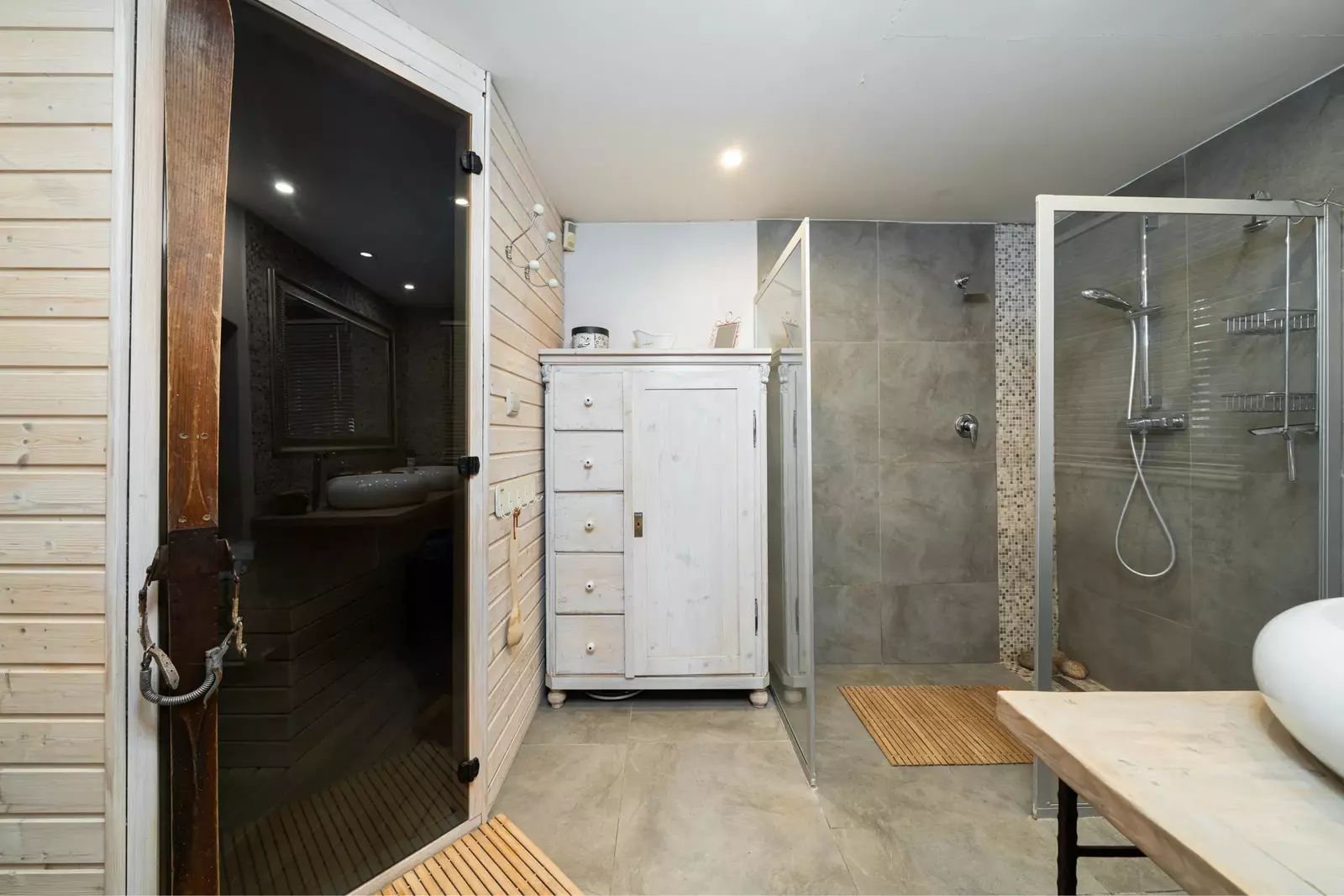 V přízemí domu se nachází vstupní chodba, ze které se vstupuje do prostorné světnice s moderní kuchyňskou linkou a kachlovými kamny, která zajišťují nejen vytápění, ale umožňují i vaření a pečení. Dále je zde koupelna s finskou saunou a toaletou. Praktickým bonusem je také druhá samostatná toaleta s prádelnou a sušárnou a úložný prostor využitelný jako kolárna či lyžárna.