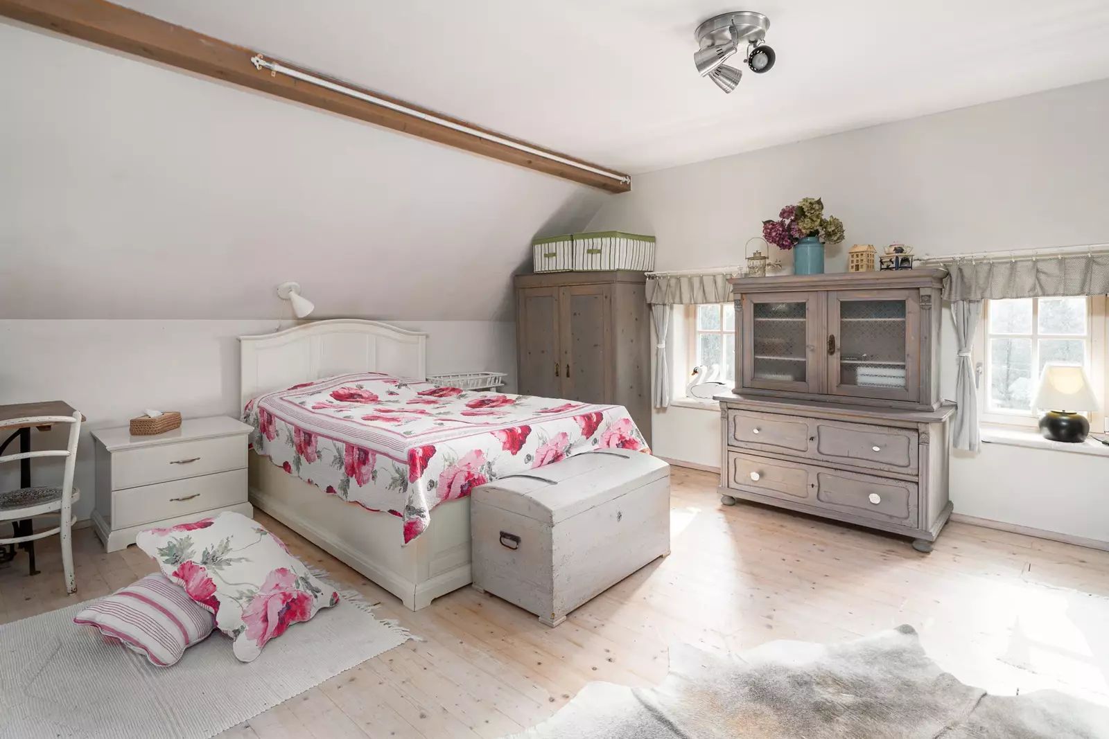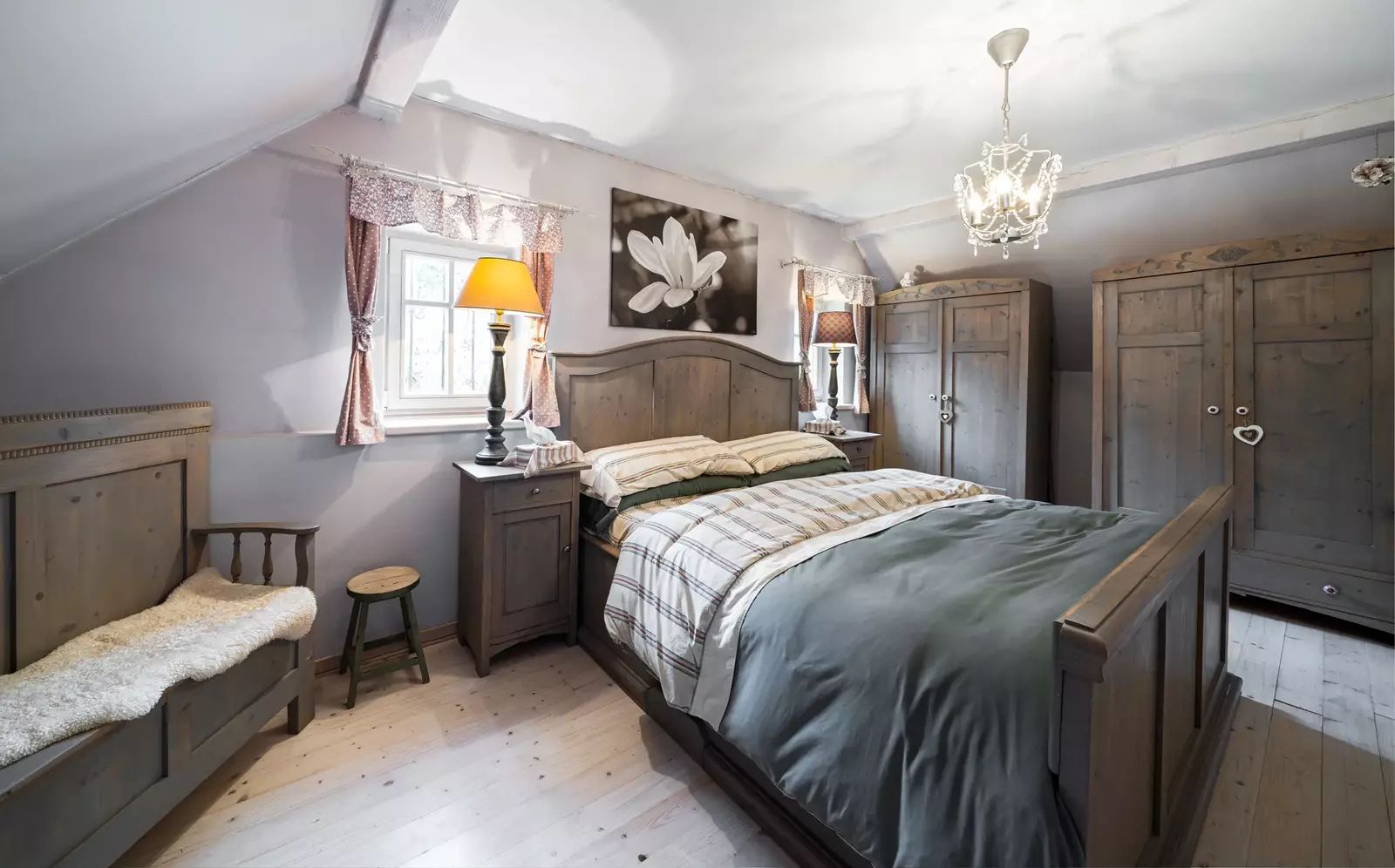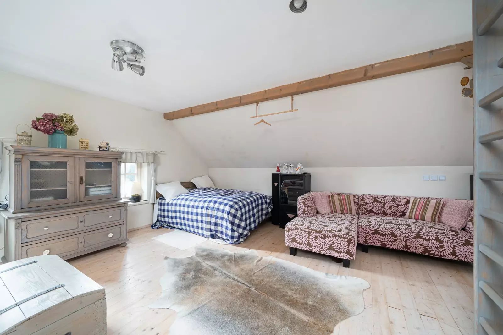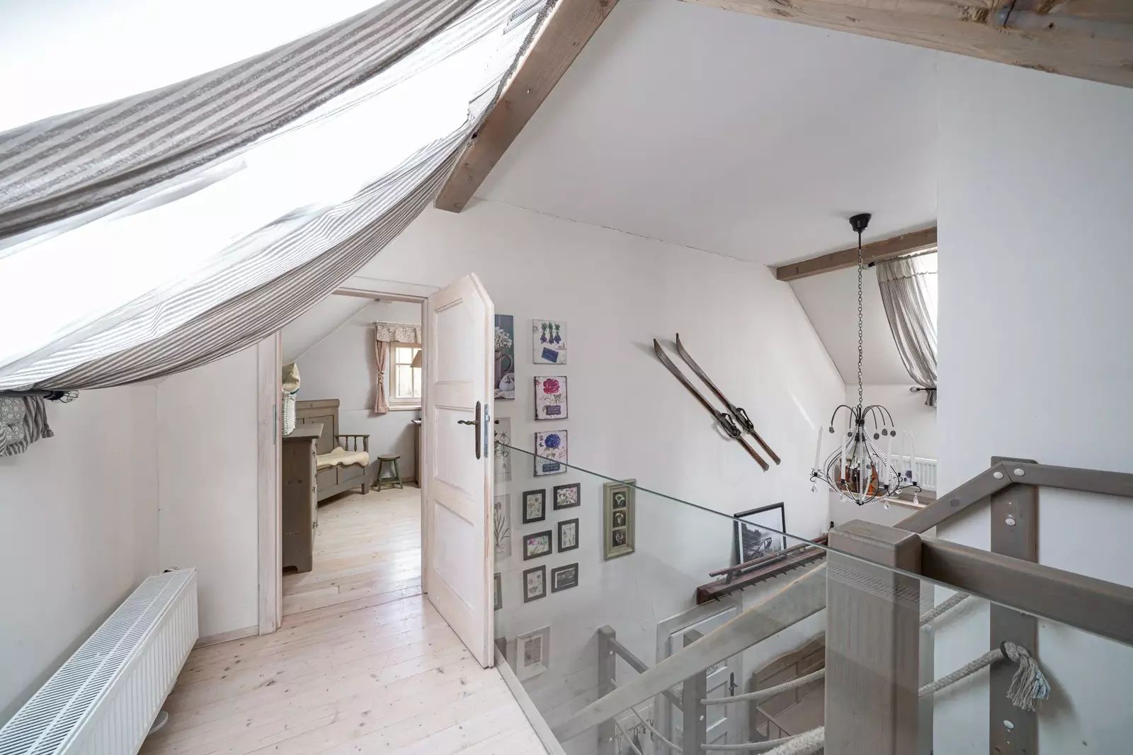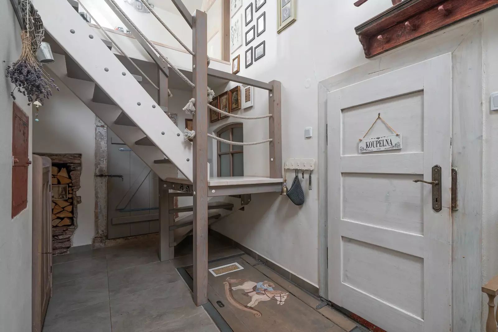 Po dřevěných schodech se dostanete do patra, kde se nachází obytná galerie a samostatná ložnice.