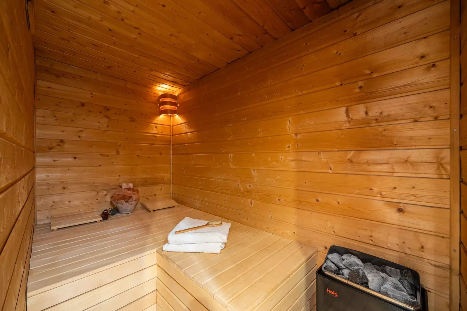 Vytápění je řešeno ústředním teplovodním systémem s elektrokotlem s dálkovou regulací, doplněným podlahovým vytápěním a topnými žebříky.