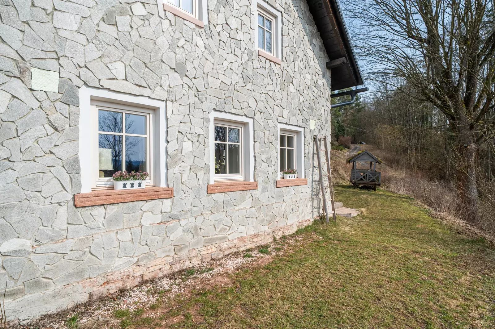 Fasáda domu je tvořena ručně skládaným kamenem dovezeným z Bulharska, což mu dodává naprosto jedinečný charakter. Nemovitost je částečně podsklepená, napojená na obecní vodovod, má novou střechu, nové rozvody instalací a dřevěná okna s dvojskly.