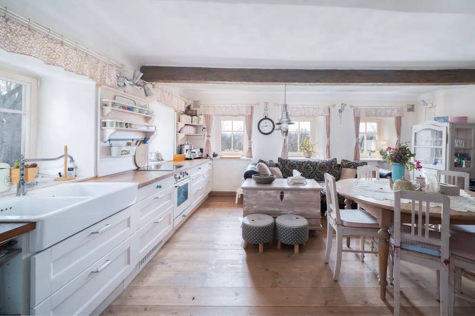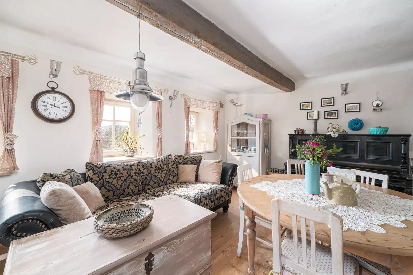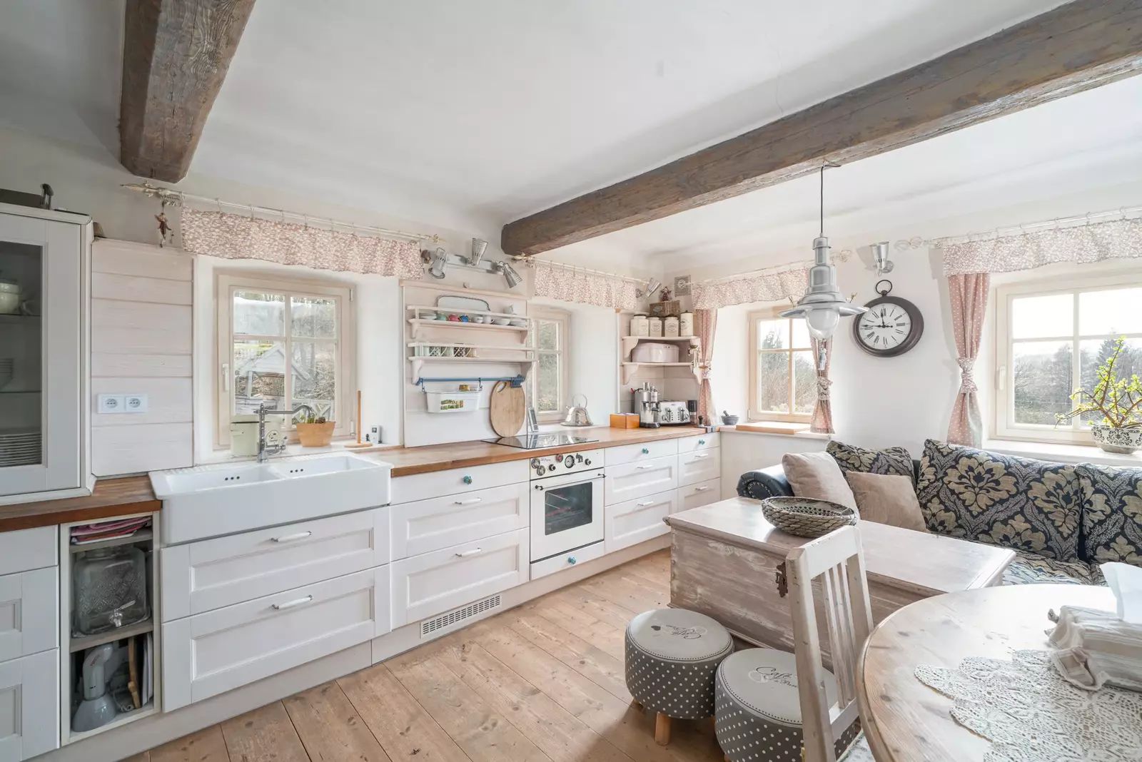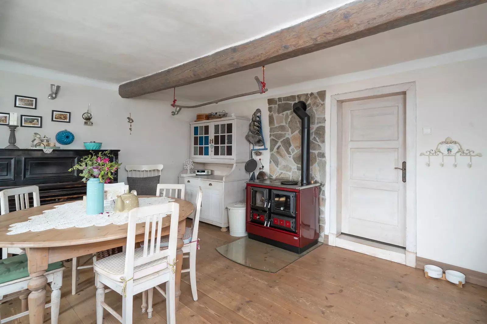 Interiér domu byl citlivě a stylově zrekonstruován s důrazem na zachování původního charakteru. Kombinace dřevěných podlah, nových dřevěných oken, přiznaných trámů a kvalitního masivního nábytku vytváří velmi příjemnou a útulnou atmosféru s vysokým komfortem.
