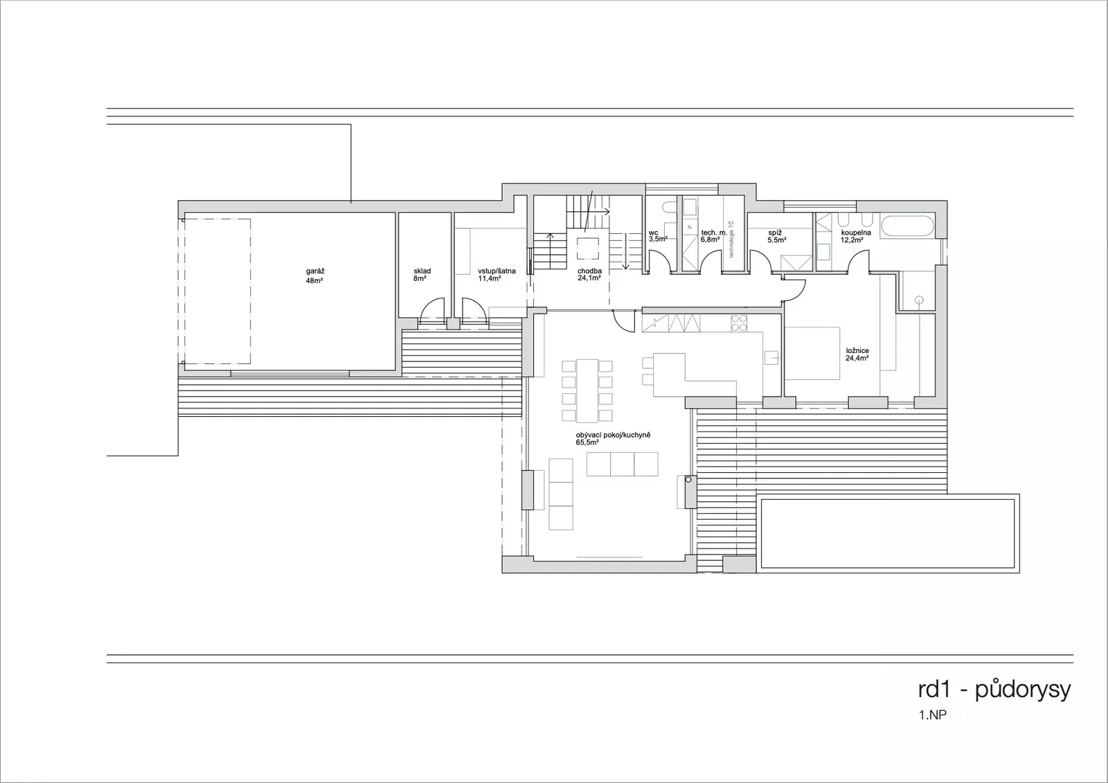 Komplex nabízí unikátní příležitost pro bydlení v nejvyšší možné míře komfortu a soukromí. Vila nabízí vlastní příjezdovou cestu, dvě garážová stání a venkovní parkování. Dále terasu s bazénem a rozlehlou zahradou. Půdorys vily v grafické části inzerátu je pouze orientační, dispozice lze pozměnit.