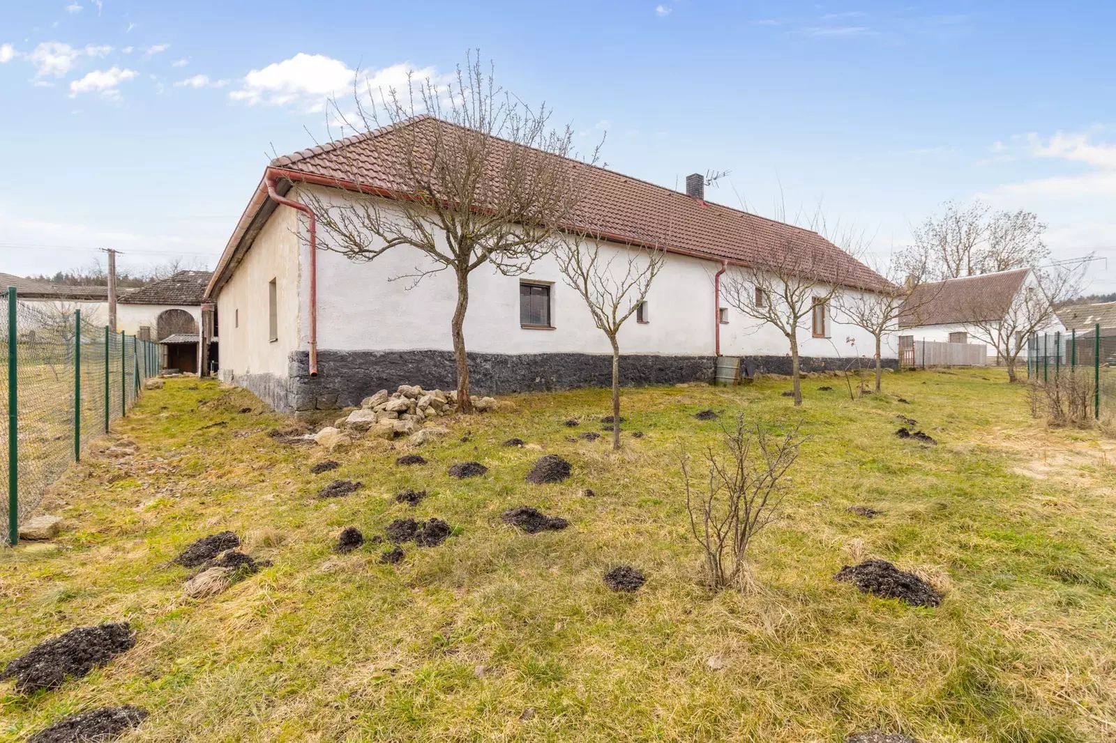 - Oplocená zahrada nabízí místo pro květiny, vlastní zeleninu i sladké jahody, zatímco okolní travnaté plochy vybízejí k odpočinku.