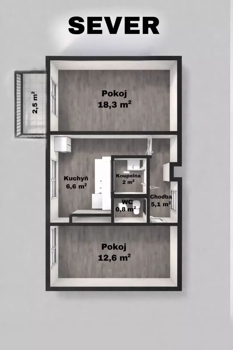 Součástí je balkon o velikosti 2,5 m² s orientací na západ, který poskytuje příjemné místo pro odpočinek. K bytu náleží také zděný sklep o velikosti 3 m².