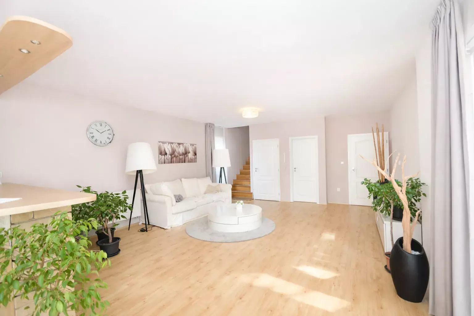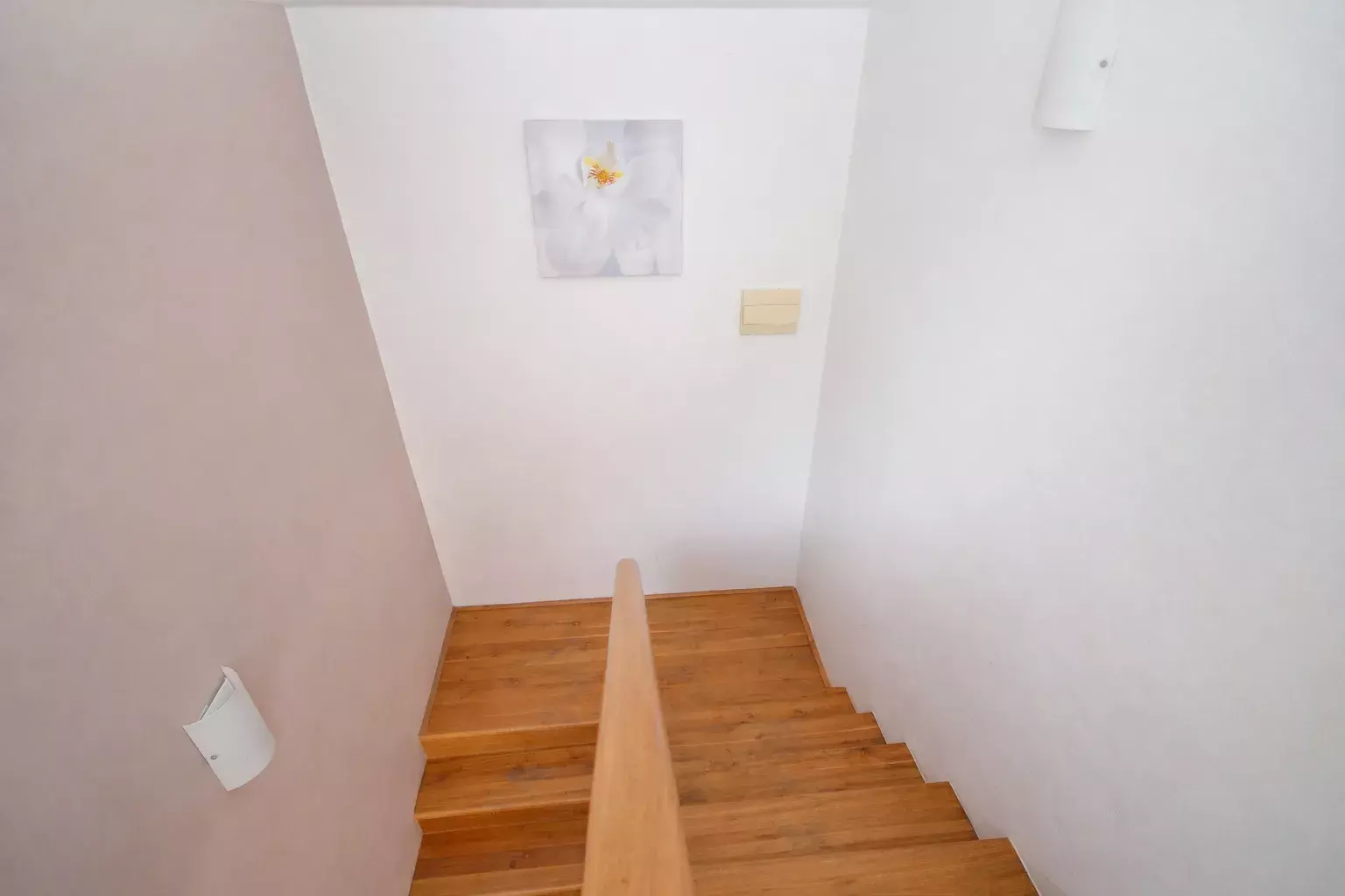 V přízemí je vlastní vstupní předsíň, velkorysý obývací pokoj propojený s kuchyní a jídelnou, kuchyň je kompletně vybavená všemi spotřebiči, dále samostatné WC a výstup na zahradu. V patře se nachází tři ložnice, dvě šatny a koupelna s rohovou vanou a v hlavní ložnici je sprcha.
