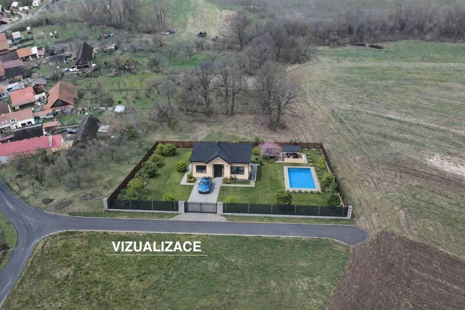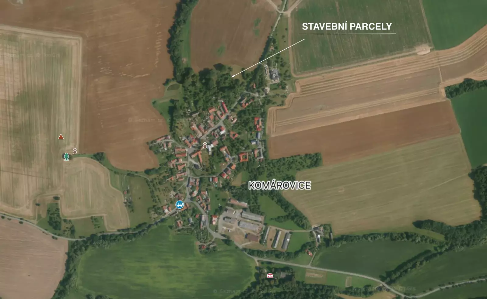 Pozemky jsou na samotném kraji Komárovic, z toho plyne absolutní klid a výhled do krajiny.