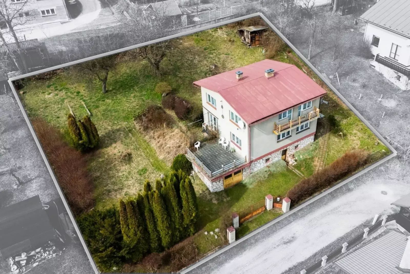 Dům je situován na pozemku o velikosti 1173 m², jehož pečlivě plánované uspořádání zaručuje maximální využití místa. K domu náleží 60 m² nebytových prostor (1.PP - sklep). Celkově tedy stavba poskytuje dostatek místa pro komfortní bydlení, a to s přidaným bonusem rozlehlé obytné a pracovní zóny.
