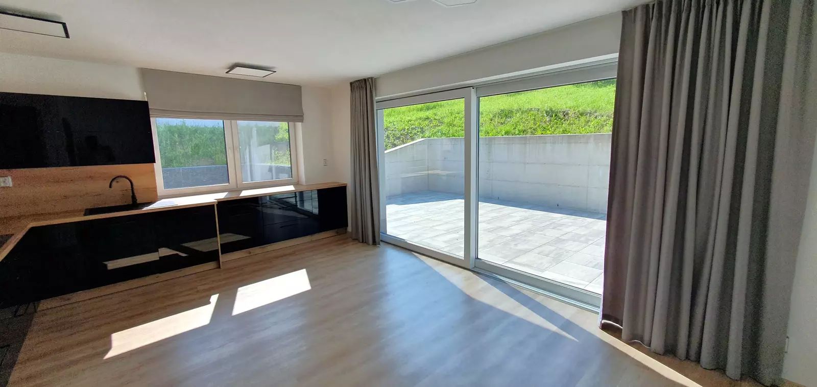 • Přízemí: Vstupní chodba, prostorný obývací pokoj s plně vybaveným kuchyňským koutem a přímým vstupem na slunnou terasu, koupelna se sprchovým koutem a samostatná toaleta.