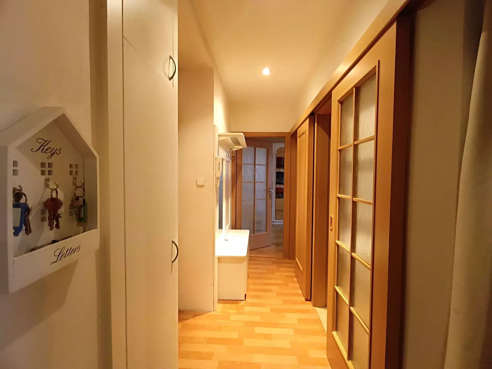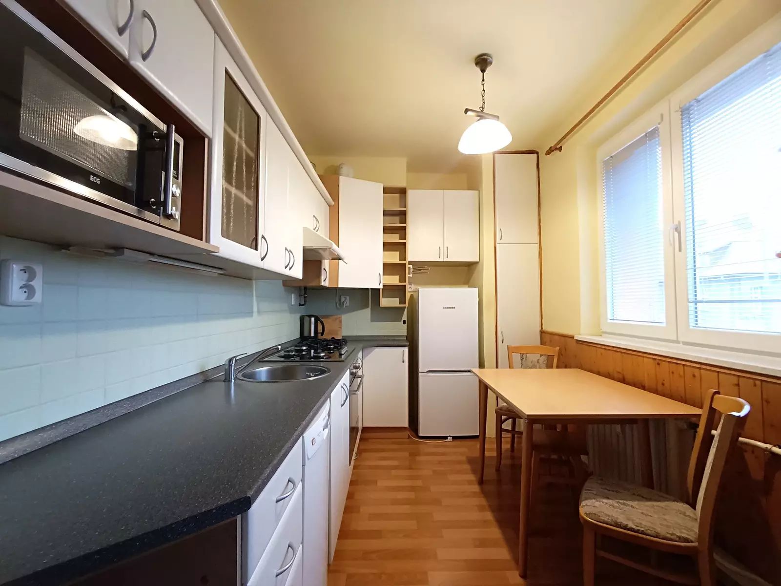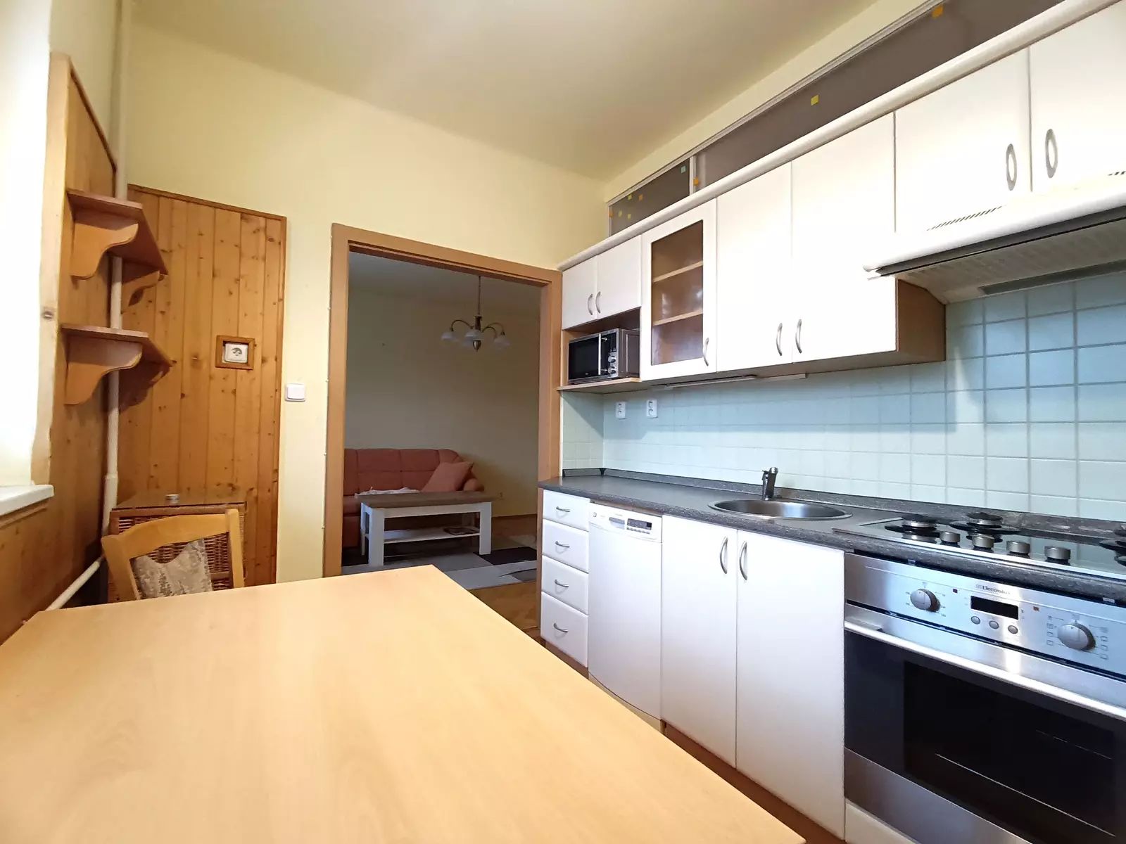Dispozice bytu: ložnice, obývací pokoj, kuchyň, koupelna se sprchovým koutem, samostatná toaleta. K bytu náleží sklepní kóje. Bytová jednotka je nabízena k pronájmu téměř plně vybavená (viz. foto). Kuchyňská linka je rovněž vybavena všemi obvyklými spotřebiči (plynový sporák s troubou, myčka, lednice + mrazák, mikrovlnná trouba). V koupelně je k dispozici zánovní pračka.