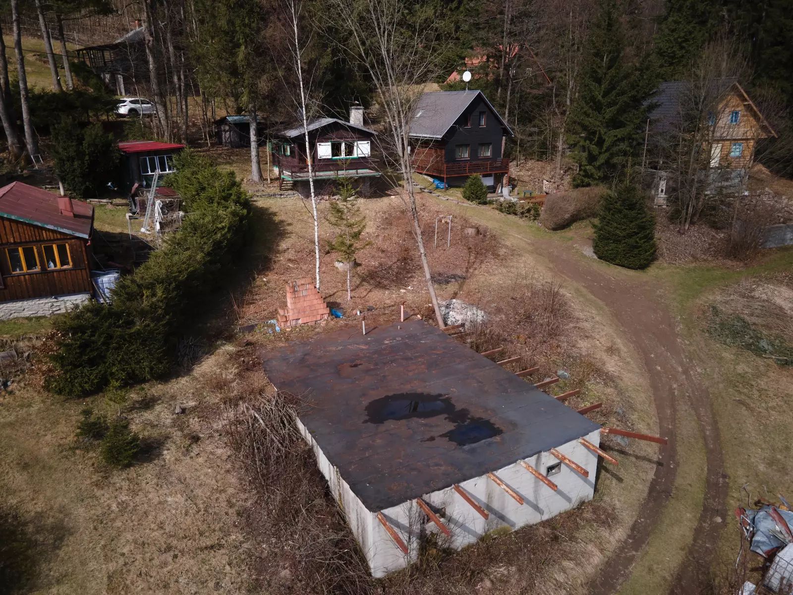 Součástí spodního pozemku je torzo základové desky dříve nepovolené a nechválené stavby původního majitele. Nelze tedy použít na další výstavbu.