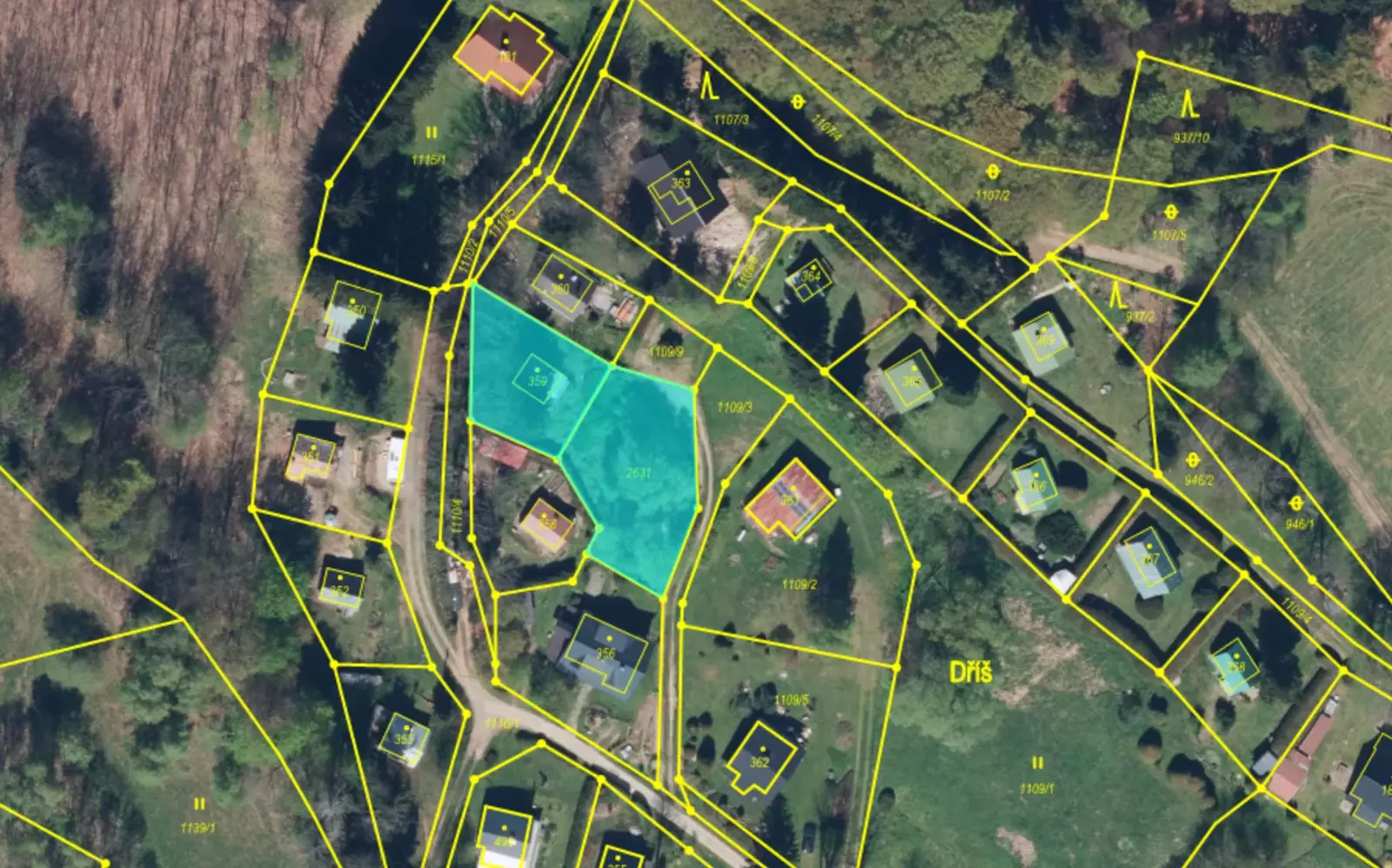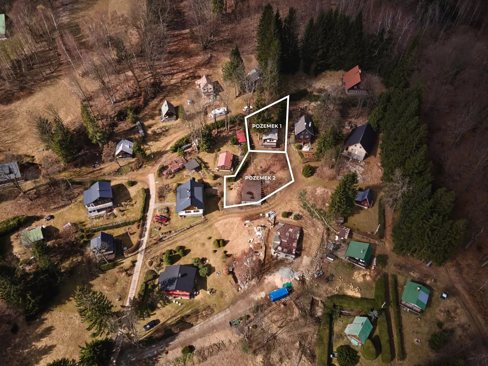 Součástí spodního pozemku je torzo základové desky dříve nepovolené a nechválené stavby původního majitele. Nelze tedy použít na další výstavbu. Tento pozemek může nový majitel použít na výstavbu druhé chalupy, kterou může třeba pronajímat.