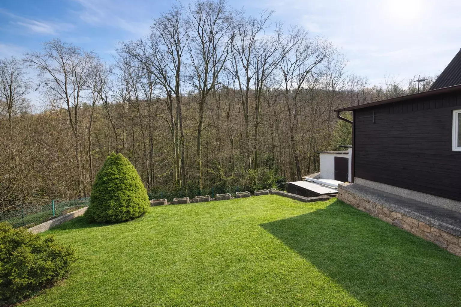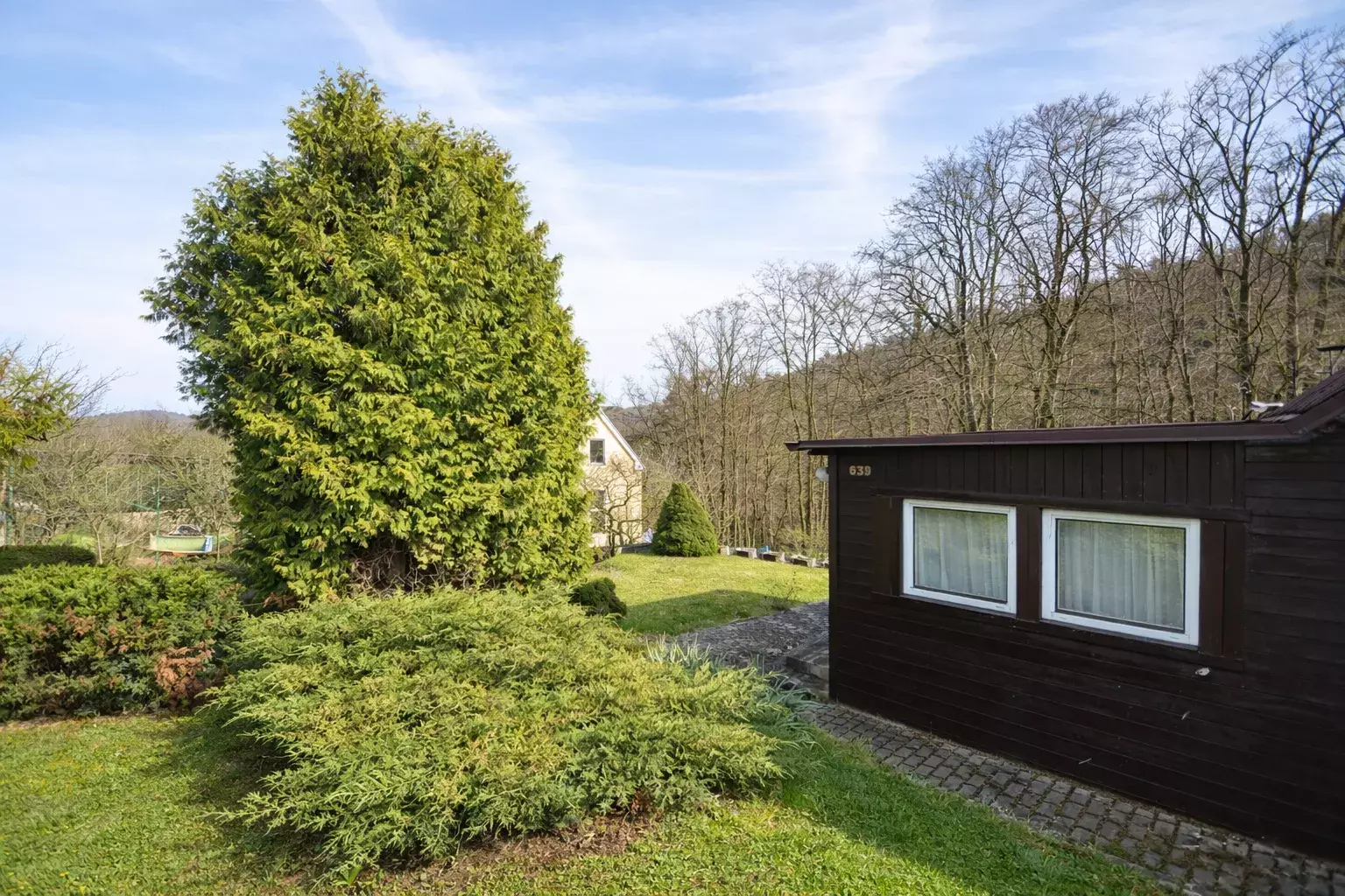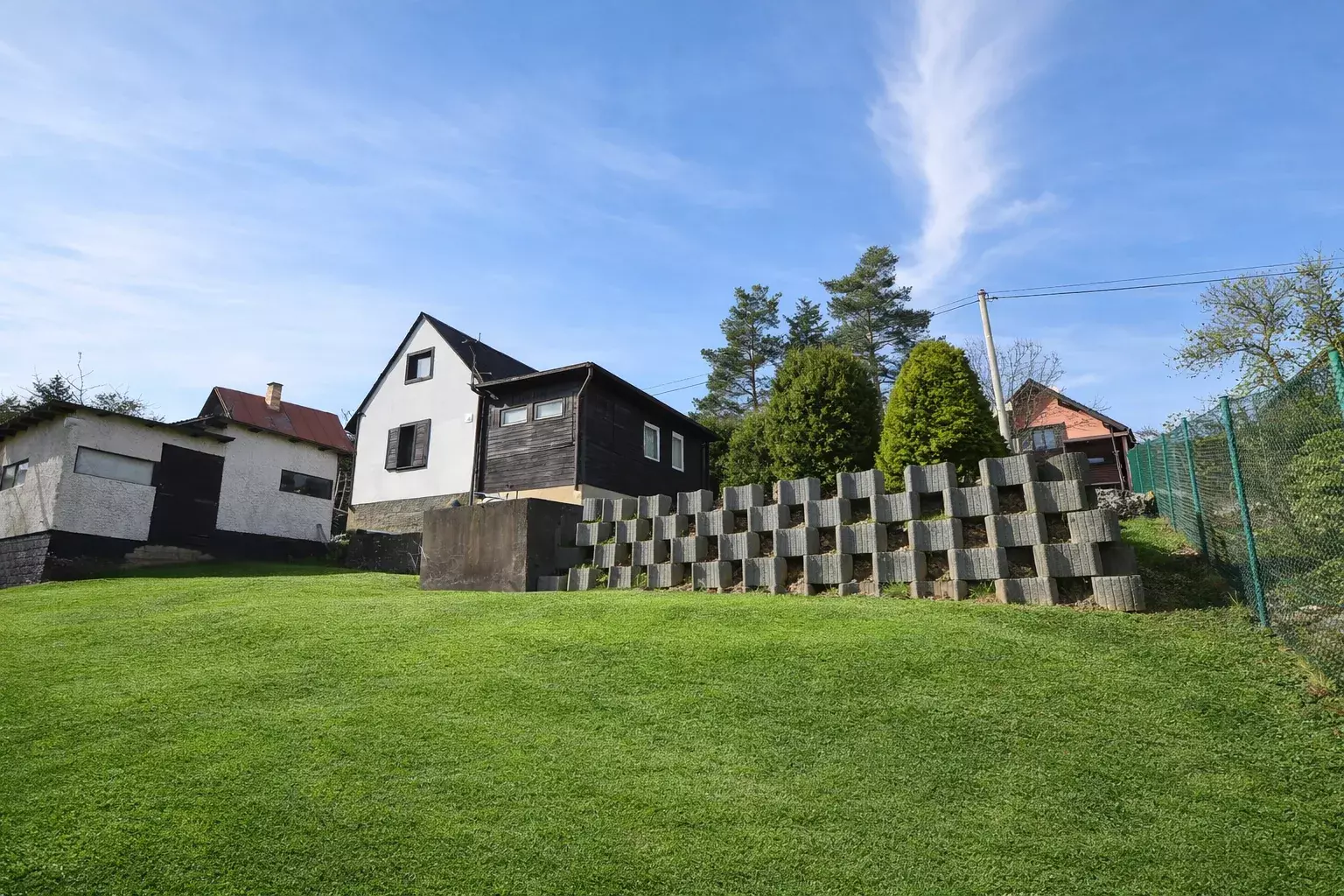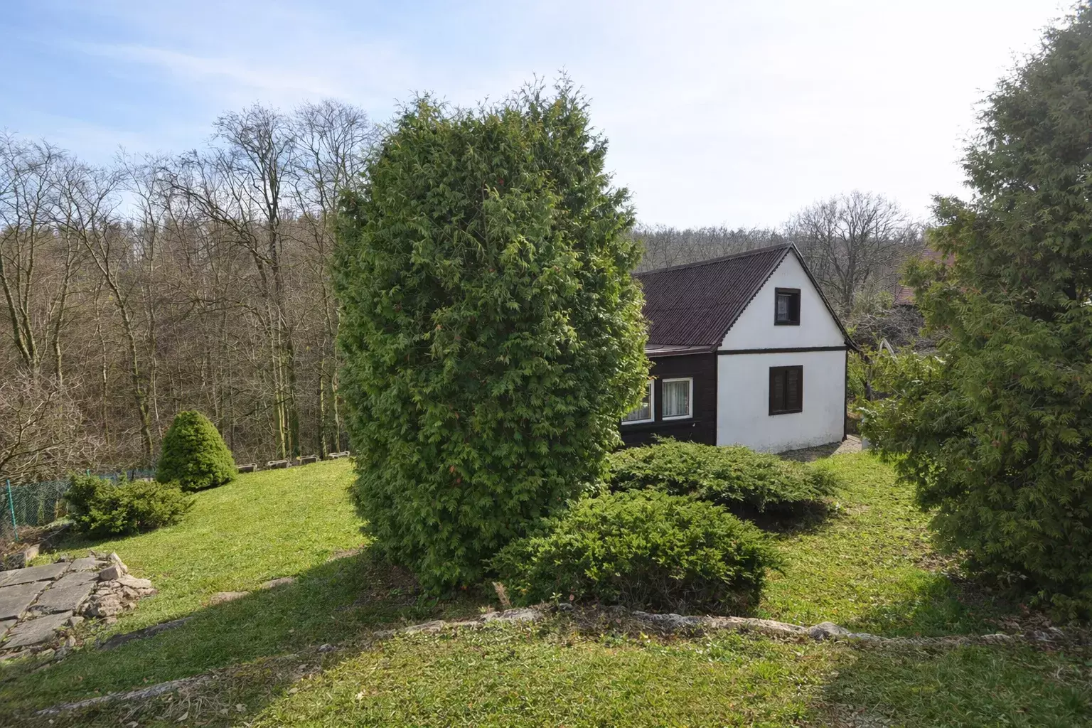 Součástí prodeje je pozemek o celkové výměře cca 1 428 m², tvořený kombinací zahrady 718 m² a navazující lesní části 665m². Pozemek je mírně svažitý, přičemž jeho zadní část přechází do svahu směrem do údolí, což zajišťuje dostatek soukromí a příjemné přírodní prostředí. Lokalita nabízí klid, zeleň a bezprostřední kontakt s přírodou CHKO Český kras. V okolí se nachází převážně rekreační objekty, část zástavby je využívána i k trvalému bydlení. Dle územního plánu se nemovitost nachází v ploše smíšené rekreační (SM-R), určené primárně pro individuální rekreaci. Lokalita je stabilizovaná bez dalšího plošného rozvoje, což přispívá k zachování jejího charakteru a klidného prostředí. Stávající objekt je možné rekonstruovat, nebo nahradit novou stavbou obdobného charakteru, s důrazem na respektování okolní zástavby a krajinného rázu.