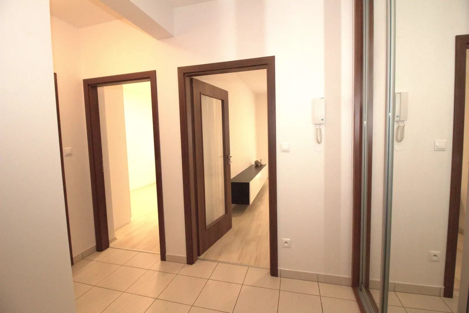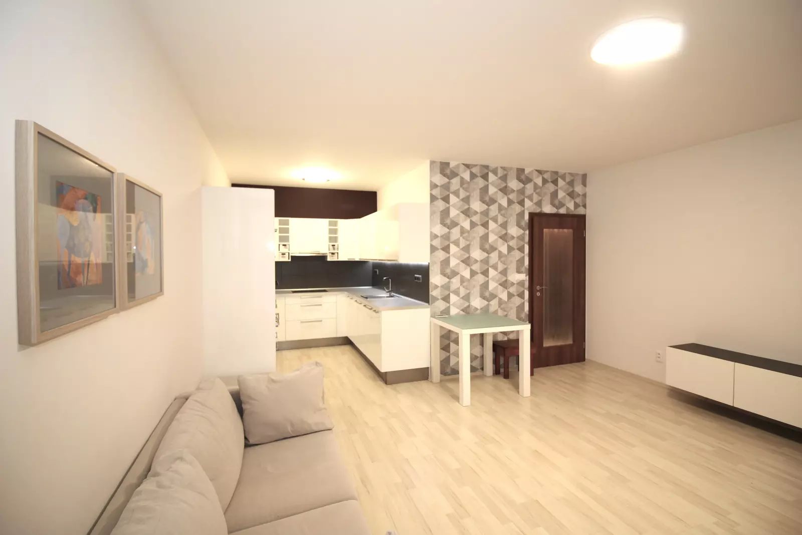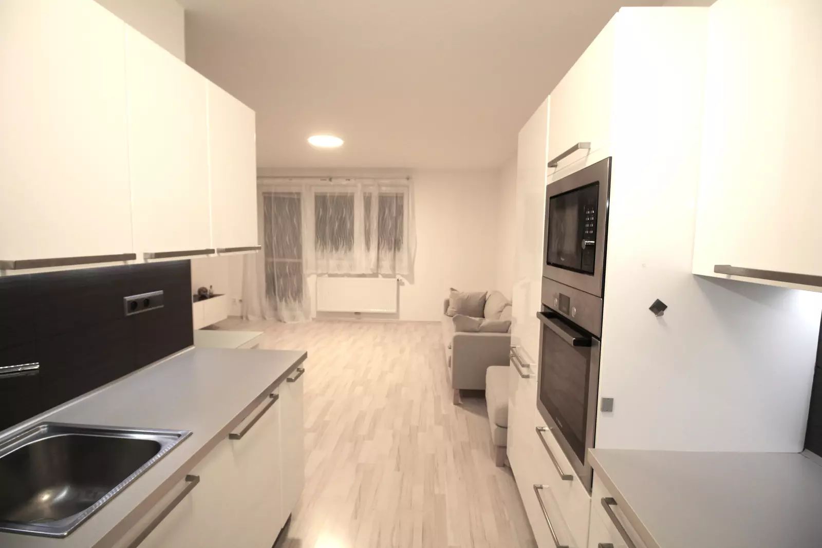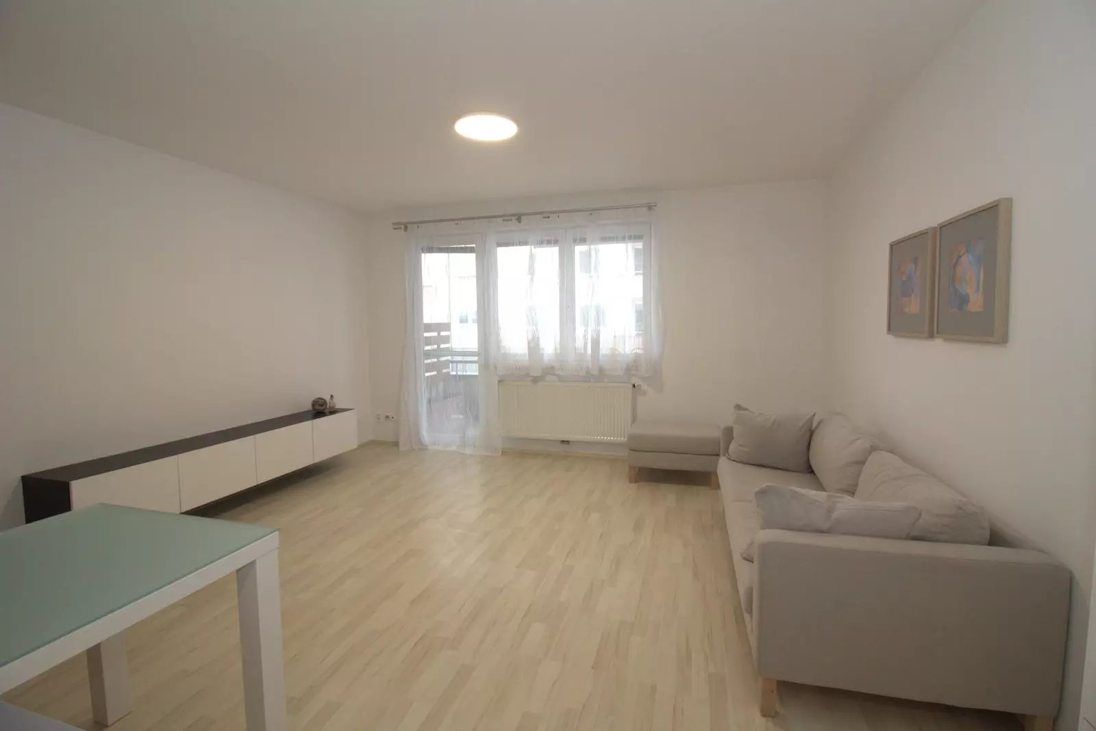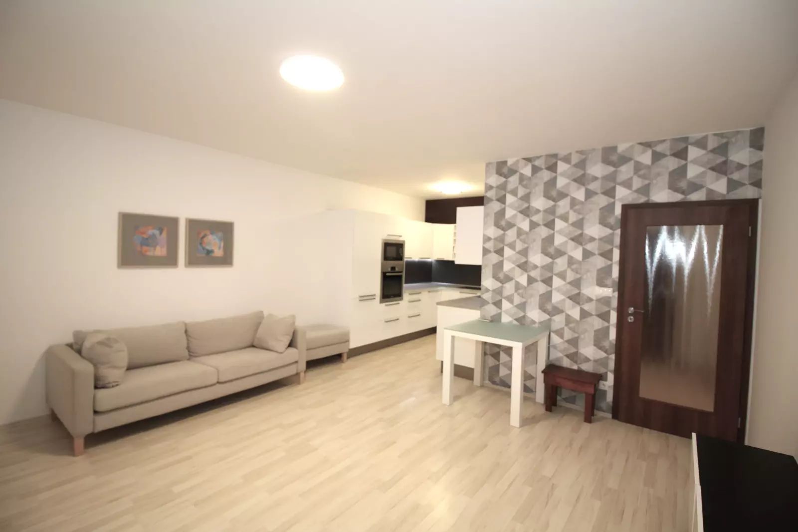 Byt je částečně vybavený, k dispozici Vám bude prostorná bílá kuchyňská linka s vestavěnými spotřebiči (lednice s mrazákem, trouba, varná deska, digestoř, mikrovlnná trouba a myčka) a jídelní stůl pro 2 osoby. V obýváku jsou zavěšené skříňky pod TV, gauč a taburet. Spoustu úložného prostoru poskytne vestavěná skříň na chodbě a šatní skříň v ložnici. Na podlaze v obýváku a ložnici je laminátová plovoucí podlaha, v ostatních místnostech je dlažba. Kvalitu bydlení zvyšují bezpečnostní skla a protihluková stěna v ložnici.