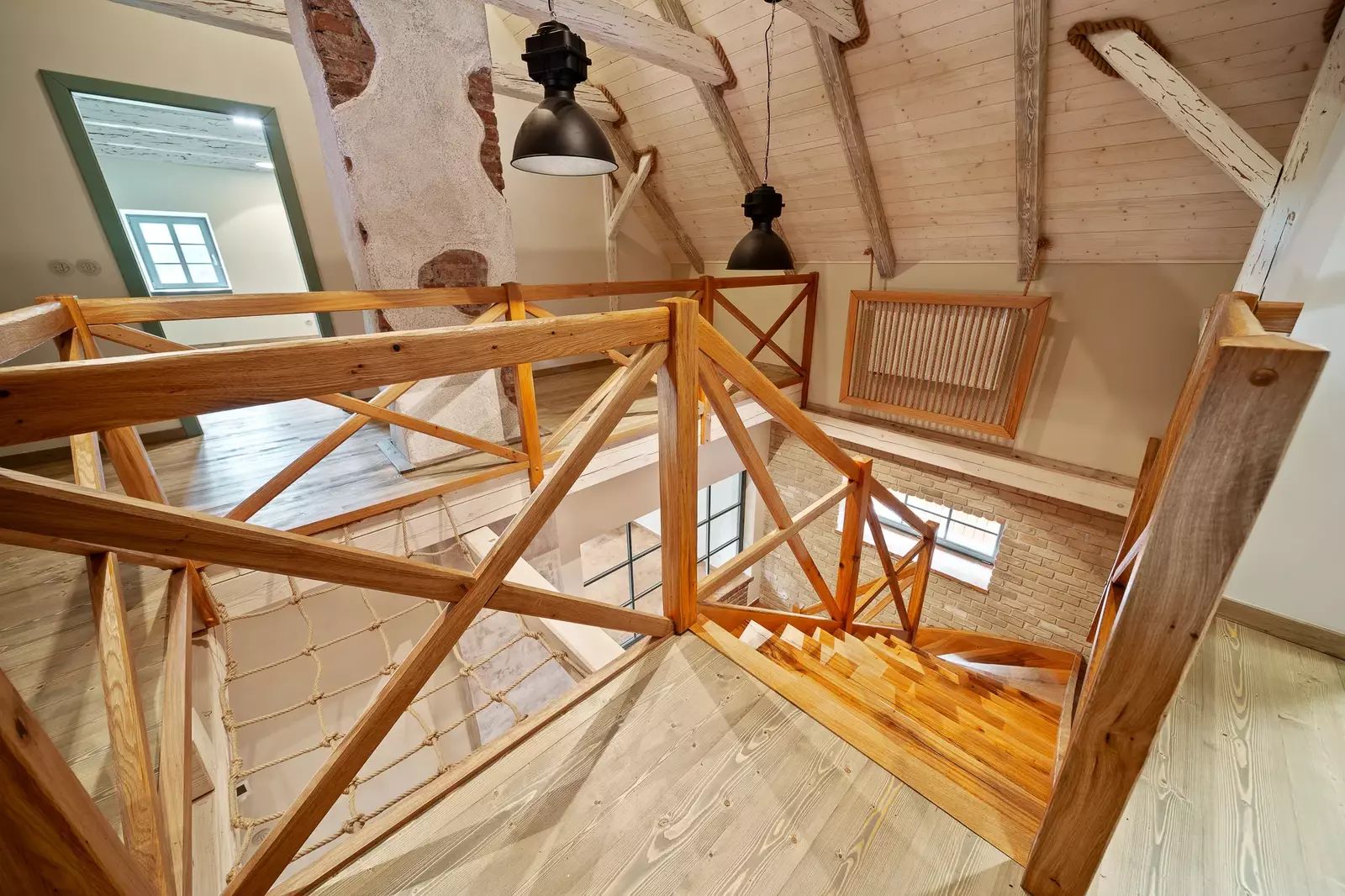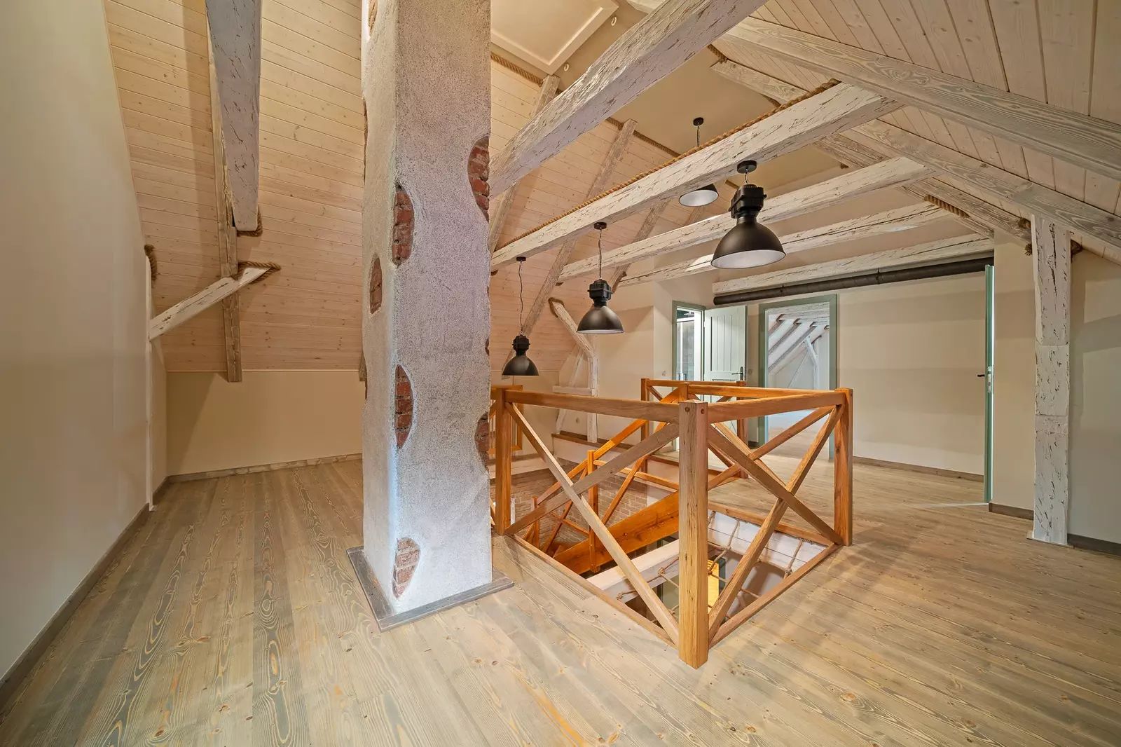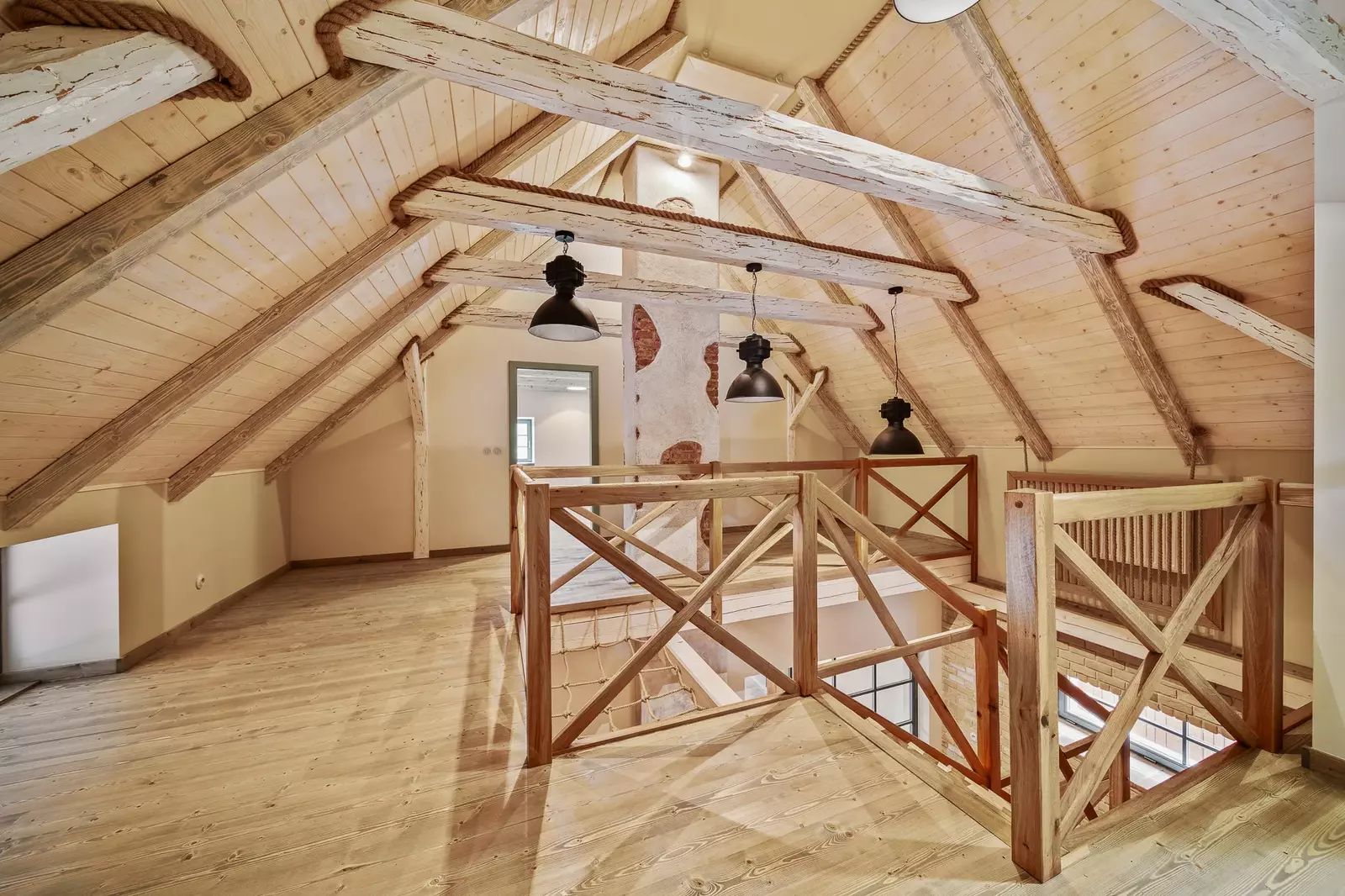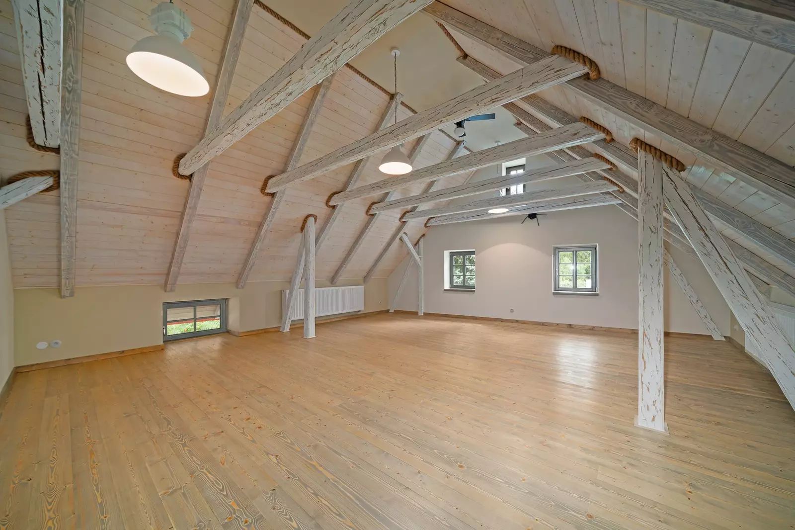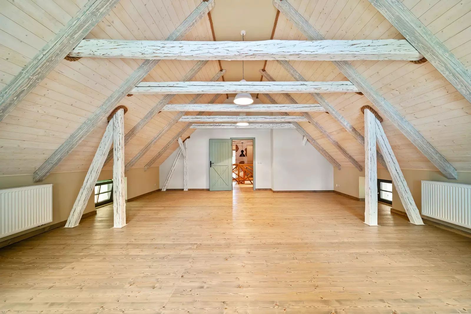 V patře jsou dva velkorysé pokoje s otevřeným podkrovím, které nabízí další možnosti spaní či úložného prostoru.
