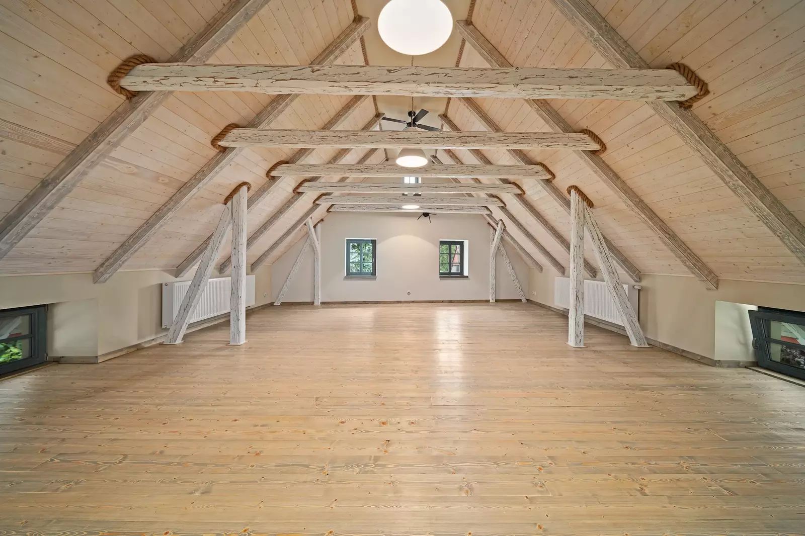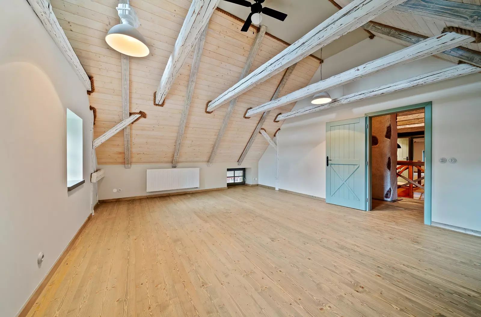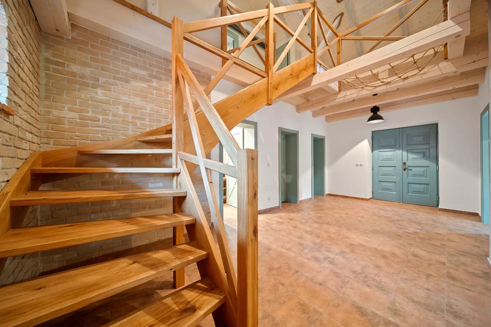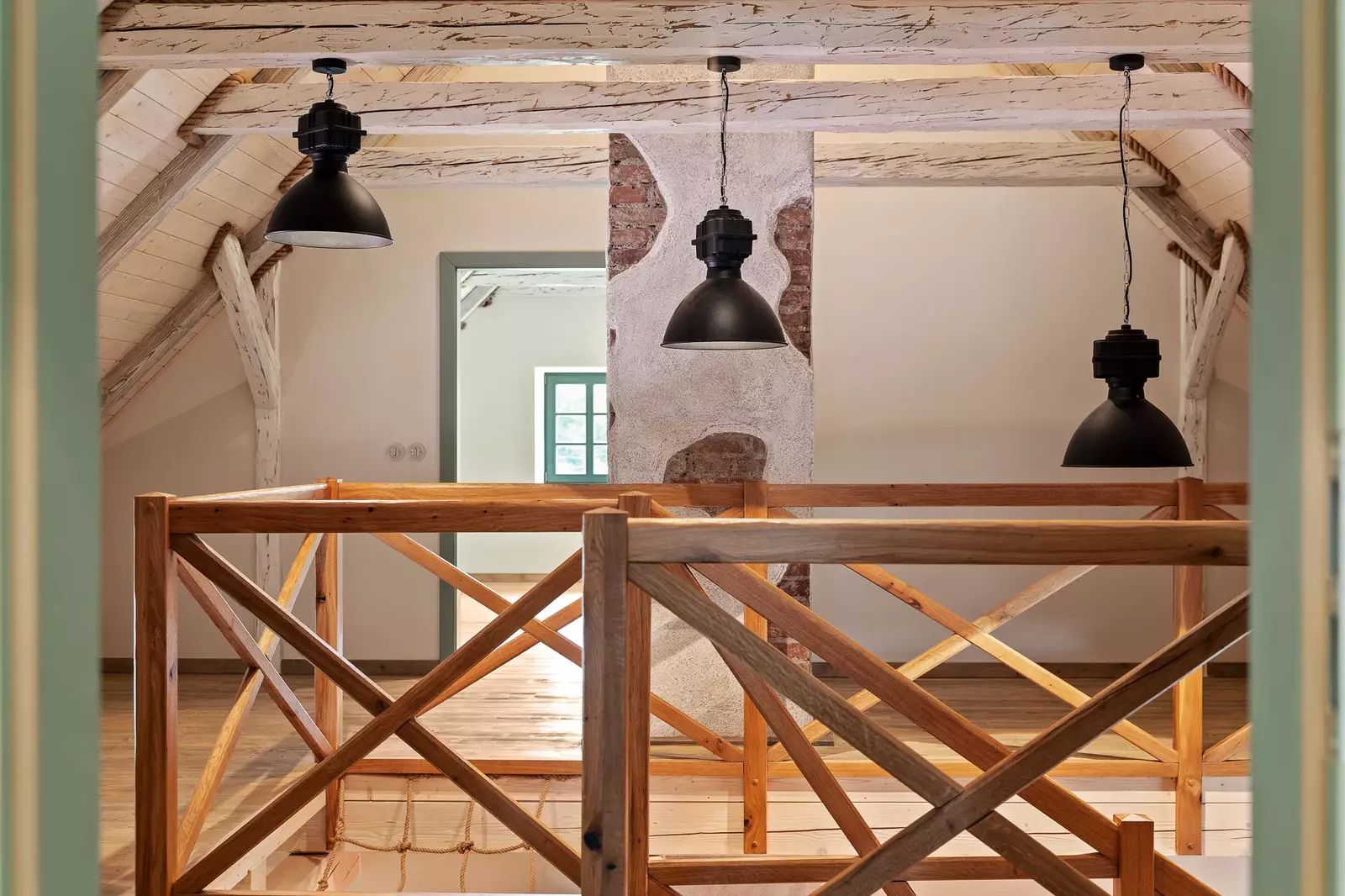 V patře jsou dva velkorysé pokoje s otevřeným podkrovím, které nabízí další možnosti spaní či úložného prostoru.