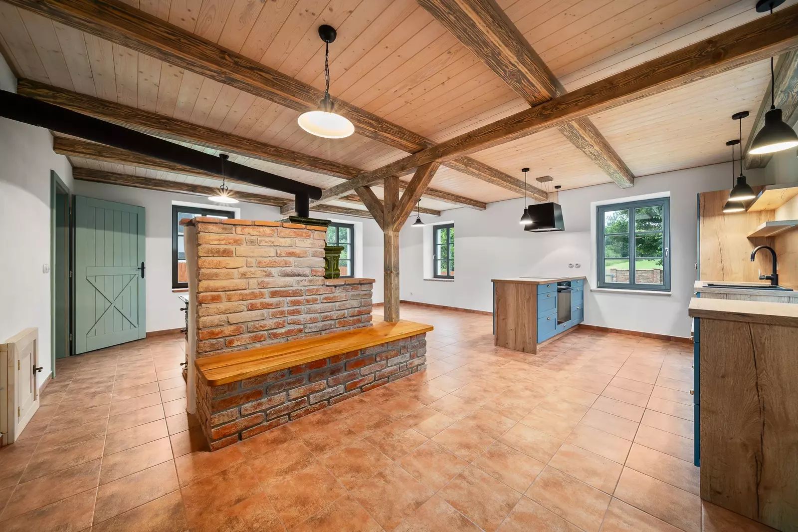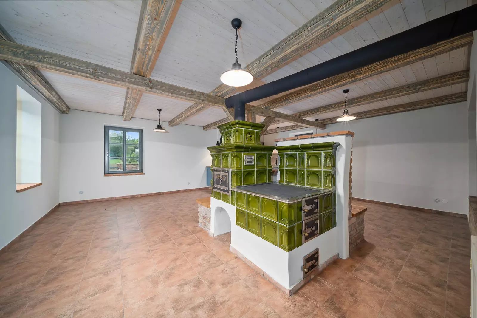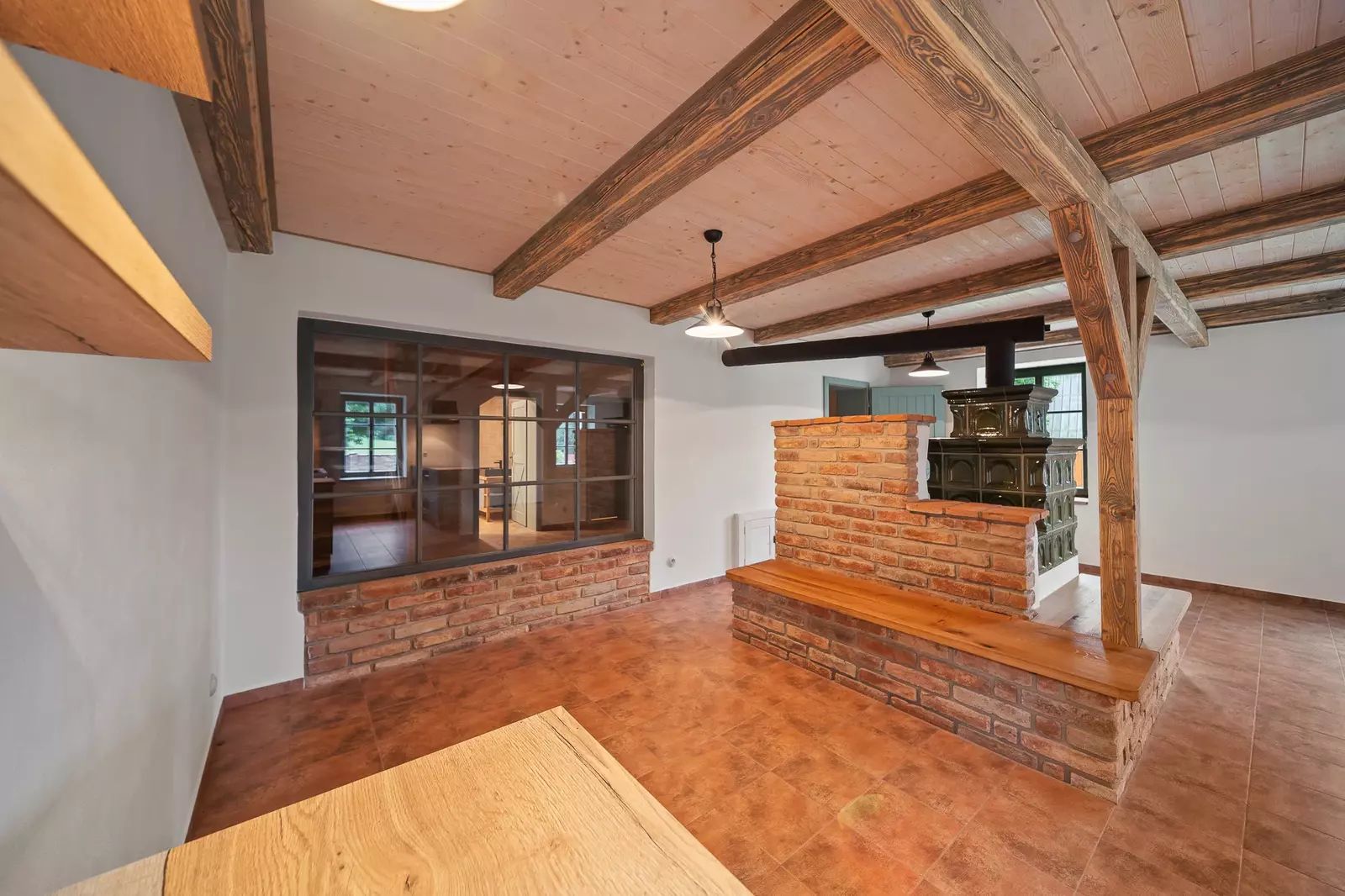 V přízemí se nachází vstupní chodba, prostorný obývací pokoj propojený s kuchyňským koutem, jehož dominantou jsou nová kachlová kamna. Dále je zde koupelna, samostatná toaleta, technická místnost a vnitřní sauna s odpočívárnou.