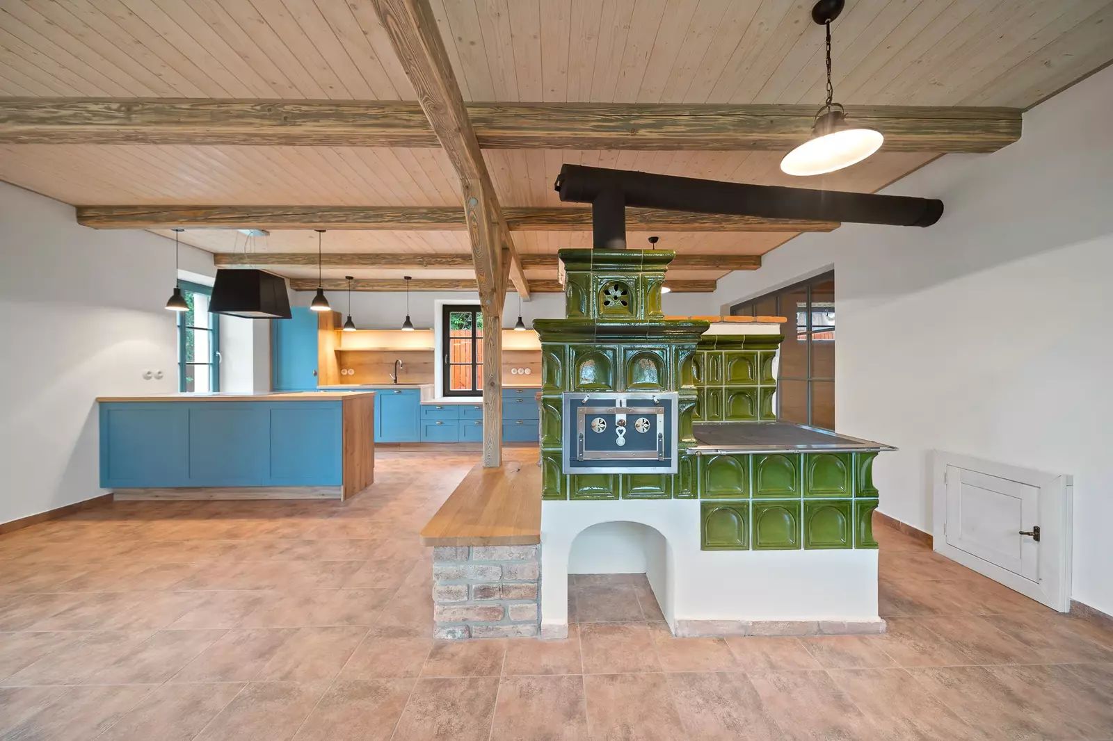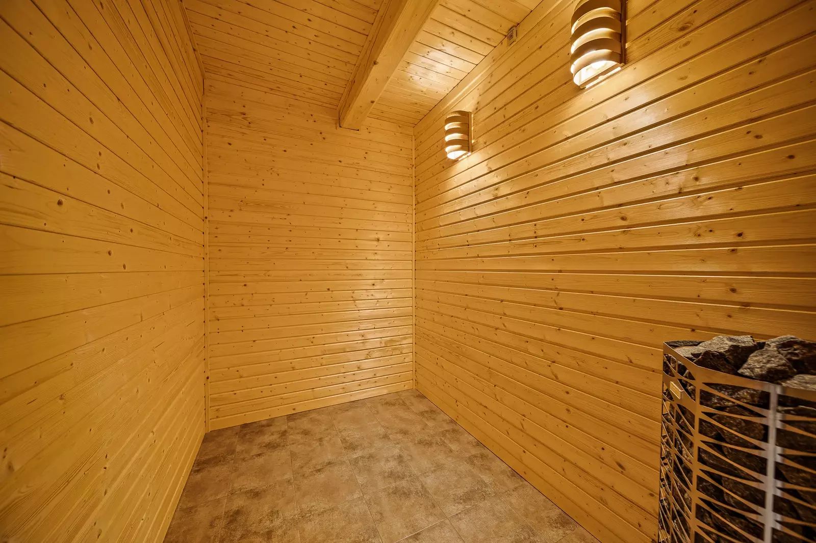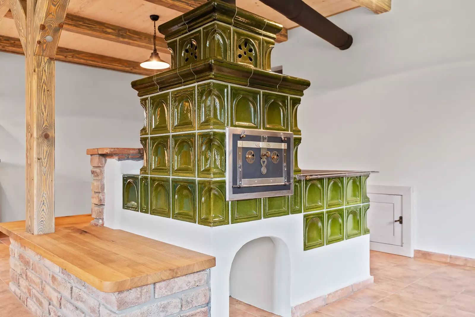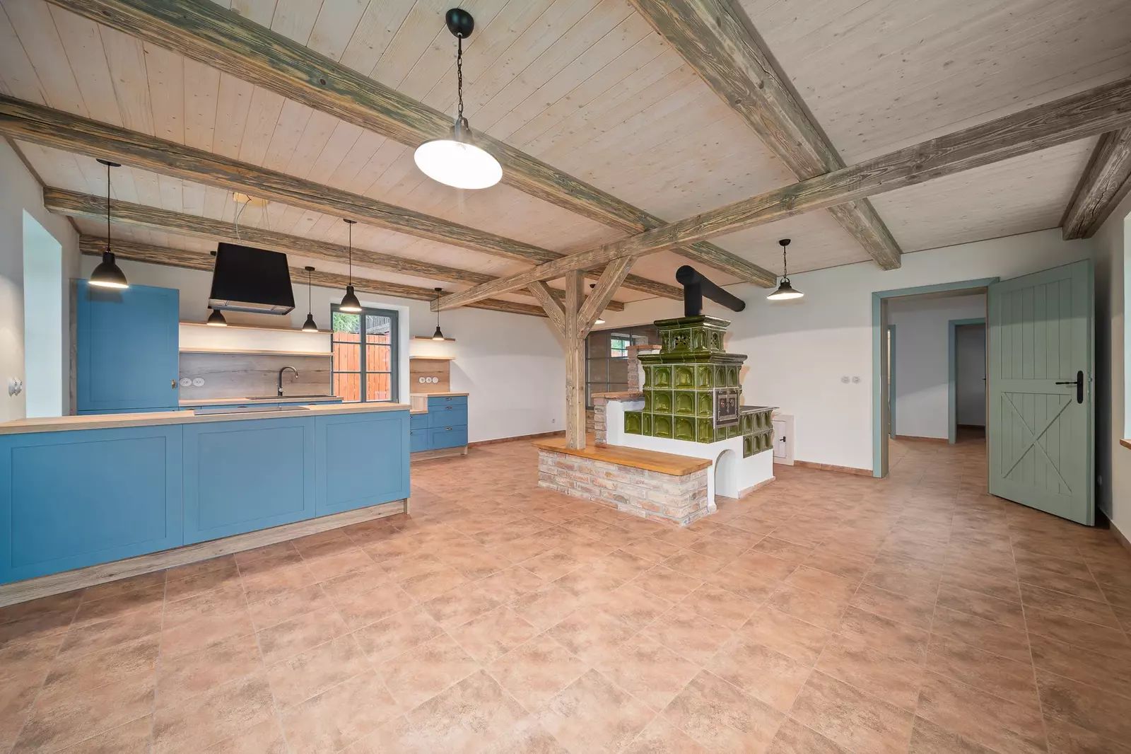 V přízemí se nachází vstupní chodba, prostorný obývací pokoj propojený s kuchyňským koutem, jehož dominantou jsou nová kachlová kamna. Dále je zde koupelna, samostatná toaleta, technická místnost a vnitřní sauna s odpočívárnou.