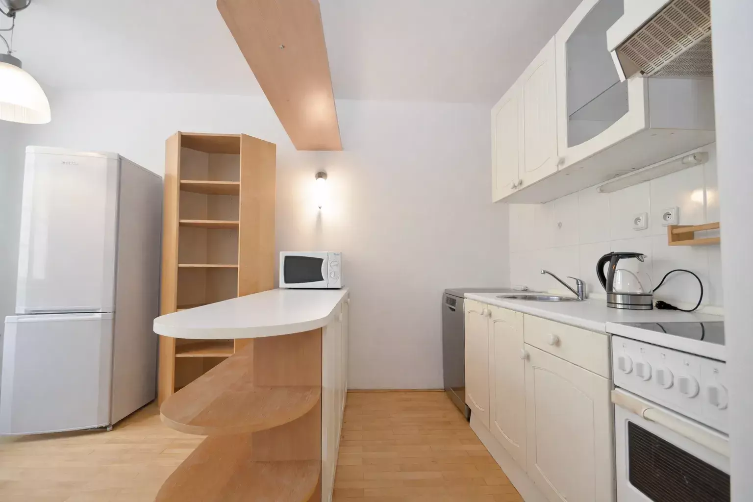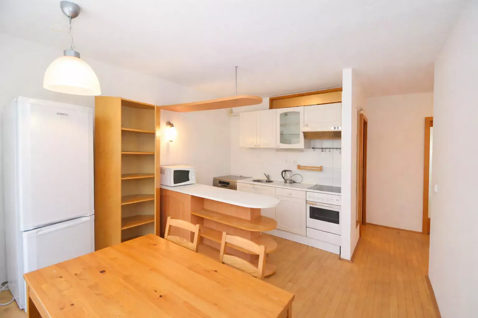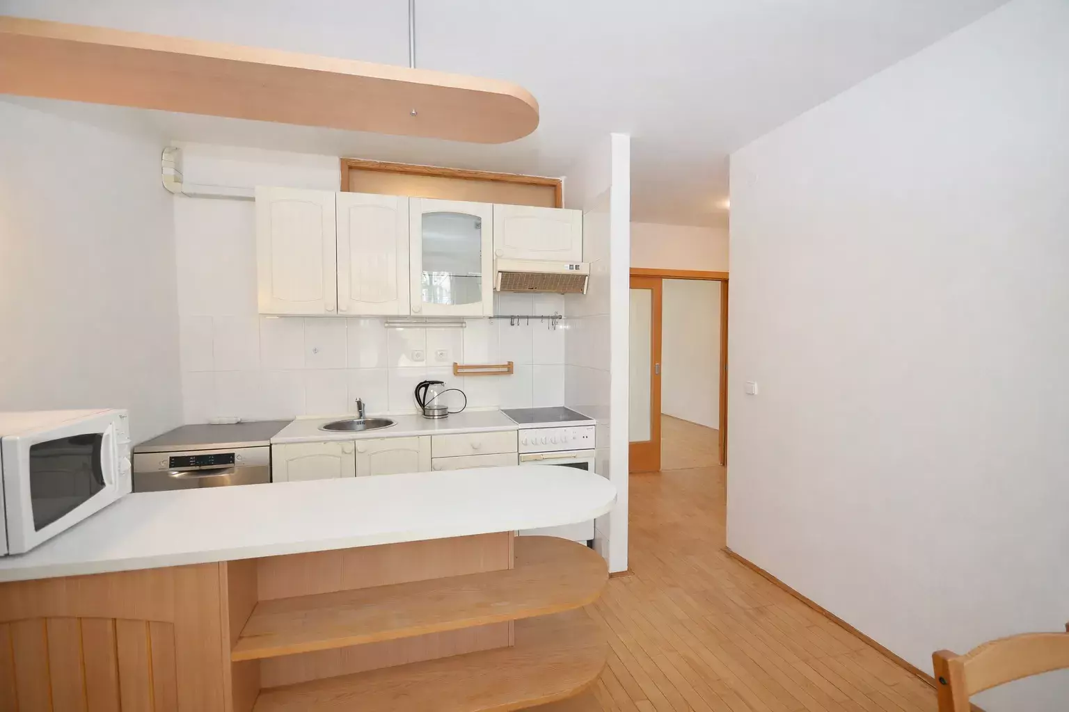 Dominantou bytu je prostorný obývací pokoj s přímým vstupem na lodžii se zasklením, orientovanou na slunnou jižní stranu, která se táhne podél celé místnosti a poskytuje příjemné místo k odpočinku. Samostatná kuchyně s jídelní částí je vybavena kuchyňskou linkou včetně spotřebičů (trouba, sklokeramická varná deska, myčka nádobí, lednice s mrazákem).