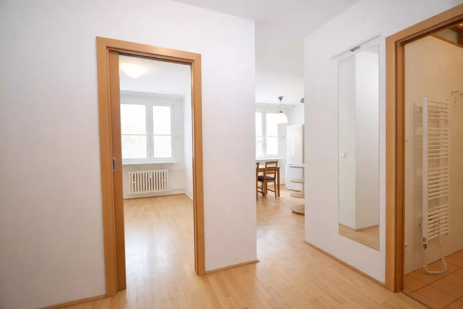 Dále byt nabízí samostatnou ložnici, předsíň s úložnými možnostmi a koupelnu po rekonstrukci se sprchovým koutem a toaletou. Dispozice je velmi praktická, ze vstupní chodby jsou samostatné vstupy do jednotlivých místností.