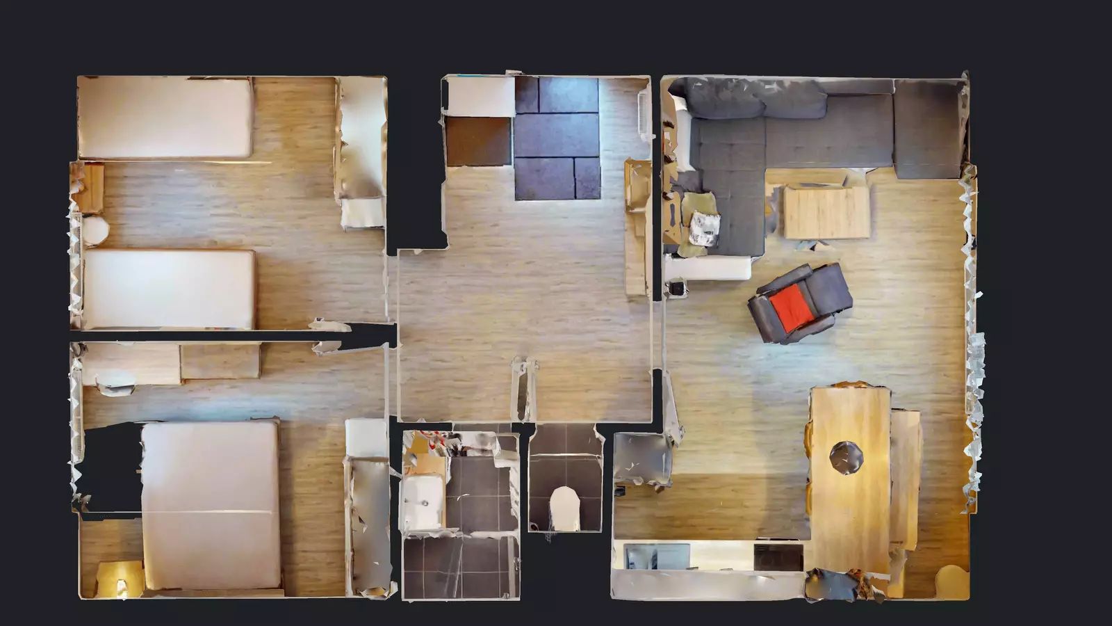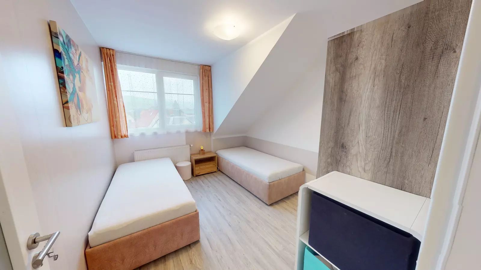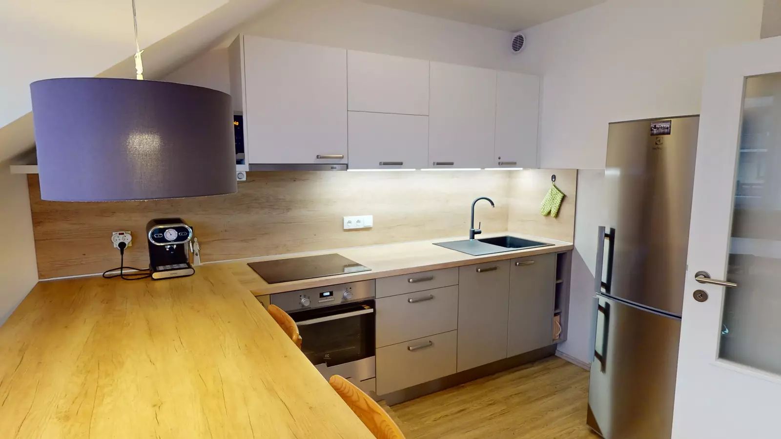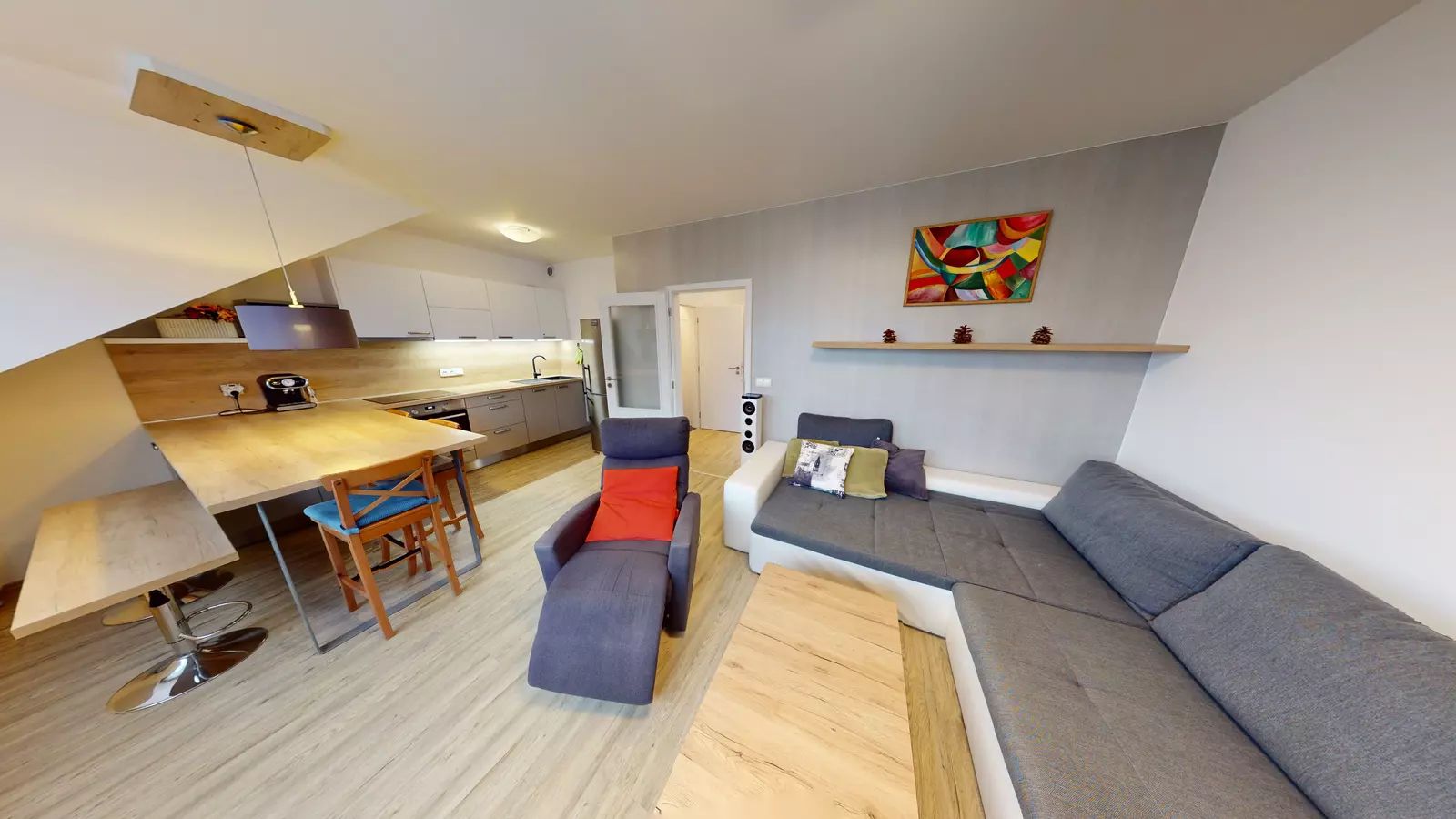 Apartmán vyniká moderně zařízenou kuchyní, ve které najdete vestavěnou el. troubu, sklokeramickou varnou desku, digestoř, myčku, mikrovlnku a lednici s mrazákem, což zajišťuje možnost přípravy pokrmů v pohodlí domova. V dětském pokoji jsou dvě postele s úložným prostorem a v ložnice dvojpostel. Součástí bytu je prostorný sklep (7 m2), který poskytuje nezbytný úložný prostor. Před bytovým domem je dostatek parkovacích míst.