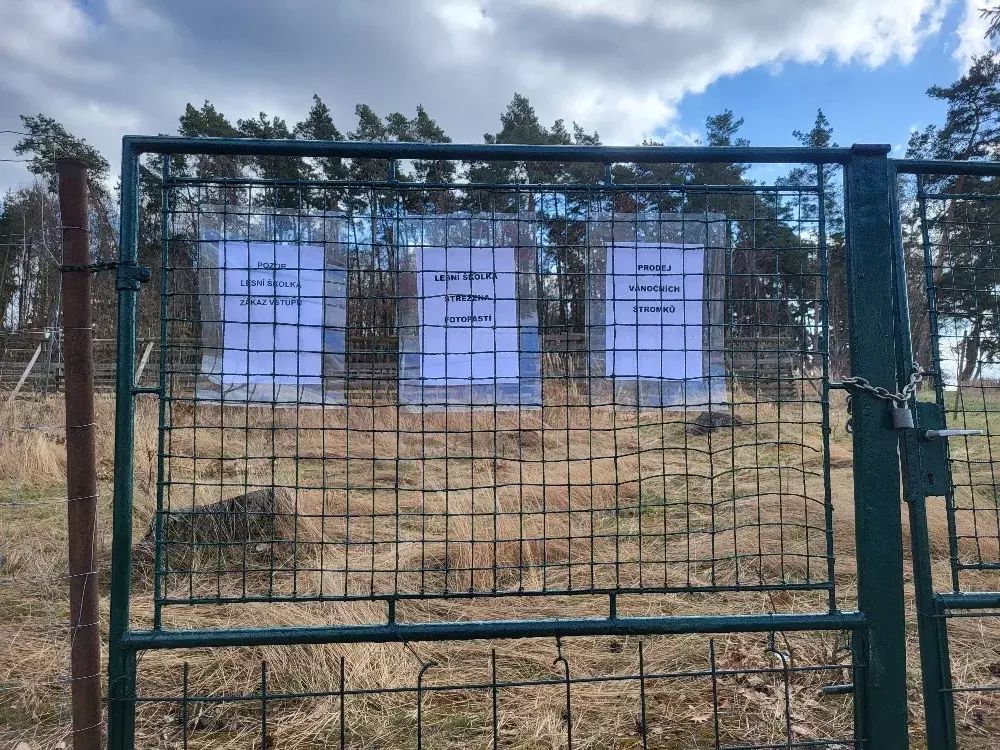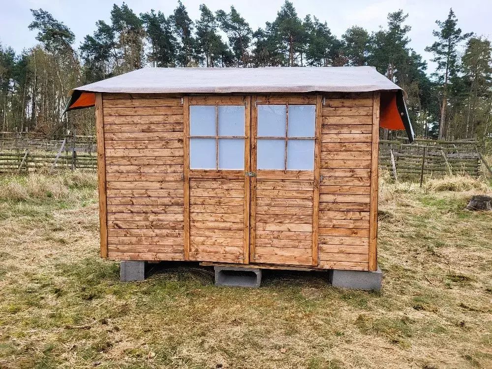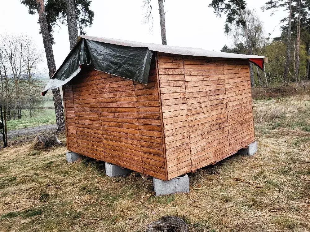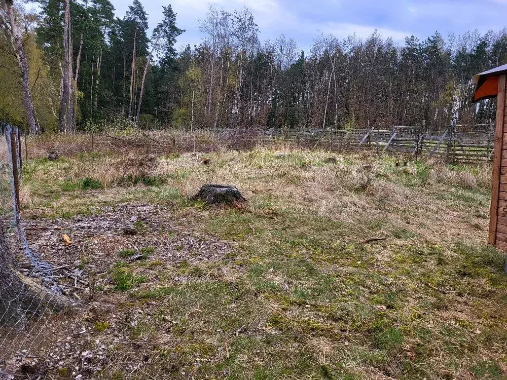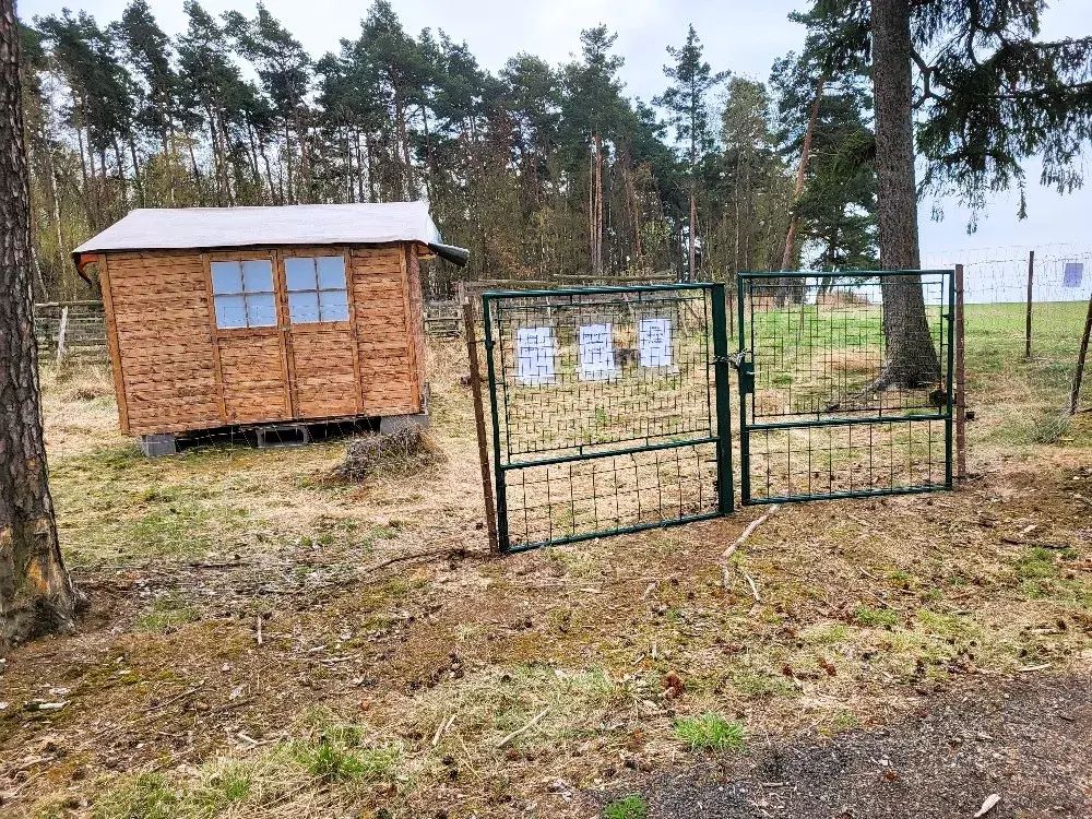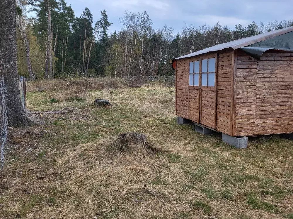 Lesní pozemek s dřevěným přístřeškem, oploceno