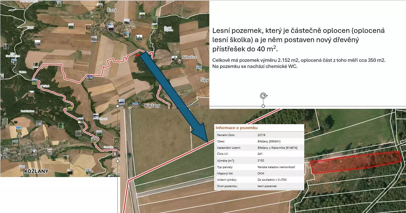 Exkluzivně nabízíme pro milovníky přírody lesní pozemek o ploše 2.152 m2 mezi obcemi Břežany a Čistá u Rakovníka. Část pozemku je oplocena proti zvěři (lesní školka), má vjezdová vrata a na pozemku stojí malý dřevěný přístřešek. Pozemek je vhodné využívat i nadále např. jako lesní školku s možností příležitostného přespávání v zahradním dřevěném domku. Na pozemku majitel nechá i chemické WC. Elektřinu lze řešit solárními panely, vodu je nutné si dovážet. V případě zájmu je možné se na pozemek volně podívat, v inzerci je přesná poloha. V případě jakýchkoli dotazů prosím kontaktujte makléře.