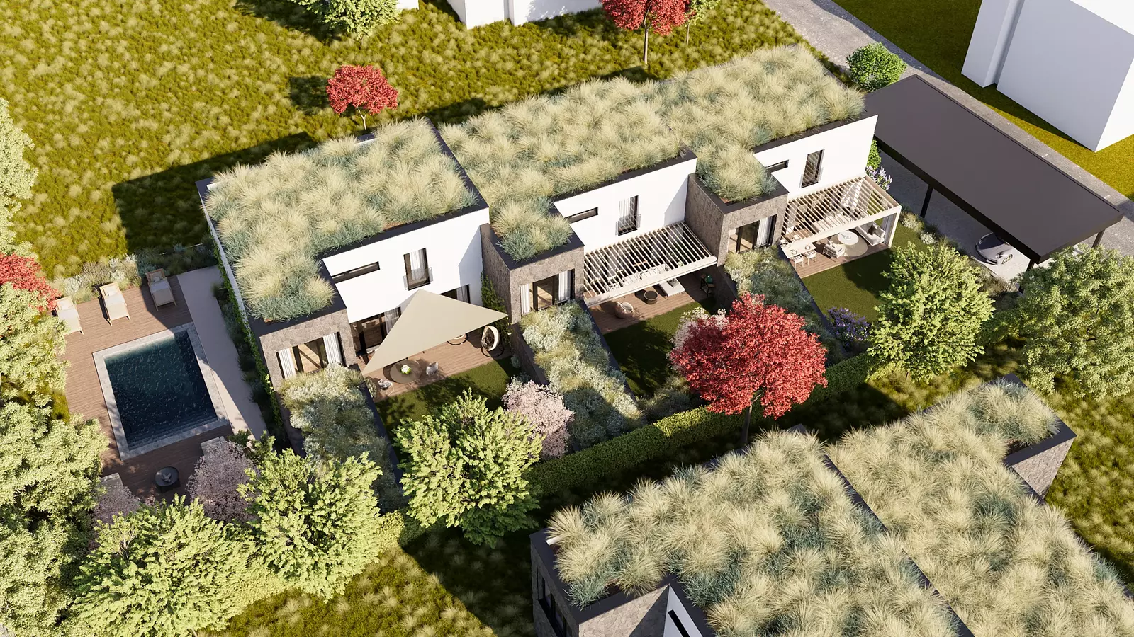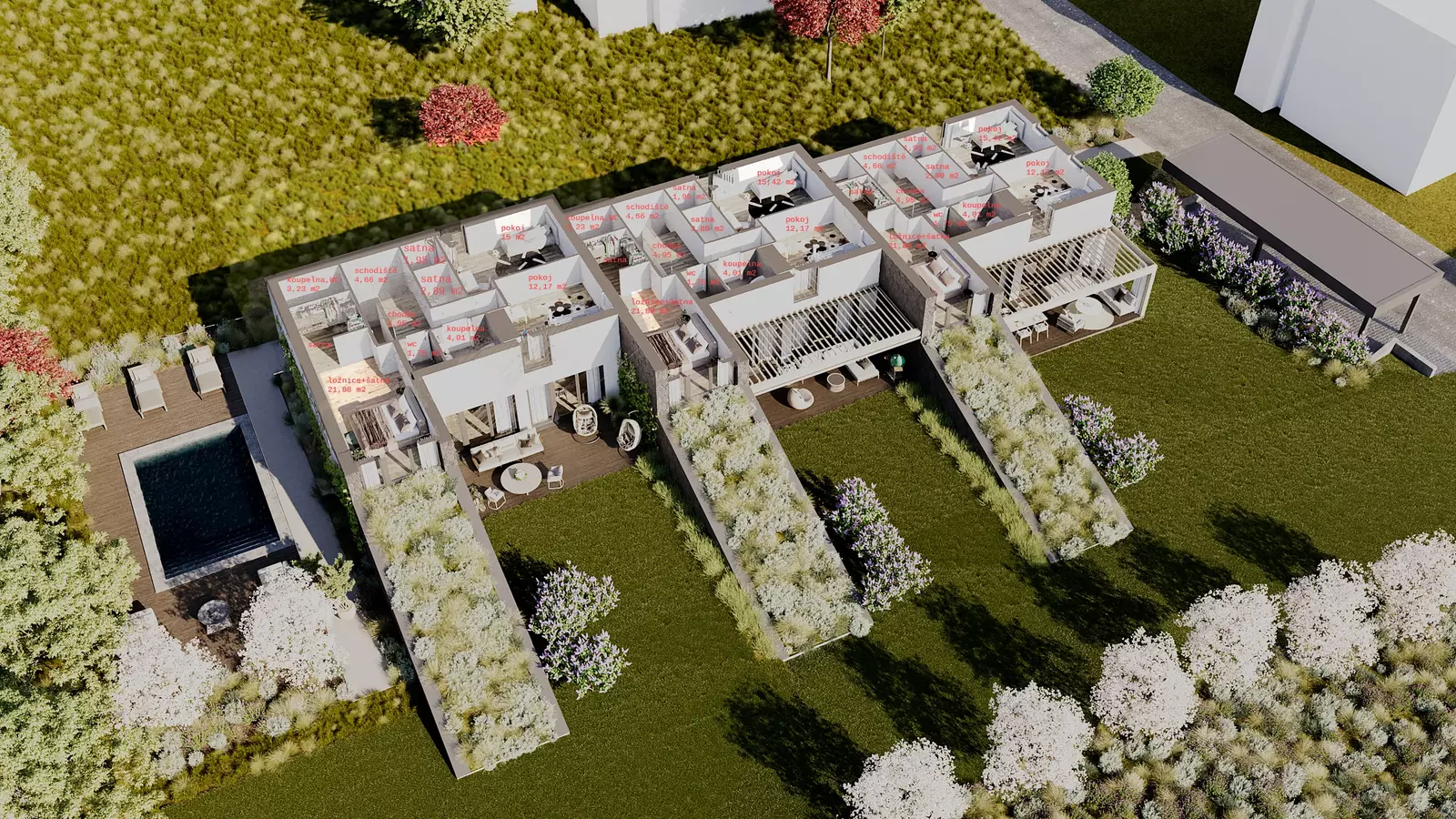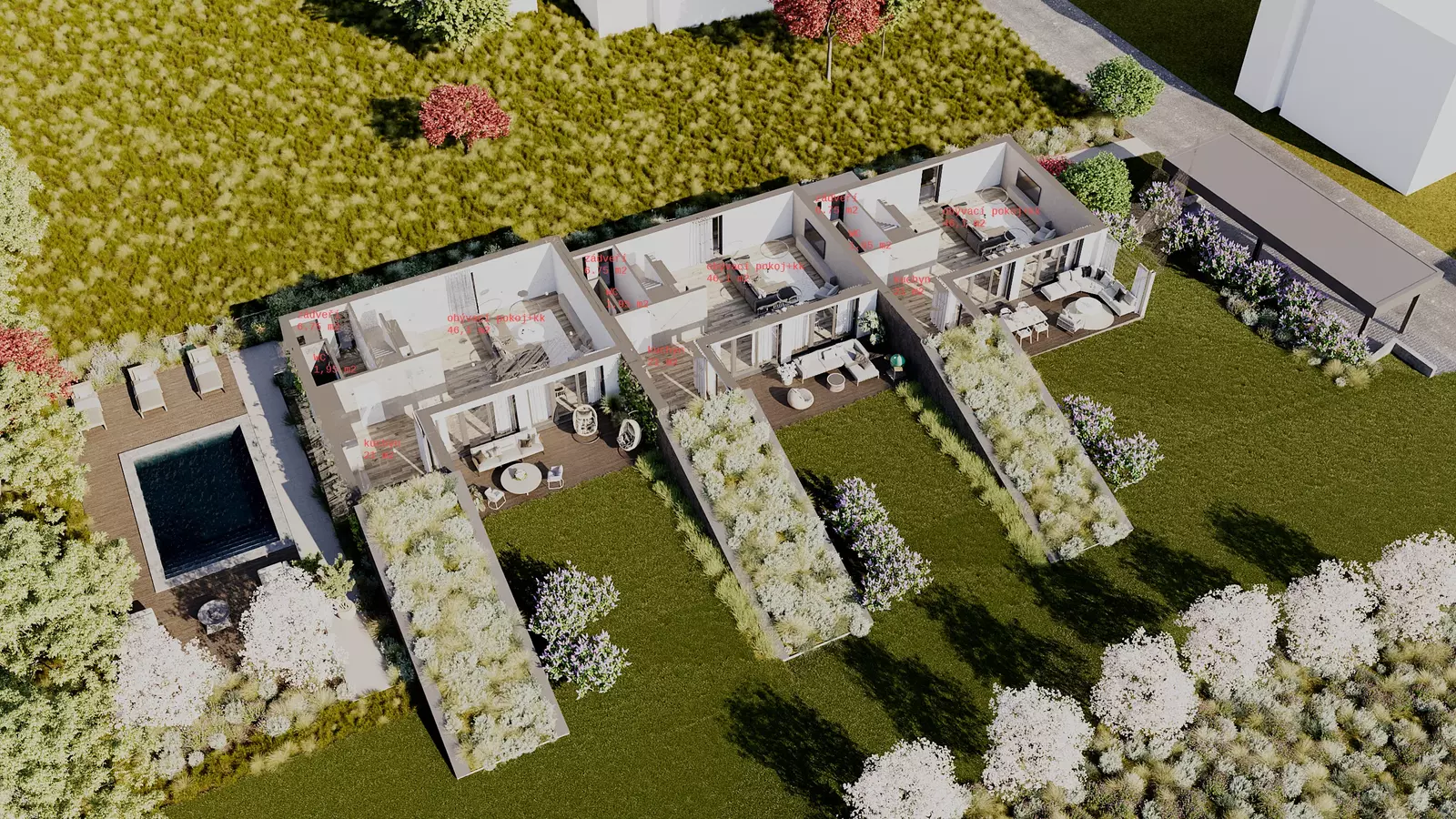 Zděné domy jsou postaveny výhradně za pomoci kvalitních materiálů a moderních technologií. Zateplení o síle 20 cm, trojskla, podlahové vytápění s tepelným čerpadlem, rozvody zabezpečovacího systému (včetně přípravy na kamery), příprava na FVE, elektrické předokenní žaluzie či bezfalcové dveře včetně magnetických zámků jsou samozřejmostí.