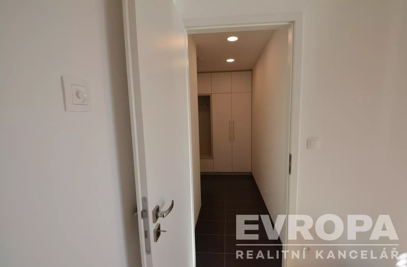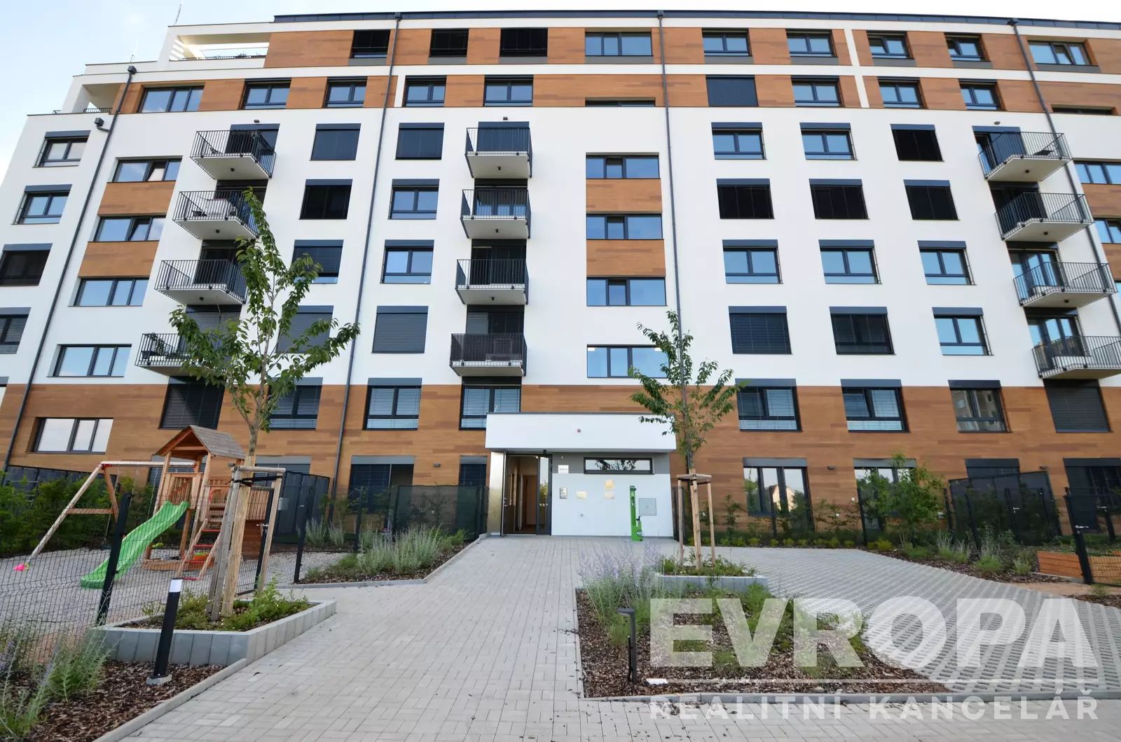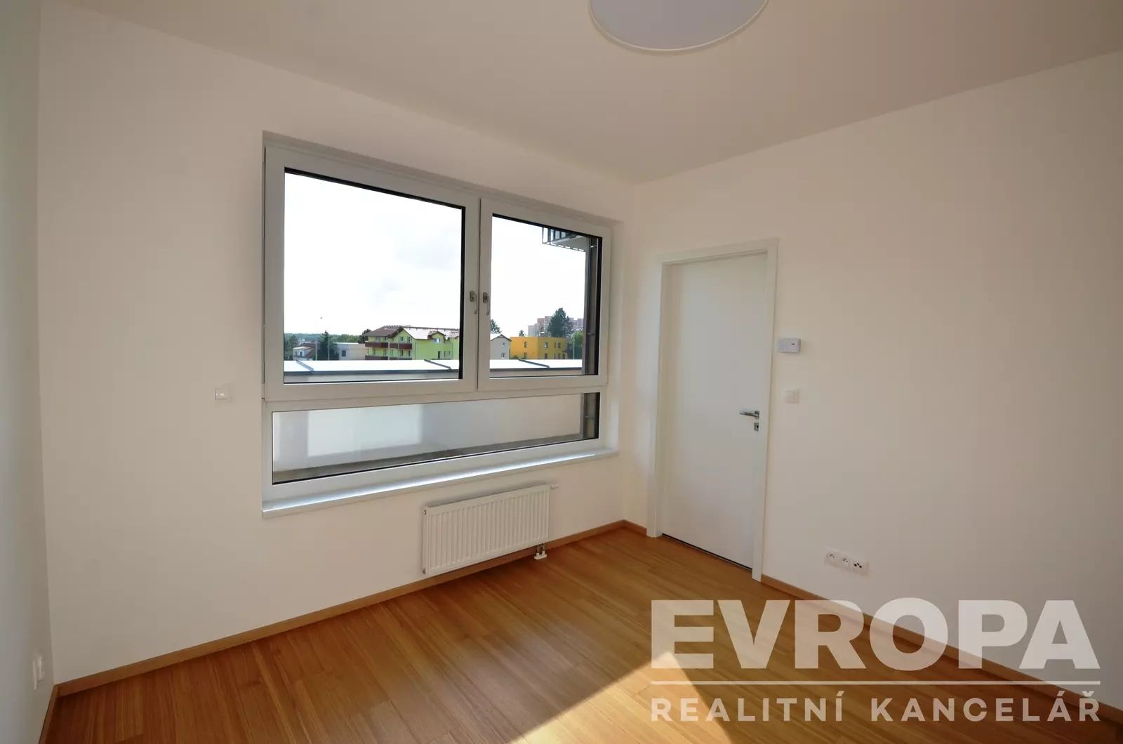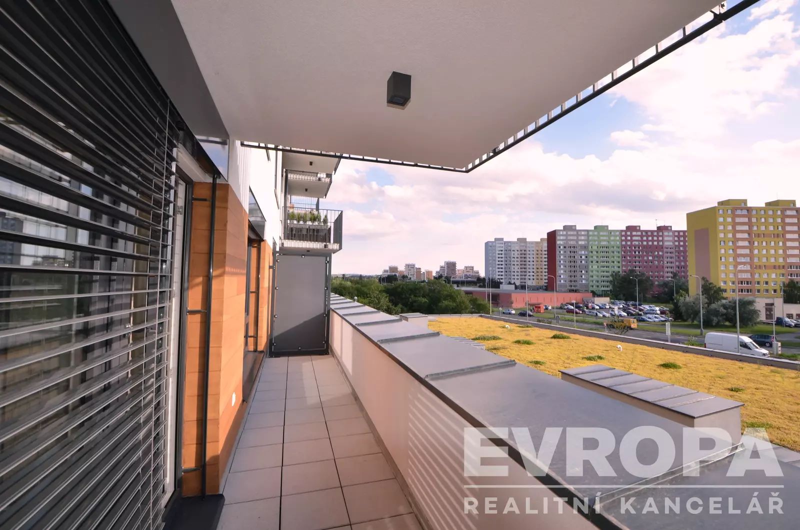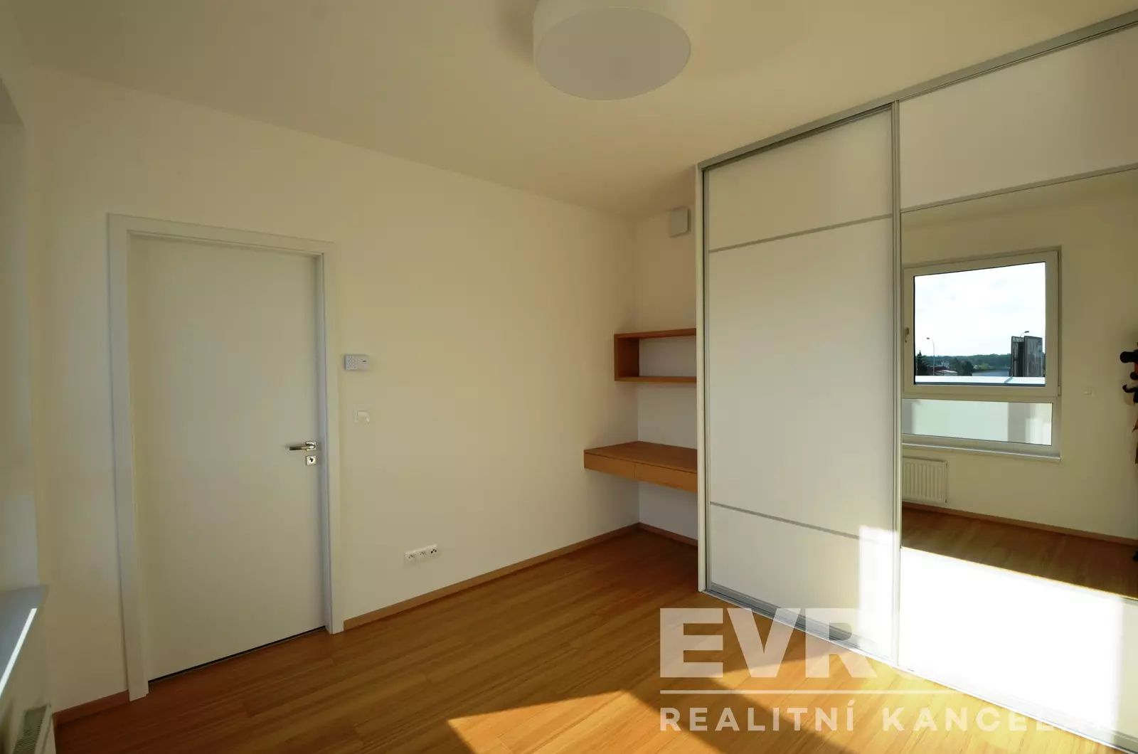 Pronájem bytu 2+kk s podlahovou plochou 50m2, balkonem 5m2 a sklepem 2m2 v osobním vlastnictví ve 4.patře sedmipatrového pasivního domu s výtahem. Dispozice bytu je řešena vstupem do předsíně (chodby), která disponuje prostornou na míru vestavěnou skříní, vlevo se vstupem do koupelny s podlahovým topením, sprchovým koutem a toaletou. Dále vstup do světlého obývacího pokoje s kuchyňským koutem a vstupem na prostornou terasu. Součástí moderní linky je sklokeramická deska, horkovz. trouba, lednice, mrazák a myčka. Z obývacího pokoje vlevo vstup opět do světlého pokoje (ložnice) s praktickou velkou šatní skříní. Izolační trojskla oken v ložnici a obývacím pokoji jsou směrována na jihozápad a osazena elektrickými venkovními žaluziemi. Byt je vybaven moderními materiály, dřevěné podlahy, koupelna s předsíní dlažba.