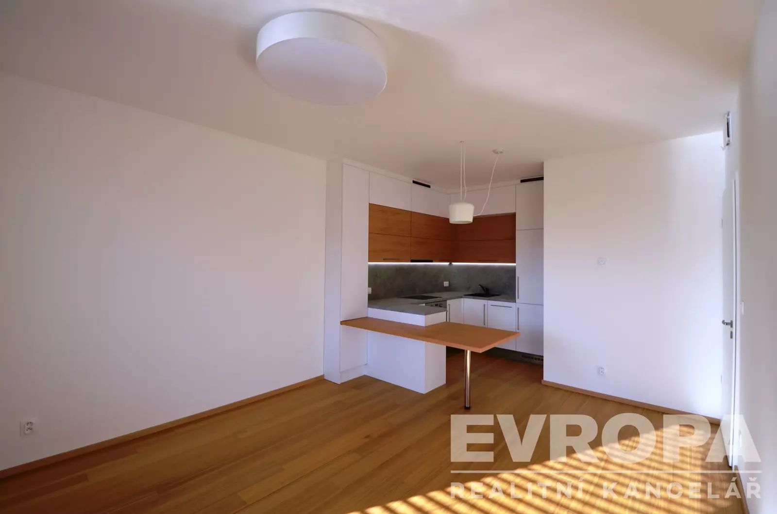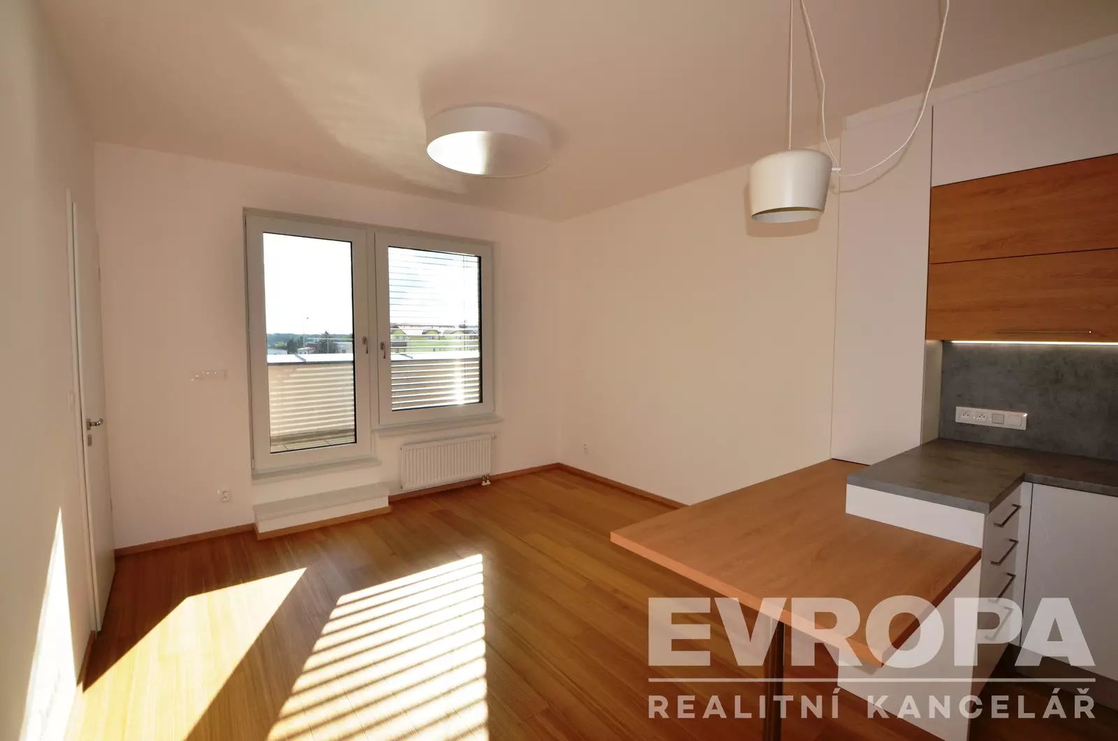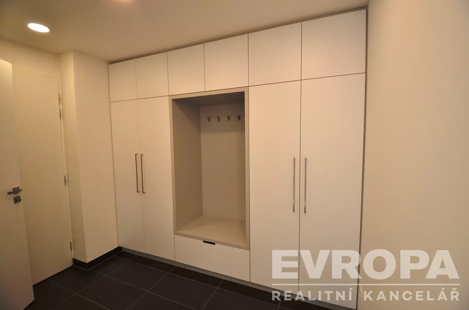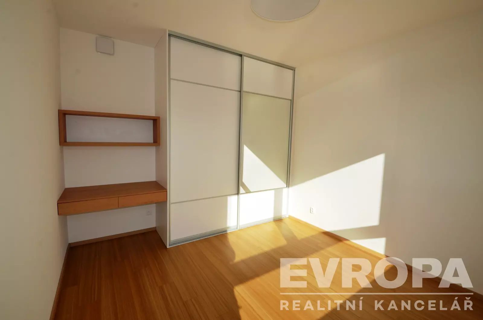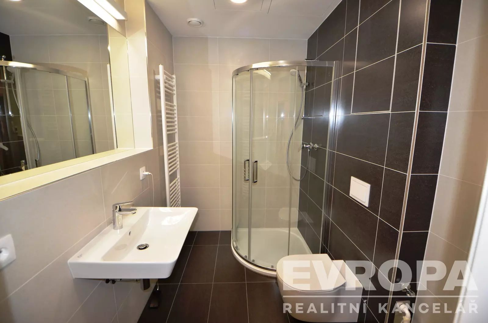 Pronájem bytu 2+kk s podlahovou plochou 50m2, balkonem 5m2 a sklepem 2m2 v osobním vlastnictví ve 4.patře sedmipatrového pasivního domu s výtahem. Dispozice bytu je řešena vstupem do předsíně (chodby), která disponuje prostornou na míru vestavěnou skříní, vlevo se vstupem do koupelny s podlahovým topením, sprchovým koutem a toaletou. Dále vstup do světlého obývacího pokoje s kuchyňským koutem a vstupem na prostornou terasu. Součástí moderní linky je sklokeramická deska, horkovz. trouba, lednice, mrazák a myčka. Z obývacího pokoje vlevo vstup opět do světlého pokoje (ložnice) s praktickou velkou šatní skříní. Izolační trojskla oken v ložnici a obývacím pokoji jsou směrována na jihozápad a osazena elektrickými venkovními žaluziemi. Byt je vybaven moderními materiály, dřevěné podlahy, koupelna s předsíní dlažba.