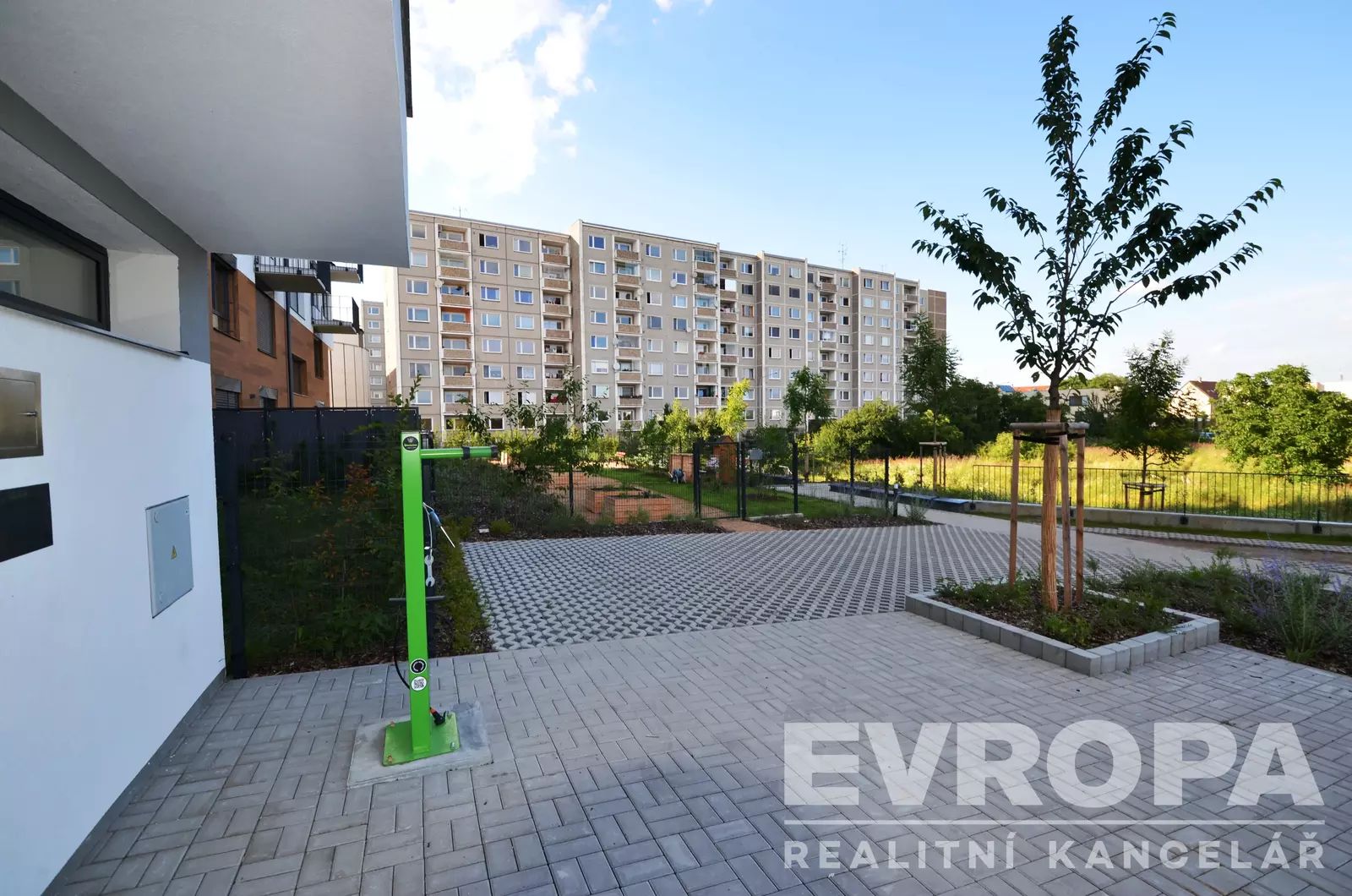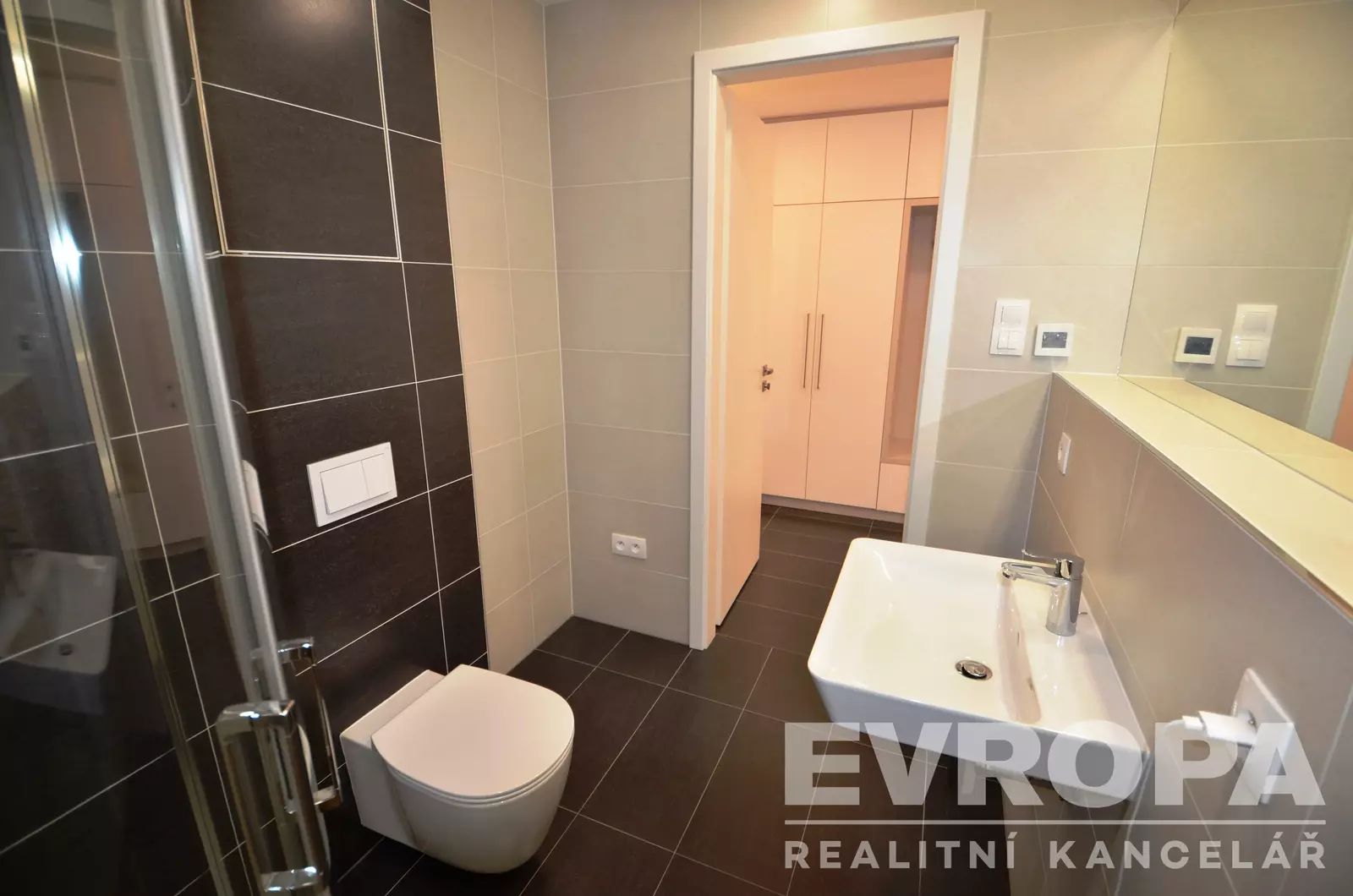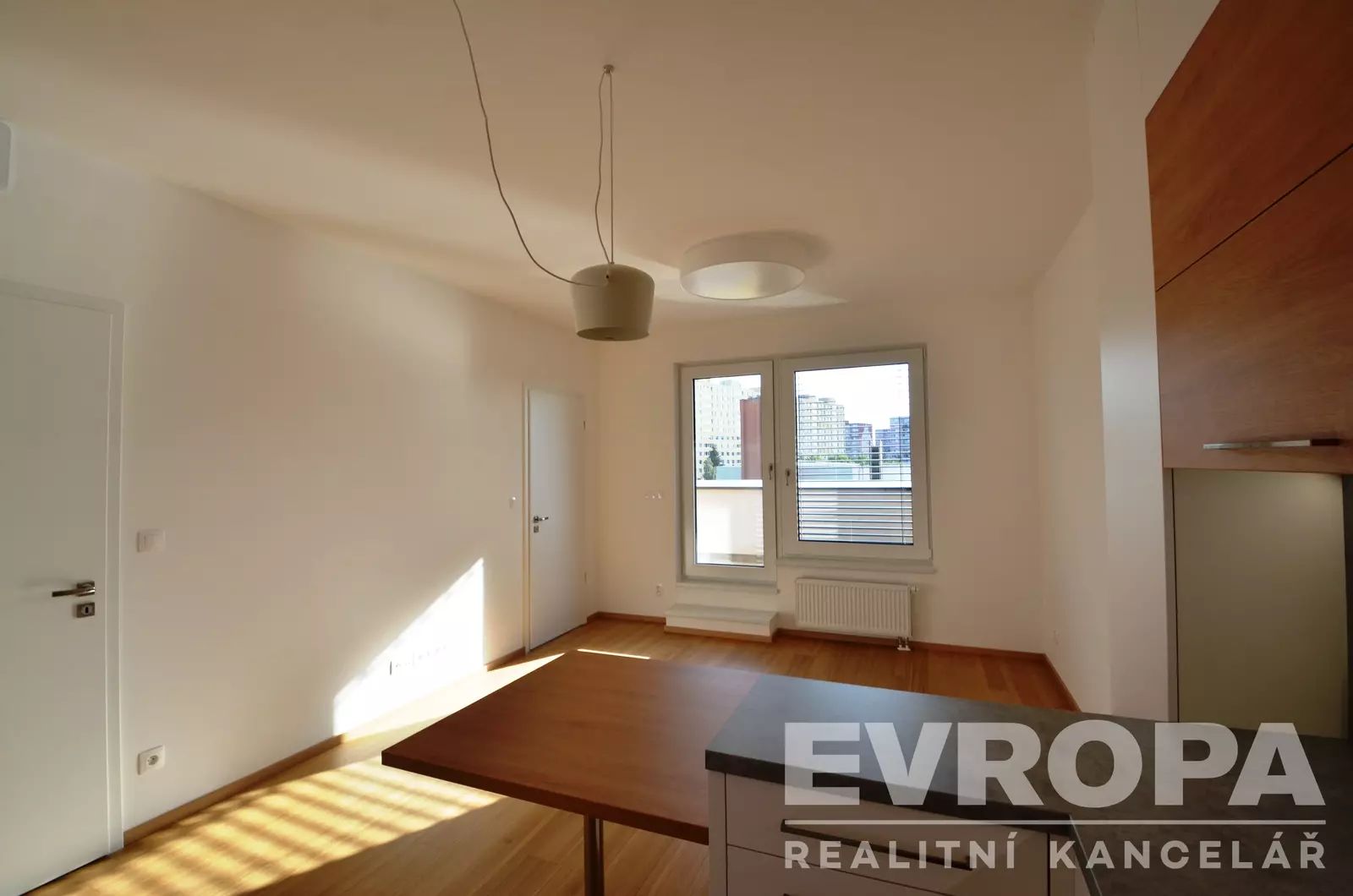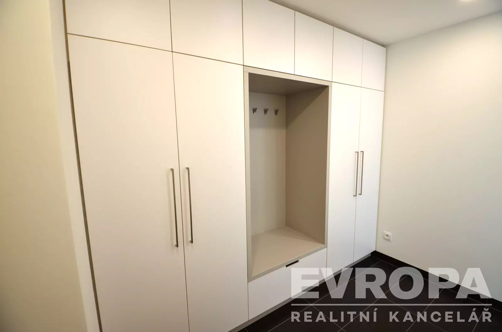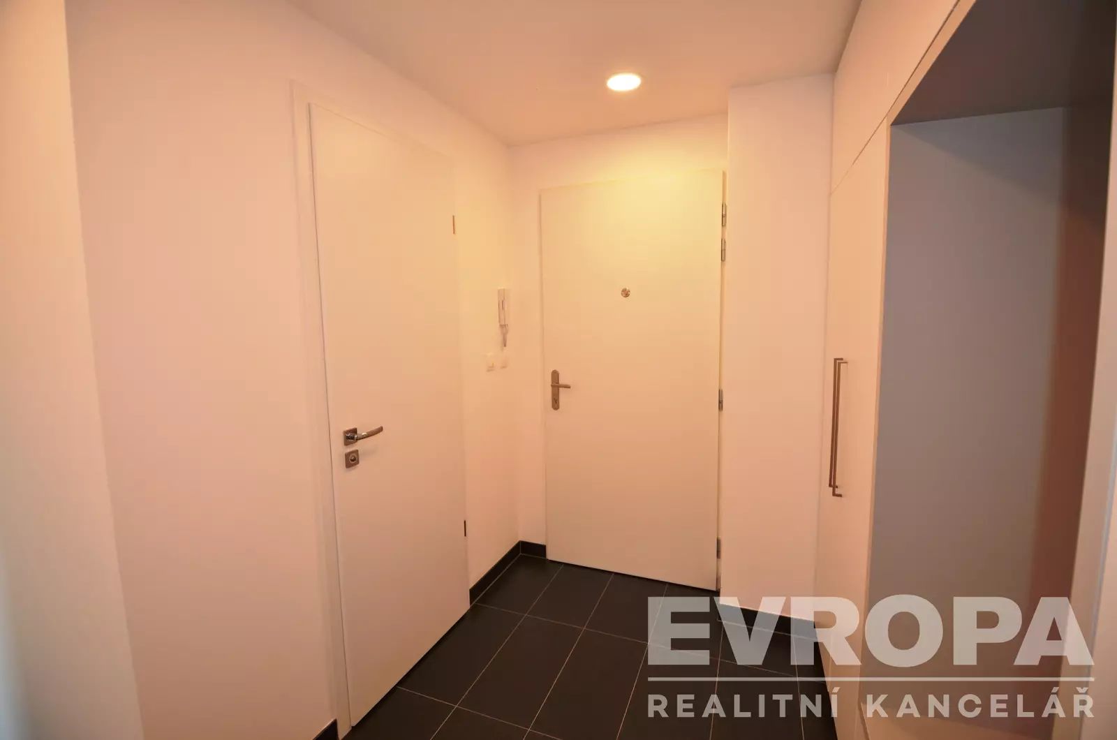 Pronájem bytu 2+kk s podlahovou plochou 50m2, balkonem 5m2 a sklepem 2m2 v osobním vlastnictví ve 4.patře sedmipatrového pasivního domu s výtahem. Dispozice bytu je řešena vstupem do předsíně (chodby), která disponuje prostornou na míru vestavěnou skříní, vlevo se vstupem do koupelny s podlahovým topením, sprchovým koutem a toaletou. Dále vstup do světlého obývacího pokoje s kuchyňským koutem a vstupem na prostornou terasu. Součástí moderní linky je sklokeramická deska, horkovz. trouba, lednice, mrazák a myčka. Z obývacího pokoje vlevo vstup opět do světlého pokoje (ložnice) s praktickou velkou šatní skříní. Izolační trojskla oken v ložnici a obývacím pokoji jsou směrována na jihozápad a osazena elektrickými venkovními žaluziemi. Byt je vybaven moderními materiály, dřevěné podlahy, koupelna s předsíní dlažba.