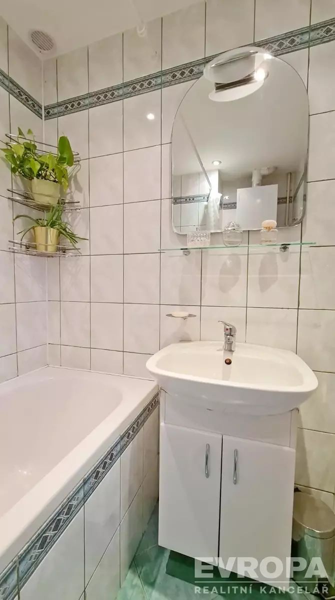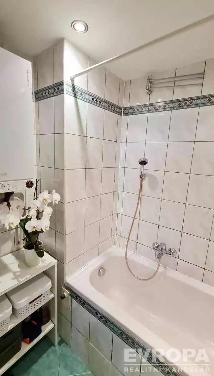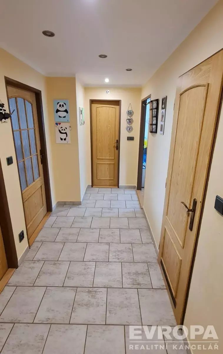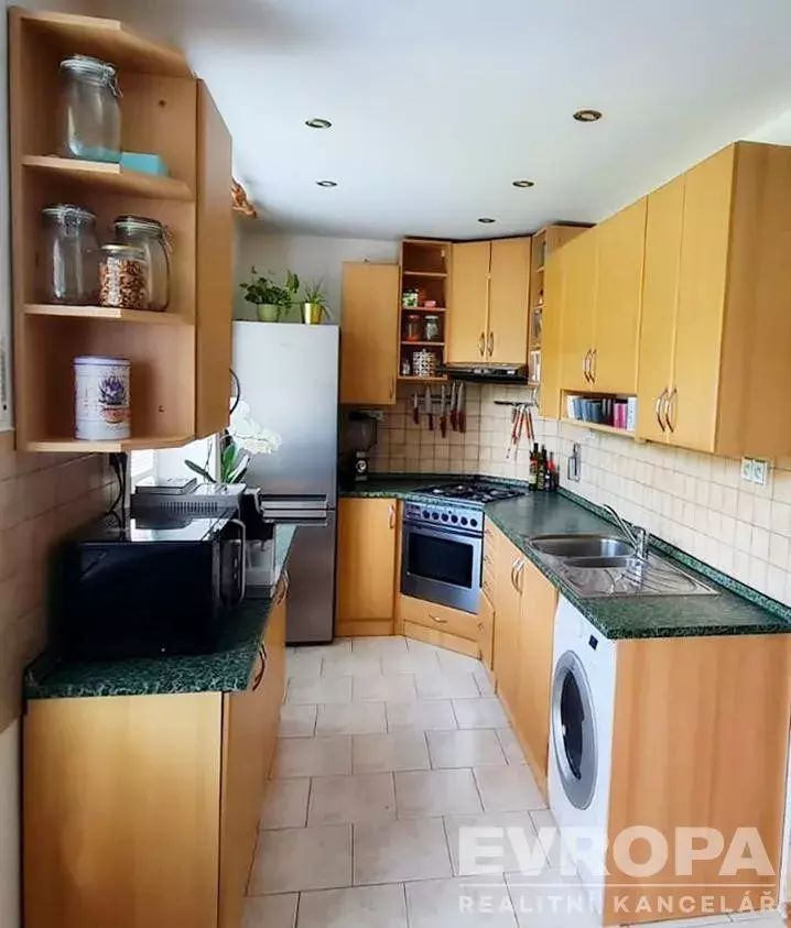 Kuchyň s linkou na míru a vestavnými spotřebiči navazuje na velkou jídelnu, která může sloužit i jako obývací místnost. Vstup do dvou neprůchozích pokojů je z velké předsíně. V jednom z pokojů je přístup na balkon. Z centrální předsíně se vchází i do koupelny s vanou a umyvadlem, kde je zavěšený plynový kotel sloužící k ohřevu vody i vytápění. Toaleta je samostatná. Velkou výhodou bytu je komora s vestavnou skříní a policemi. K bytu náleží také 2 sklepy o rozloze cca 30 m2. Při rekonstrukci bylo zbudováno zděné jádro, nové rozvody elektřiny v mědi, rozvody vody v plastu, na podlahy položena dlažba a laminát, původní okna byla nahrazena plastovými a vyměněny i nové interiérové a vstupní dveře. Byt se prodává nezařízený.