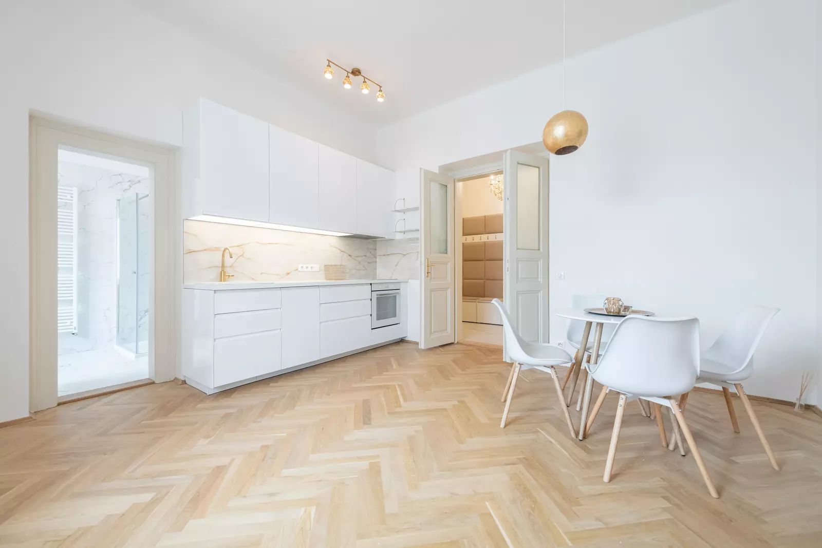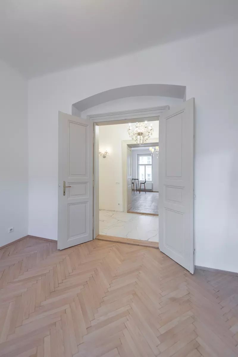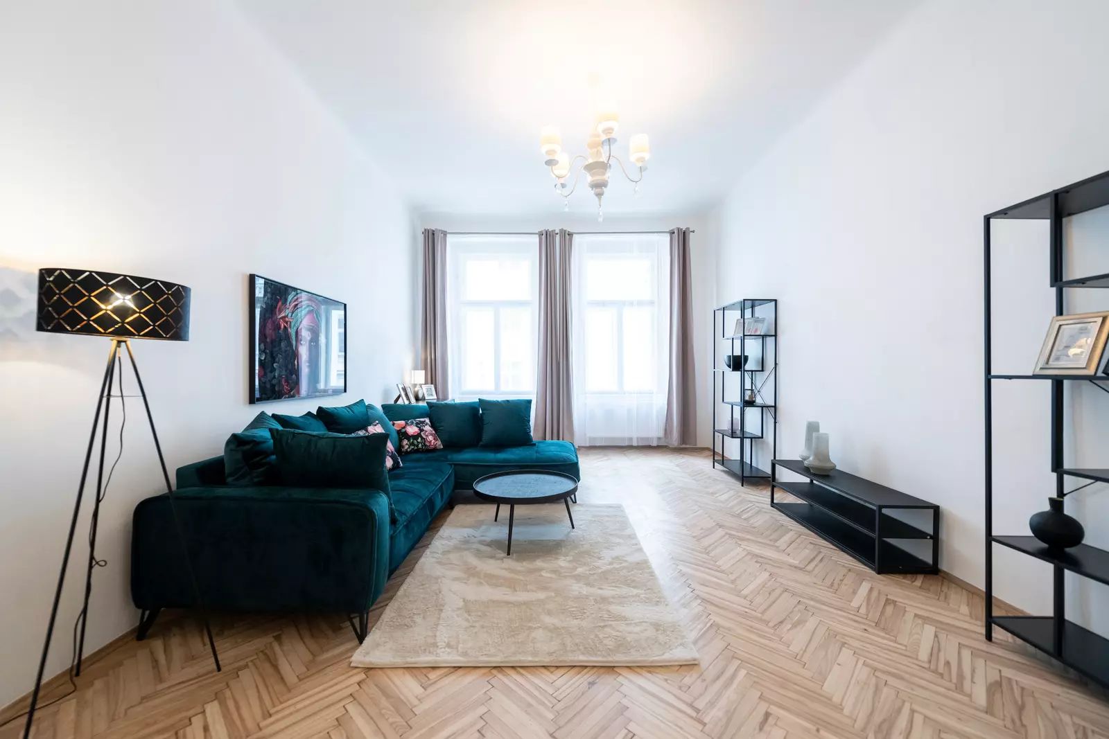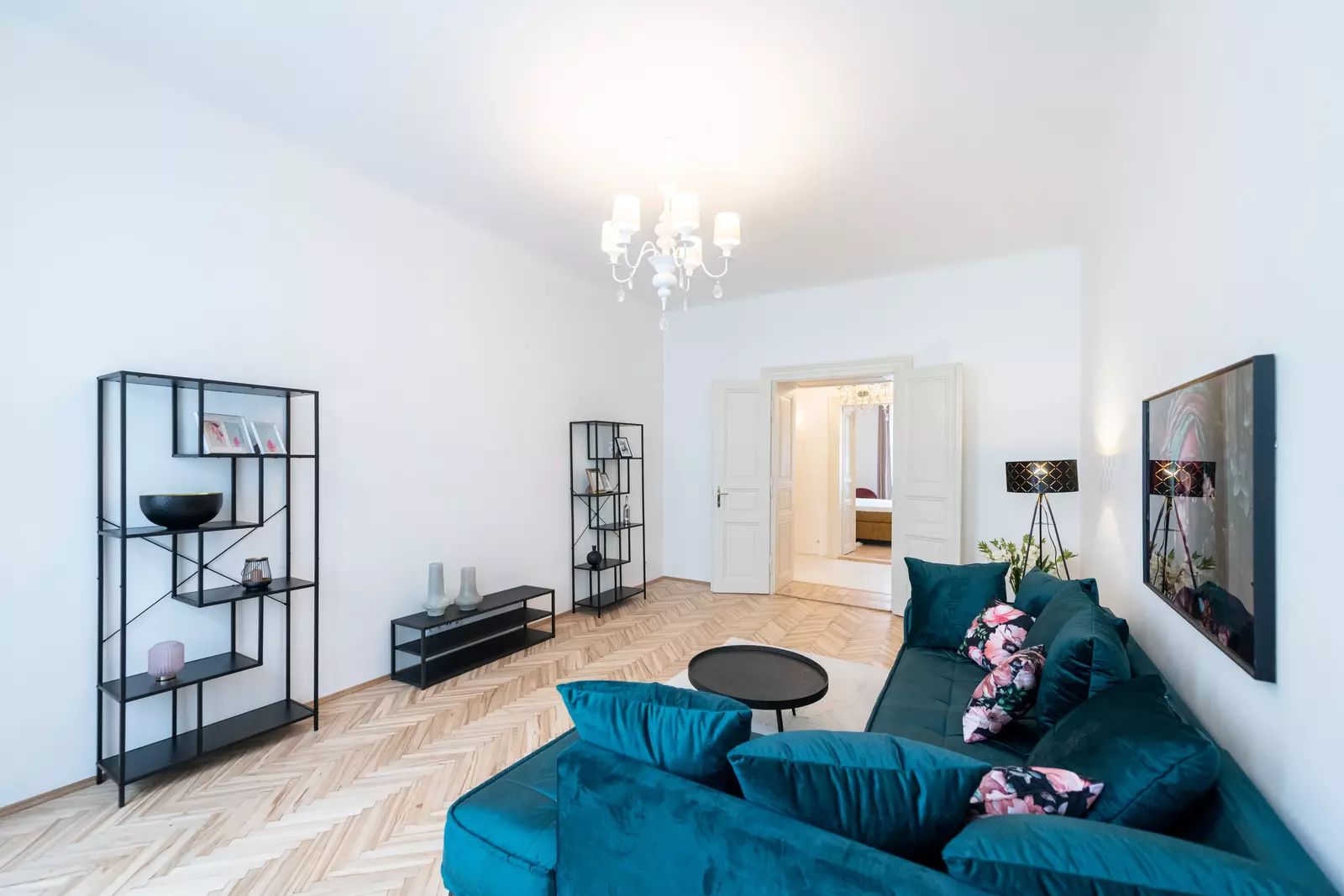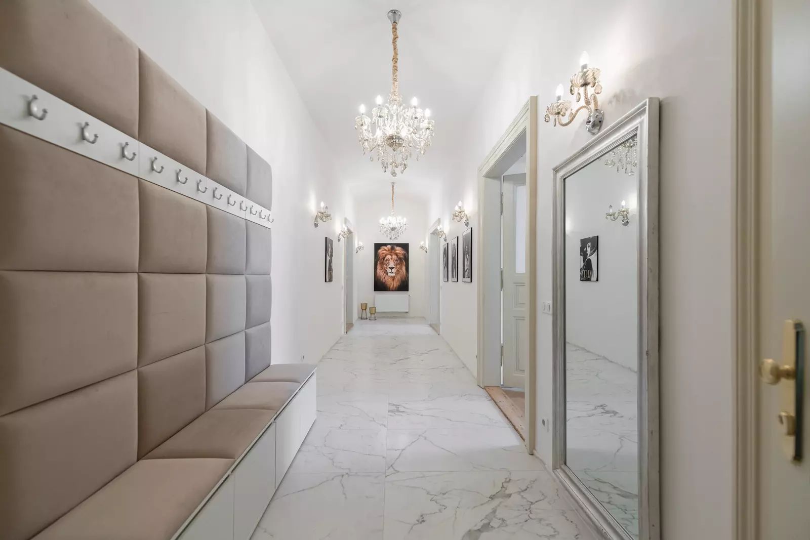 Kompletní rekonstrukce bytu dala vyniknout kráse původních architektonických prvků jako jsou dvoukřídlé interiérové dveře, parkety, velká špaletová okna a ostatní dobové doplňky. Velkoformátová dlažba z italského bílého mramoru, křišťálové lustry a nádherné vstupní dveře podtrhují výjimečnost a krásu tohoto bytu. Teplo a ohřev vody zajišťuje nový plynový kotel. V celém bytě je zavedena kabelová, internetová a telefonní síť.  Zcela nová je elektroinstalace, koupelna, WC a rozvod topení. Byt má zcela nově zařízený interiér s moderní kuchyní.