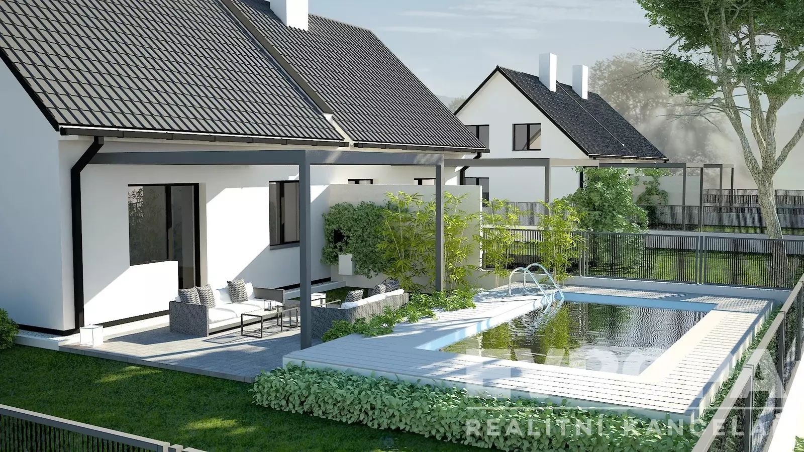 Nabízíme jednopodlažní moderní dům s obytným podkrovím, v přízemí se nachází zádveří se skladem a šatnou, následuje chodba, kterou se vchází do obytného prostoru s kuchyňským koutem, vstupem do pokoje a na terasu. V přízemí se dále nachází první z koupelen, lze ji vybavit i sprchovým koutem, přípojkami na pračku a umístit zde kotel. Do prvního patra vede zděné schodiště, kde najdete 3 ložnice se střešními okny a hlavní koupelnu. Pozemek kolem domu zajistí pohodlné parkování i dvou automobilů, za domem je terasa a menší pozemek vhodný k zatravnění, výsadbě okrasných rostli nebo umístění bazénu.