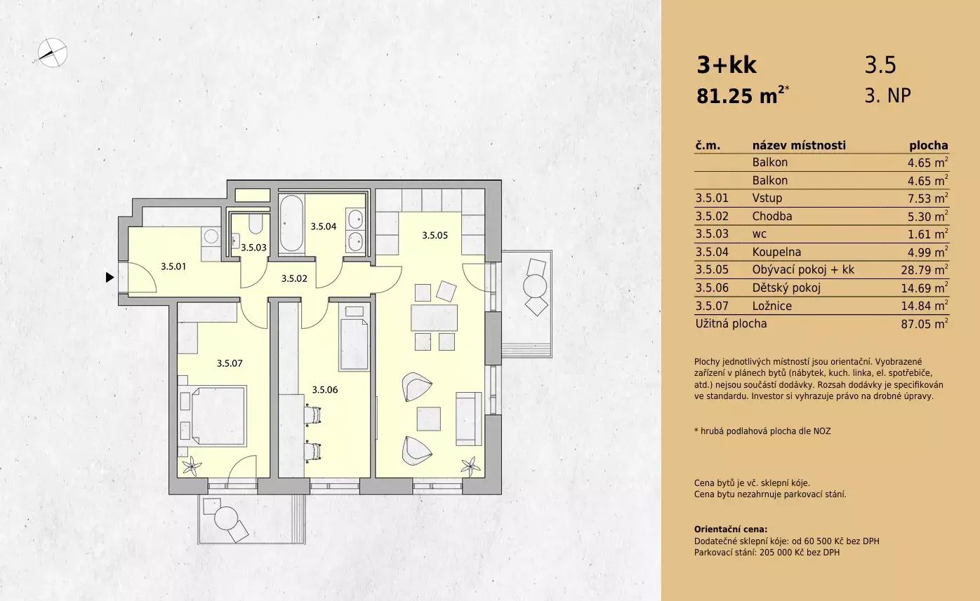 Nabízíme Vám prodej bytu 3+kk o celkové výměře 87,05 m2, včetně dvou balkónů o velikosti 4,65 m2, který se nachází v 3.NP bytového domu s názvem Rezidence Na Bradle.