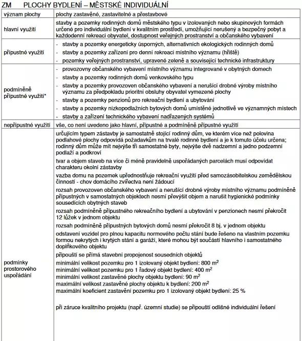 Podle platného územního plánu je parcela zařazena do zóny městského individuálního bydlení, což umožňuje výstavbu rodinného domu městského typu. Zajímavostí této lokality je povolení výstavby domů s terasovitým členěním střech, případně s plochou či pultovou střechou.