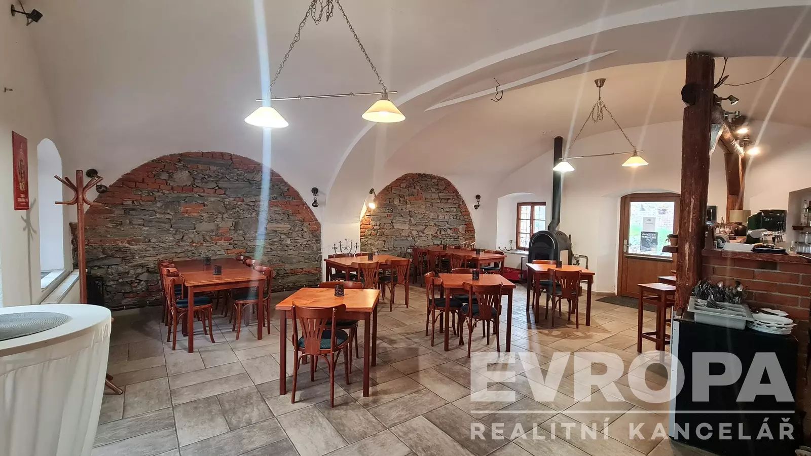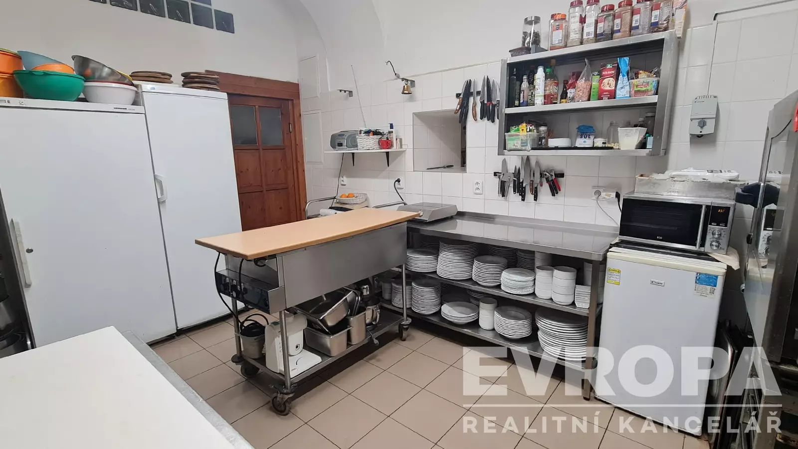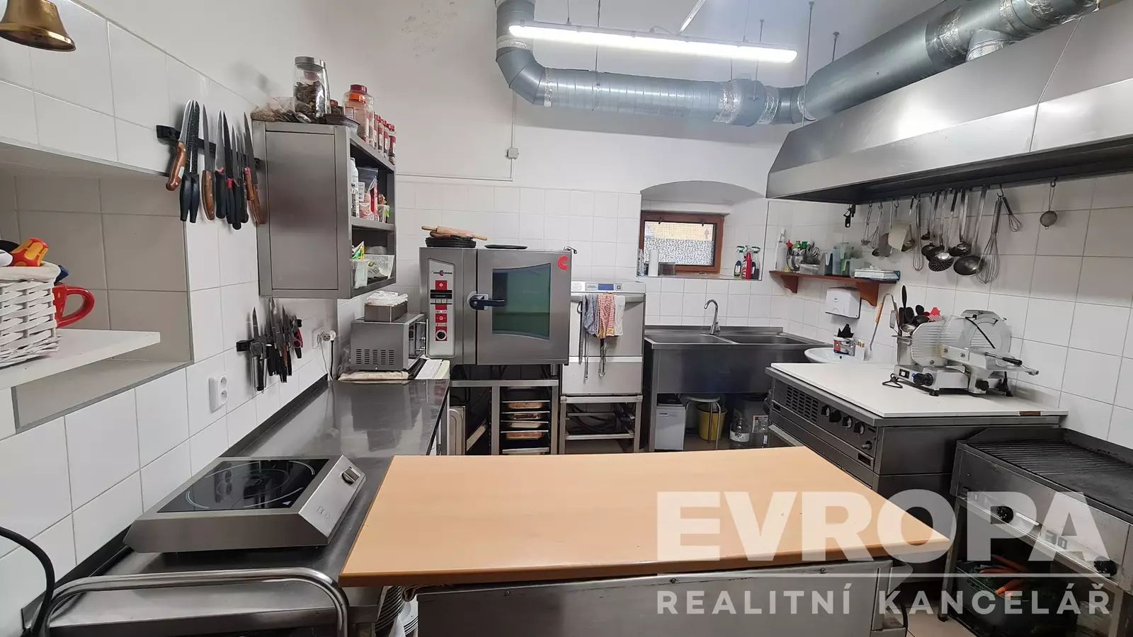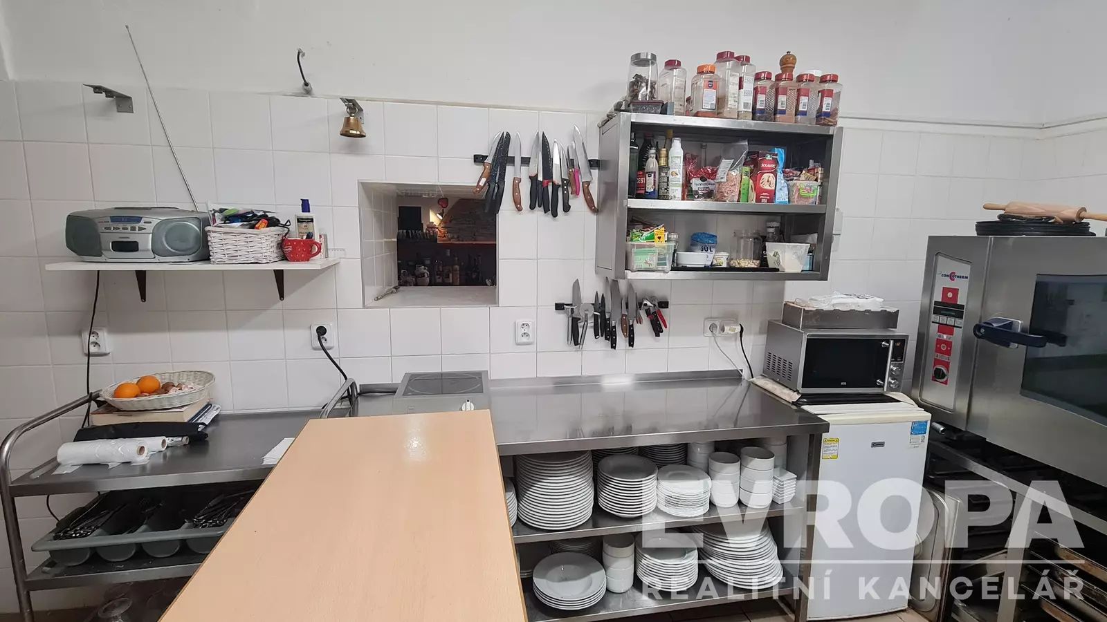 Stylová restaurace s klenbami se nabízí s kompletně zařízeným interiérem a částečně vybavenou kuchyní, kde se připravuje denní menu, speciality i minutky.