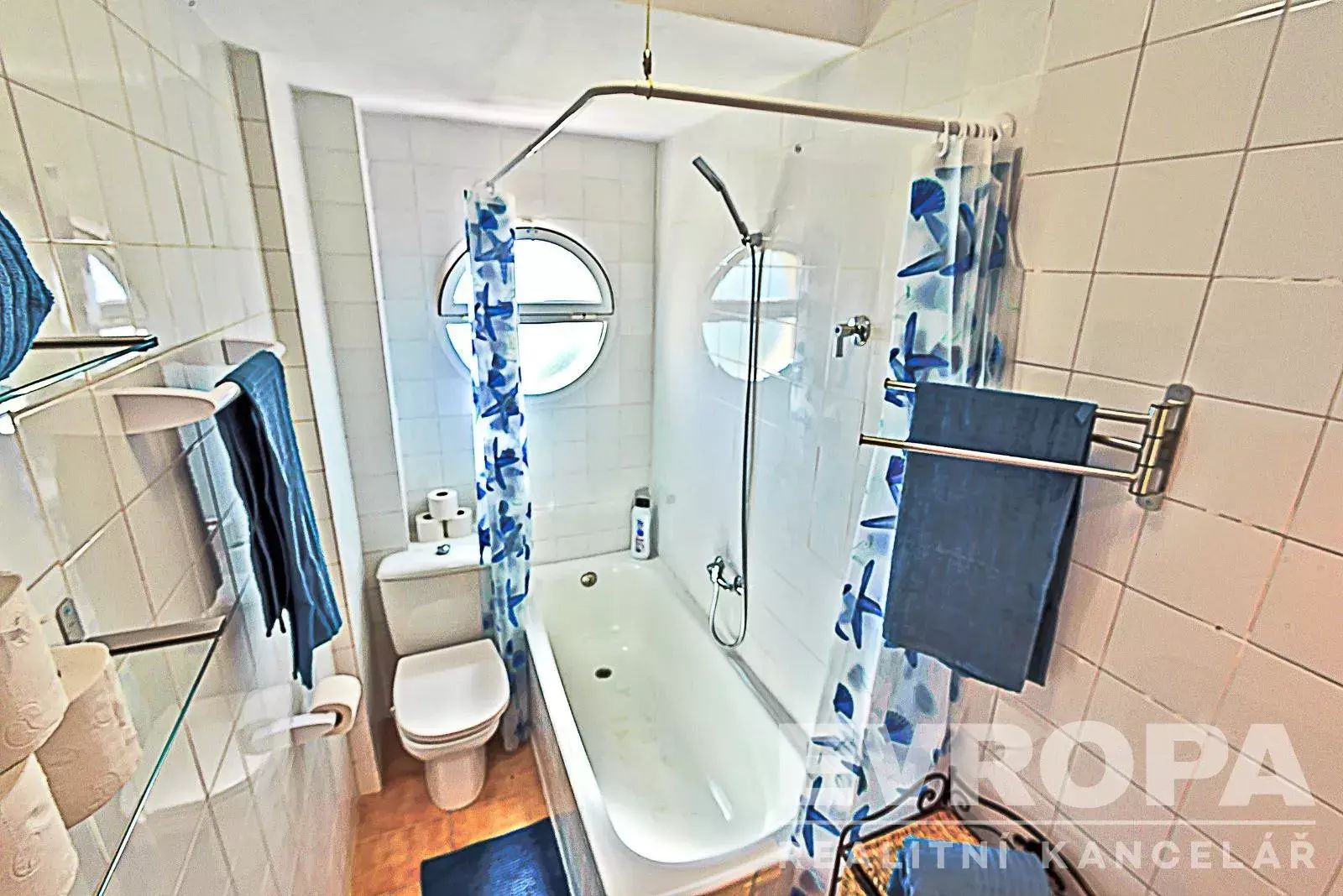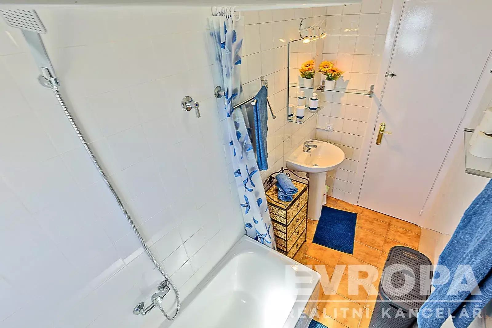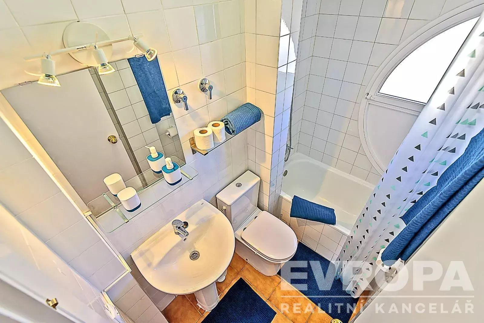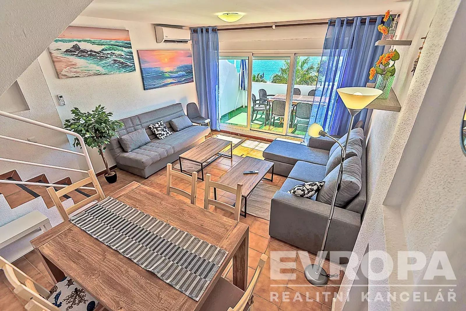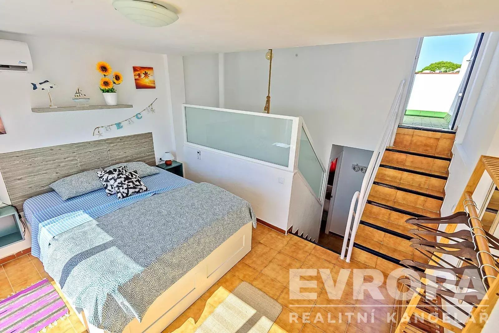 Privilegovaná poloha na pobřeží s panoramatickým výhledem na moře a nádhernými západy slunce z pohodlí vašeho domova. Dům disponuje dvěma ložnicemi s vlastní koupelnou, obývacím pokojem s přístupem na terasu, samostatnou kuchyní, koupelnou pro hosty a komoru pro uložení vašich věcí. Samozřejmostí je klimatizace ve všech pokojích. Dům dále nabízí tři terasy (celkem 17 m2), dvě s přímým výhledem na pláž a moře. Budete tak mít další prostor pro venkovní radovánky, ať už při opalování, nebo při venkovních večeřích s přáteli a rodinou. Dům nabízí i dvě parkovací stání.