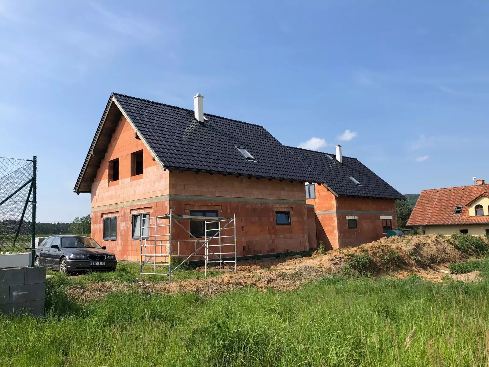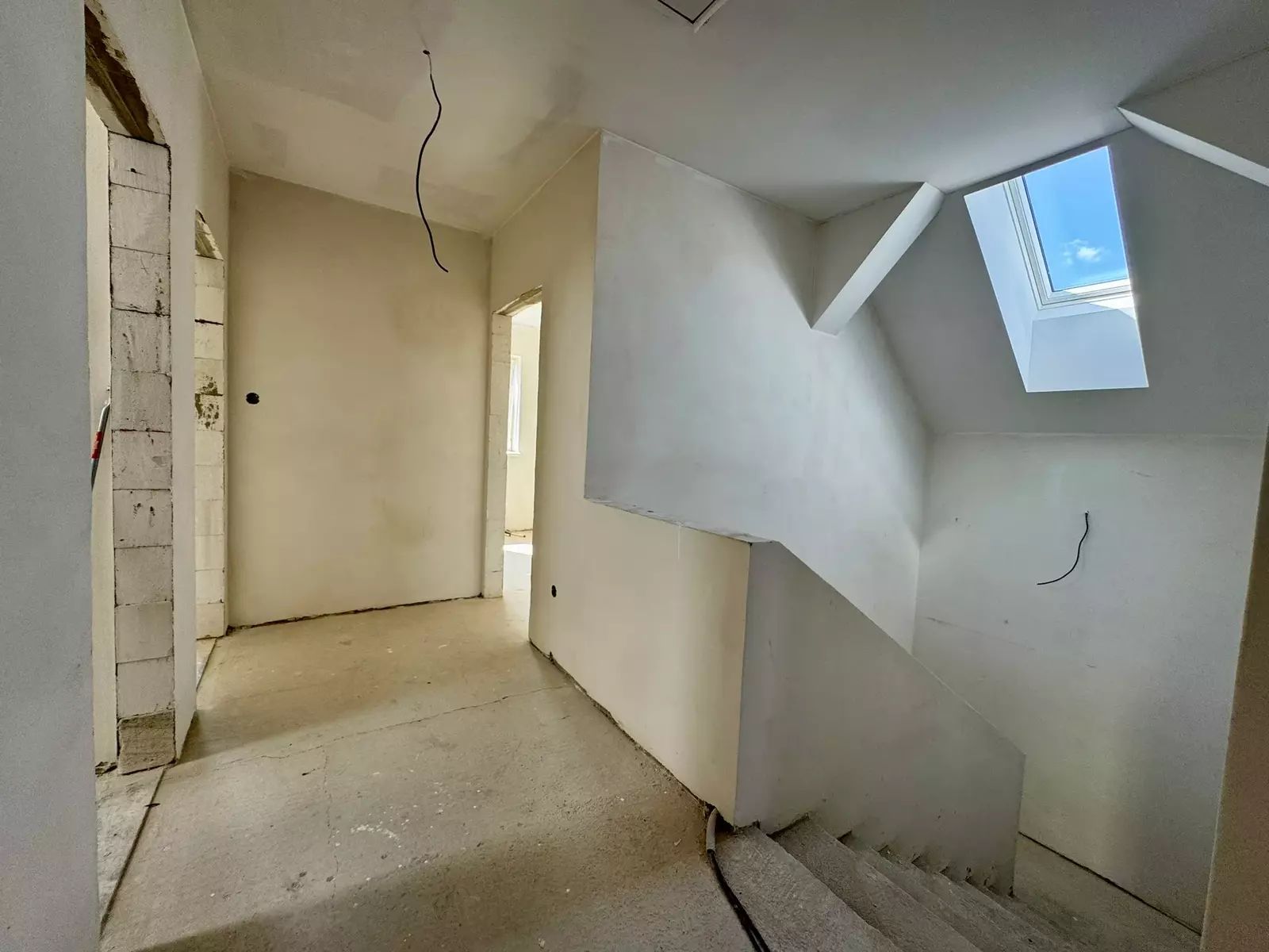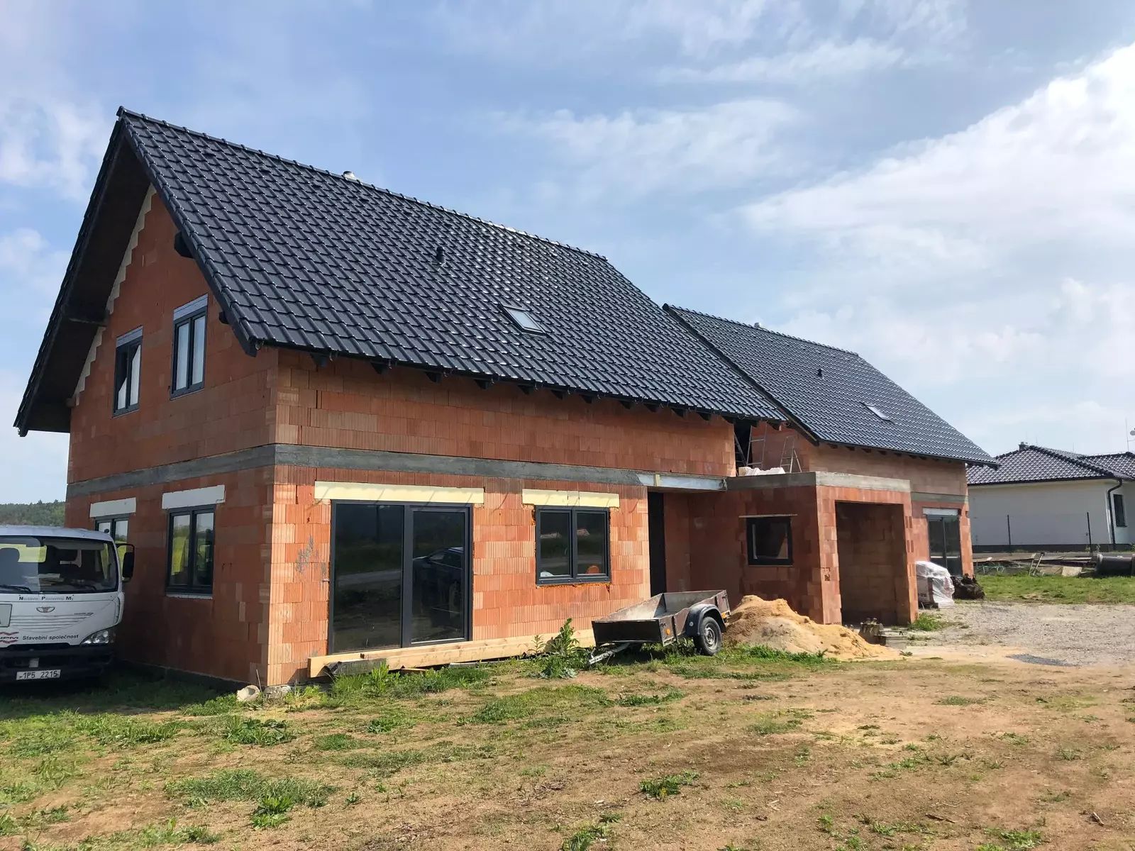 Dům je ve fázi uzavřené hrubé stavby – hotové schodiště, sádrokartonové podhledy v 2. NP, zateplení stropů a dispoziční řešení.