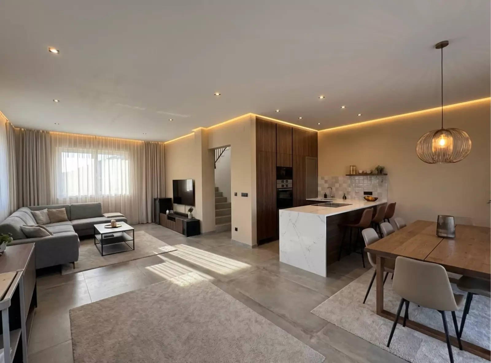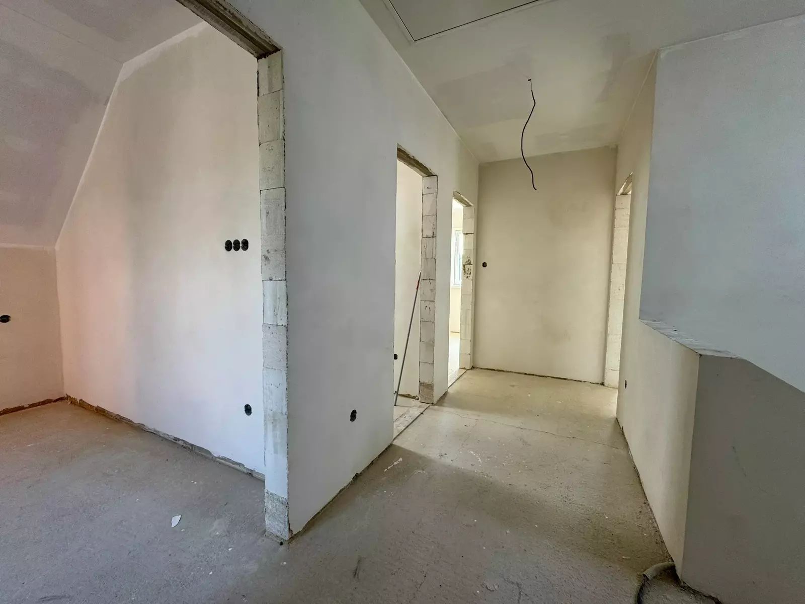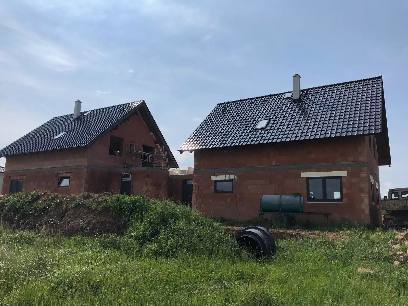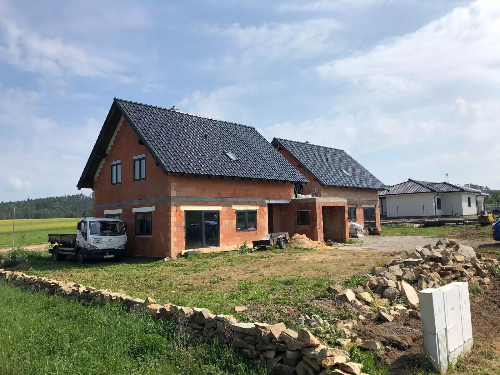 Dům je ve fázi uzavřené hrubé stavby – hotové schodiště, sádrokartonové podhledy v 2. NP, zateplení stropů a dispoziční řešení.