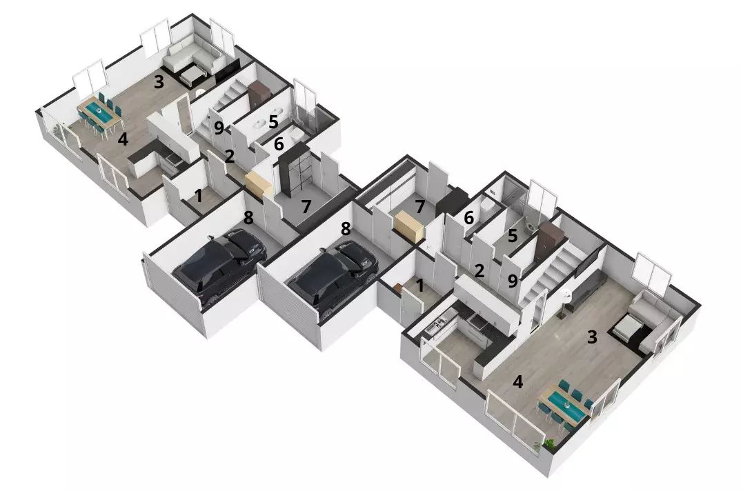 1.NP – obývací pokoj s kuchyní, spíž, koupelna, samostatné WC, technická místnost, předsíň, garáž se vstupem do domu.