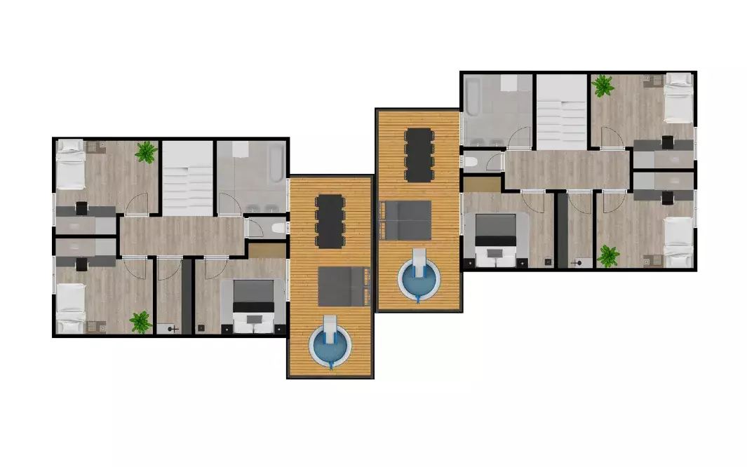 2.NP – ložnice, 2 pokoje, koupelna, WC, šatna, chodba, terasa.